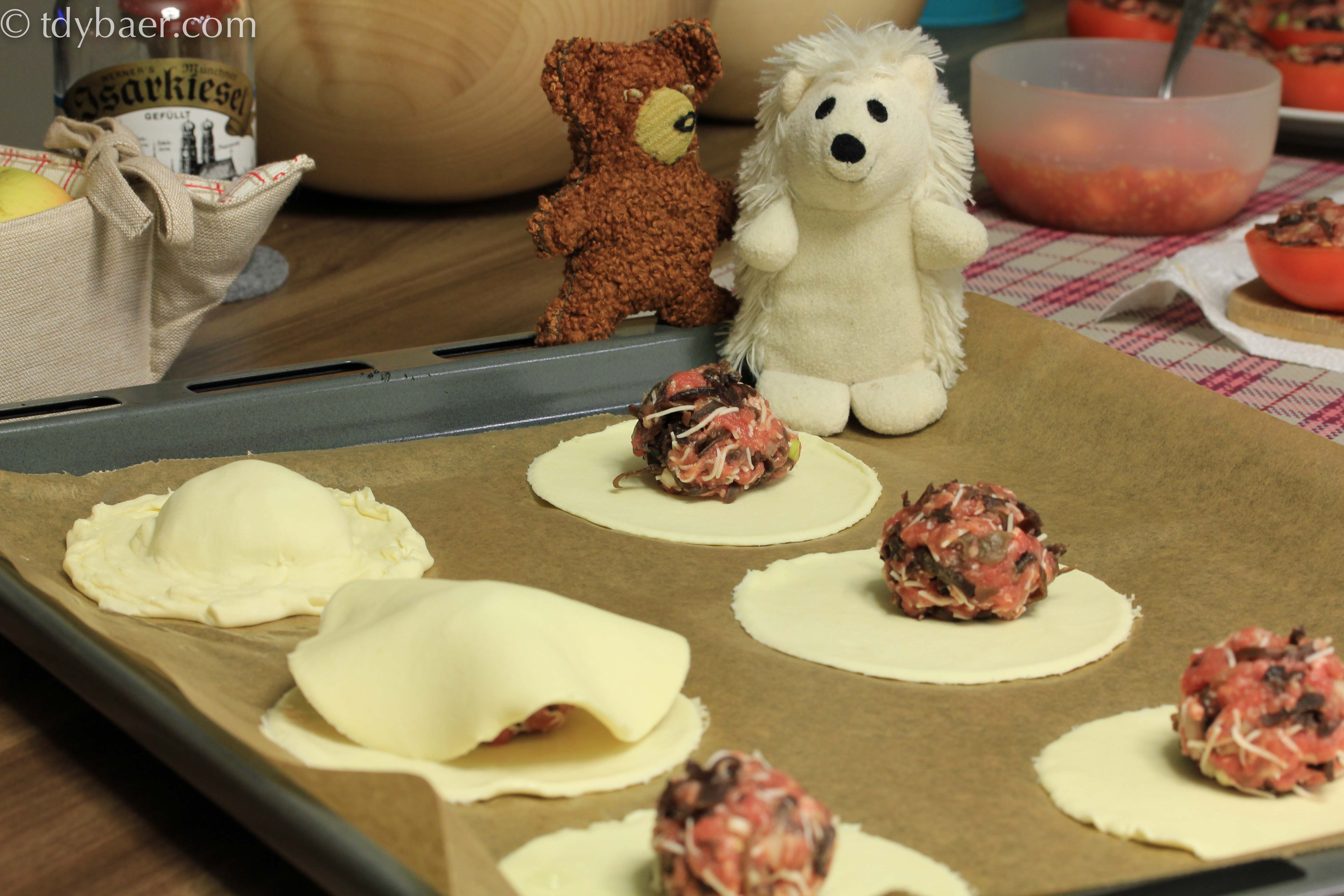 Aus den Blätterteigblättern sticht man nun am Besten mit einer großen Tasse oder Schüssel die Kreise heraus und legt sie auf ein Backblech mit Backpapier. Das Hackfleisch in golfballgroße Kugeln formen und jeweils eine auf einen Teigkreis legen.