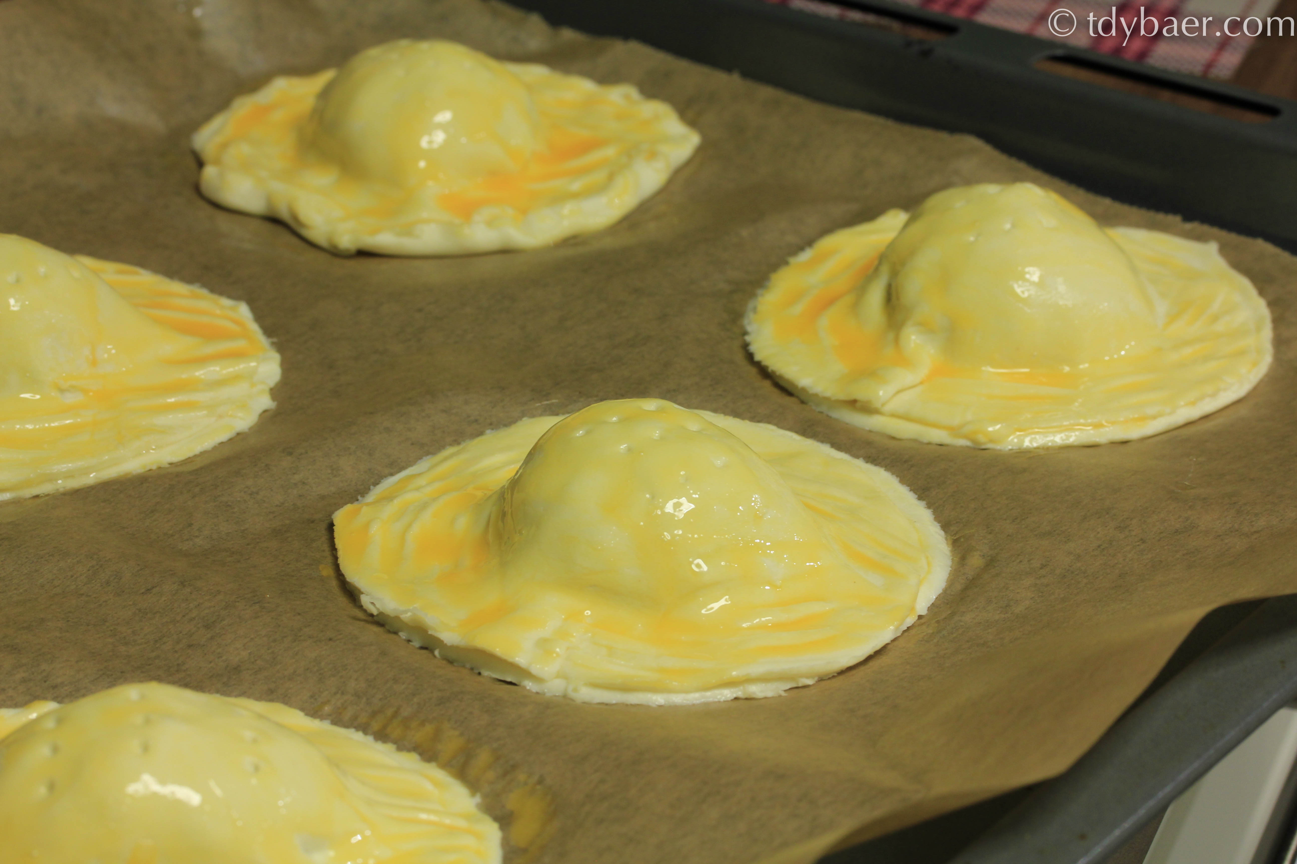 Der äußere Rand wird nun mit Eiweiß eingepinselt. Obendrauf kommt jetzt wieder ein Teigblatt, das mit einer Gabel den Rand entlang auf das untere Teigblatt gedrückt wird. Alles klar? 🙂 Anschließend wird es noch liebelvoll mit Eigelb eingepinselt :-). Das sieht dann etwas so aus: