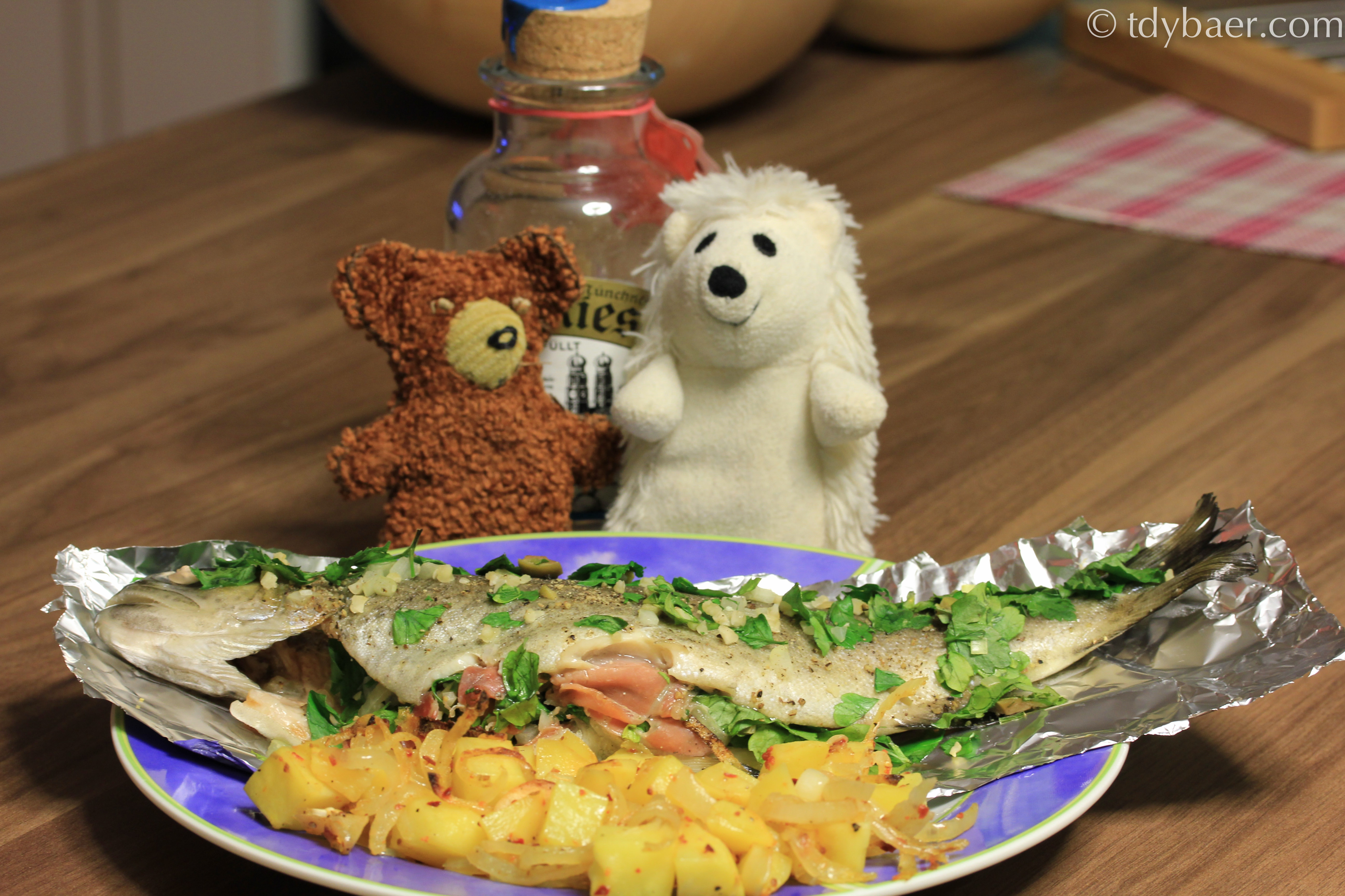 Wenn ihr nicht wie ich vergessen habt vorher Olivenöl auf die Folie zu machen, könnt ihr die leckere Forelle sicher auch ohne Folie auf den Teller tun :-).