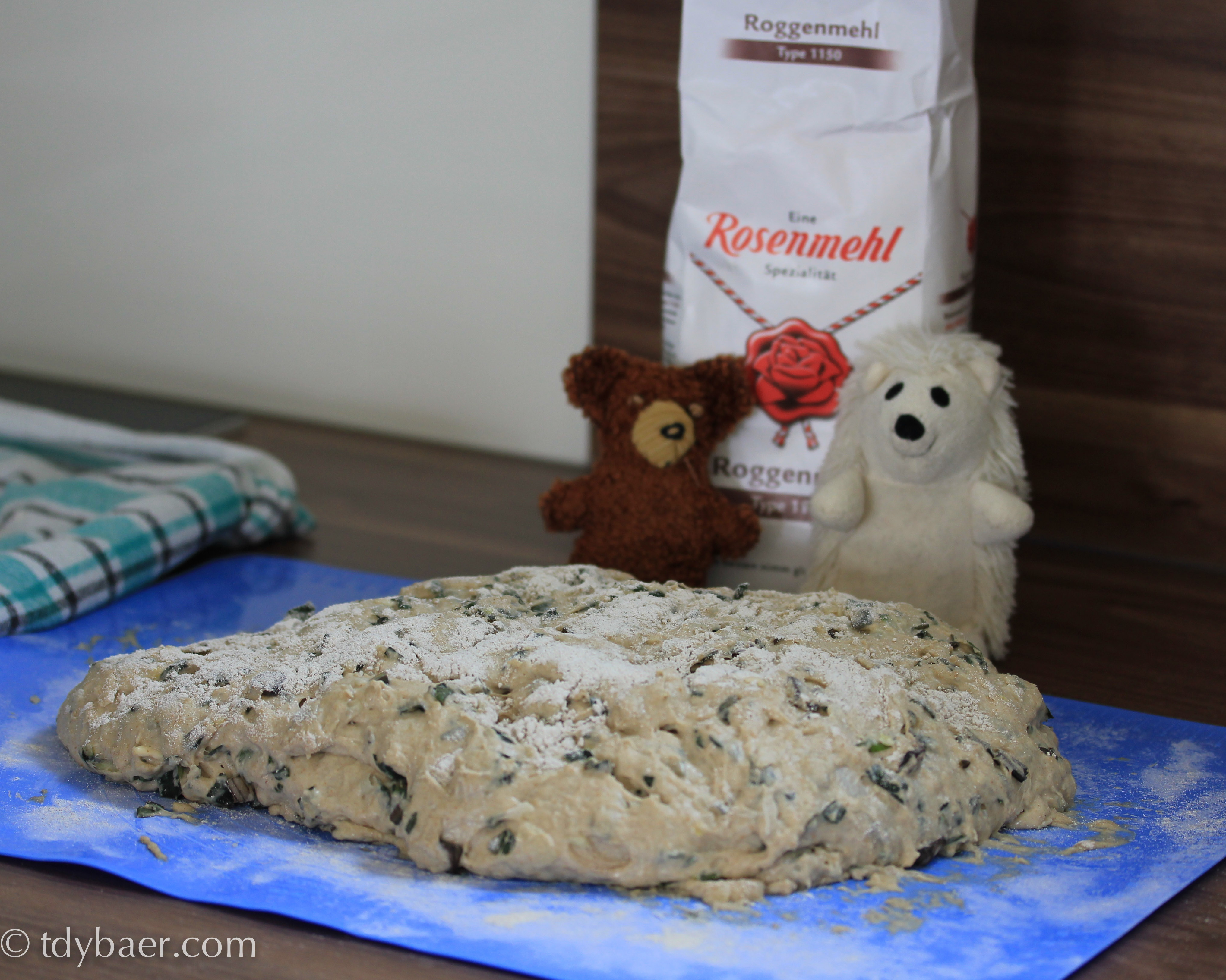 Bevor der Teig in den Ofen kommt, muss er noch einmal eine halbe Stunde ruhen. In der Zeit kann man schon einmal den Backofen auf 230° Ober-/Unterhitze vorheizen und ein mit Wasser benetztes Blech mit erhitzen.