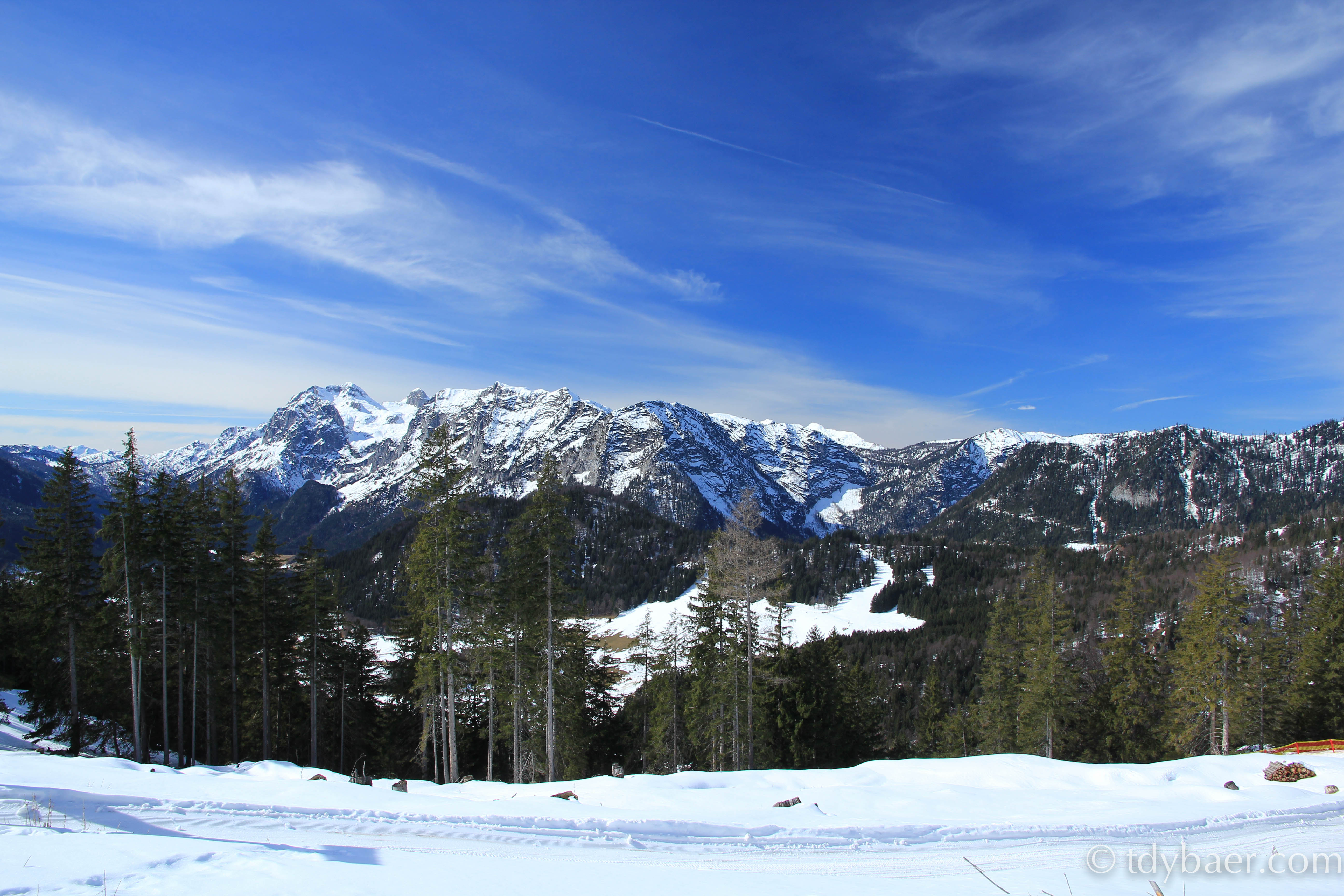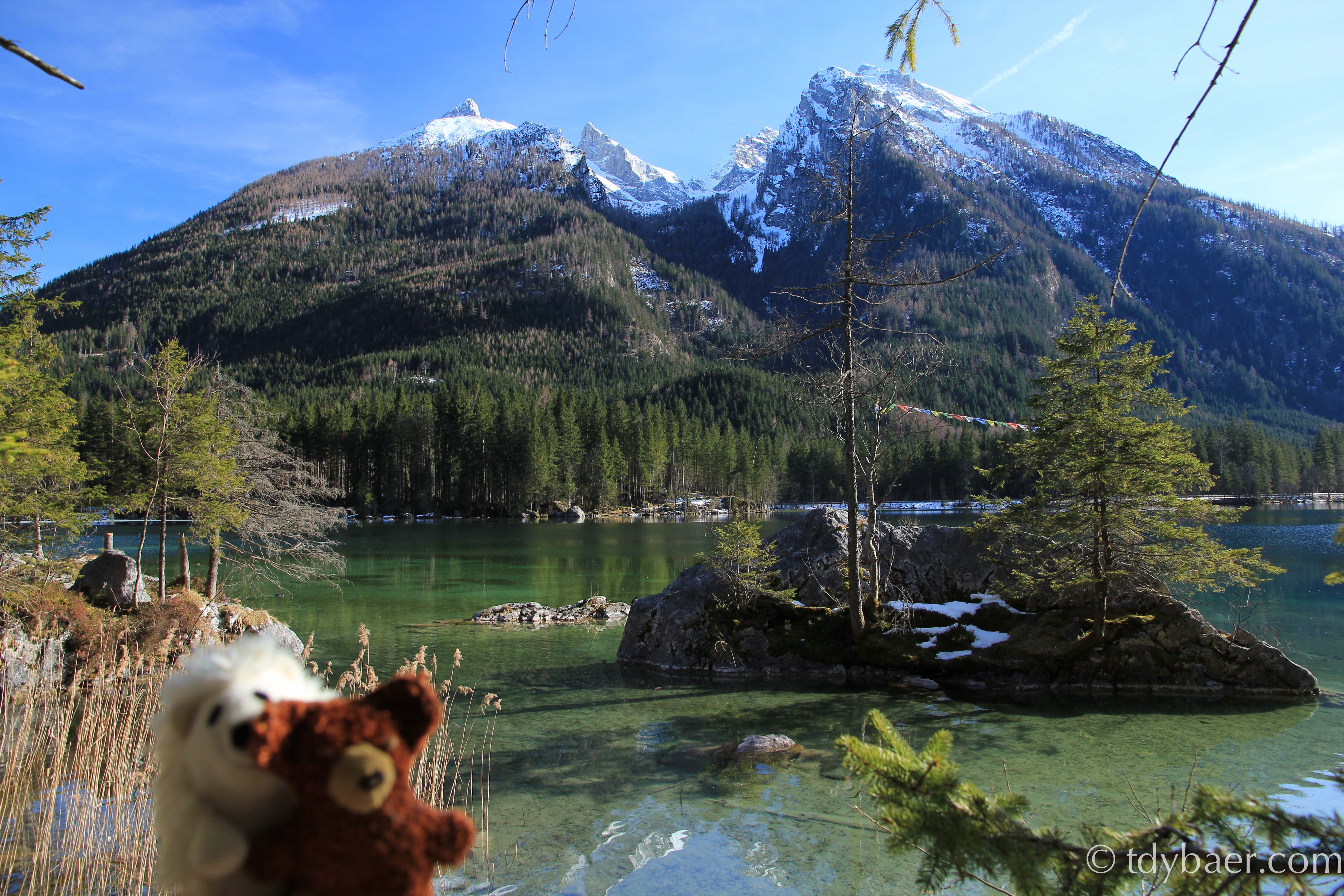 Unten angekommen, machten wir uns auf den Weg zum 6km entfernten Hintersee. Da es noch weit außerhalb der Hochsaison ist, waren wir hier fast alleine unterwegs. Die noch etwas mit Schnee bedeckten Gipfel und der grünlich schimmernde See sind echt ein Traum. Man fühlt sich hier wie im Märchenwald. Aber seht selbst: