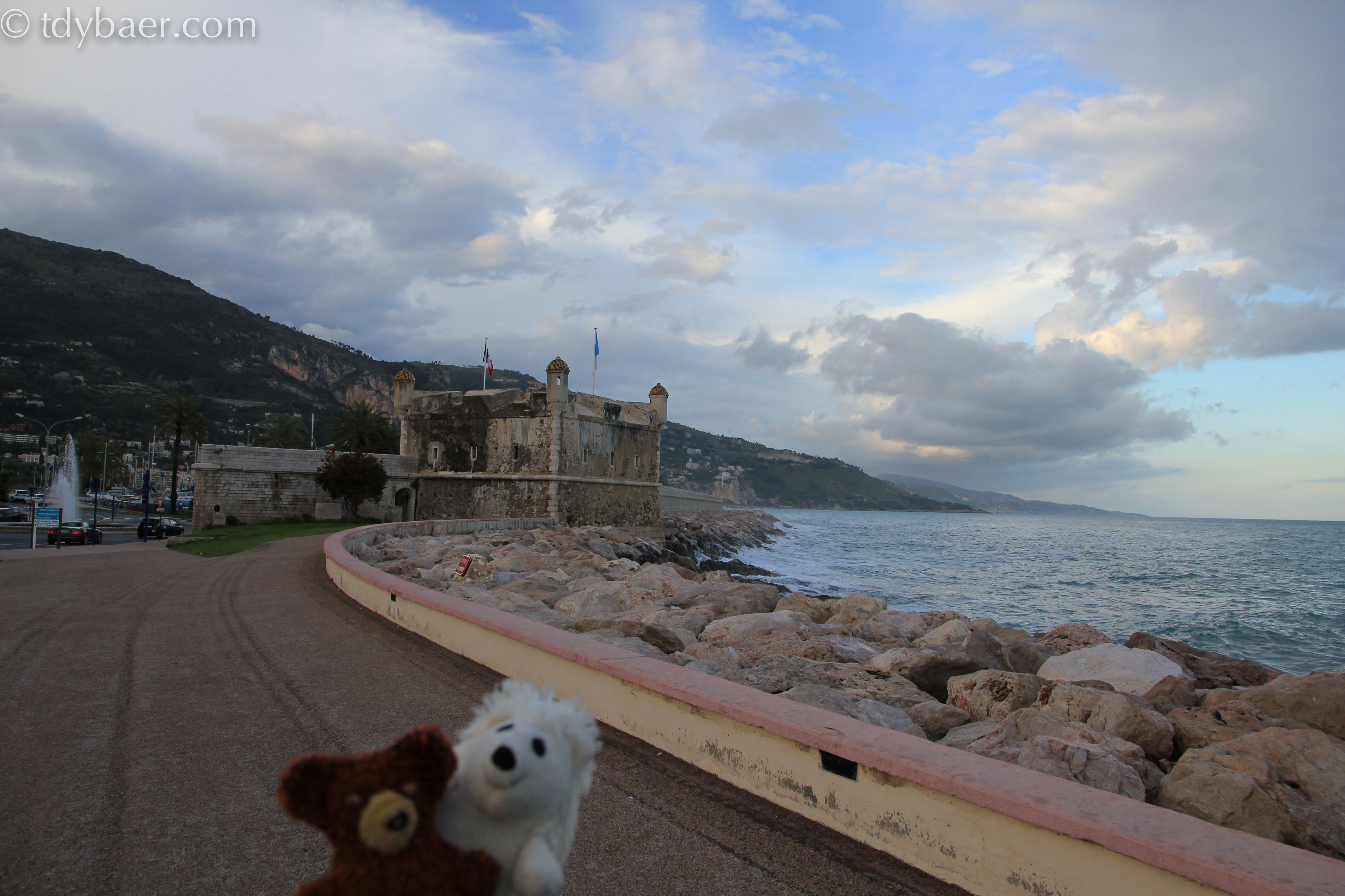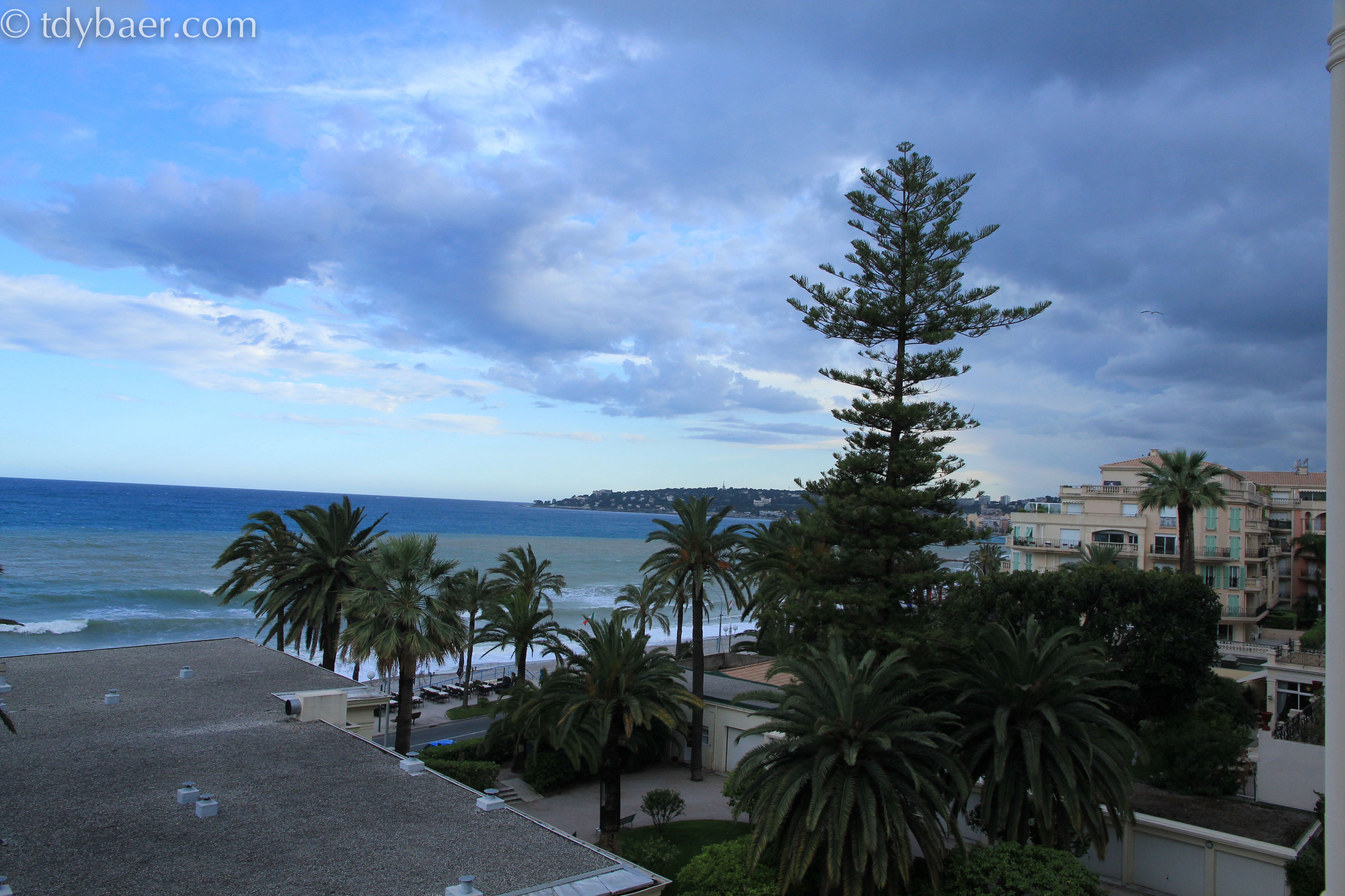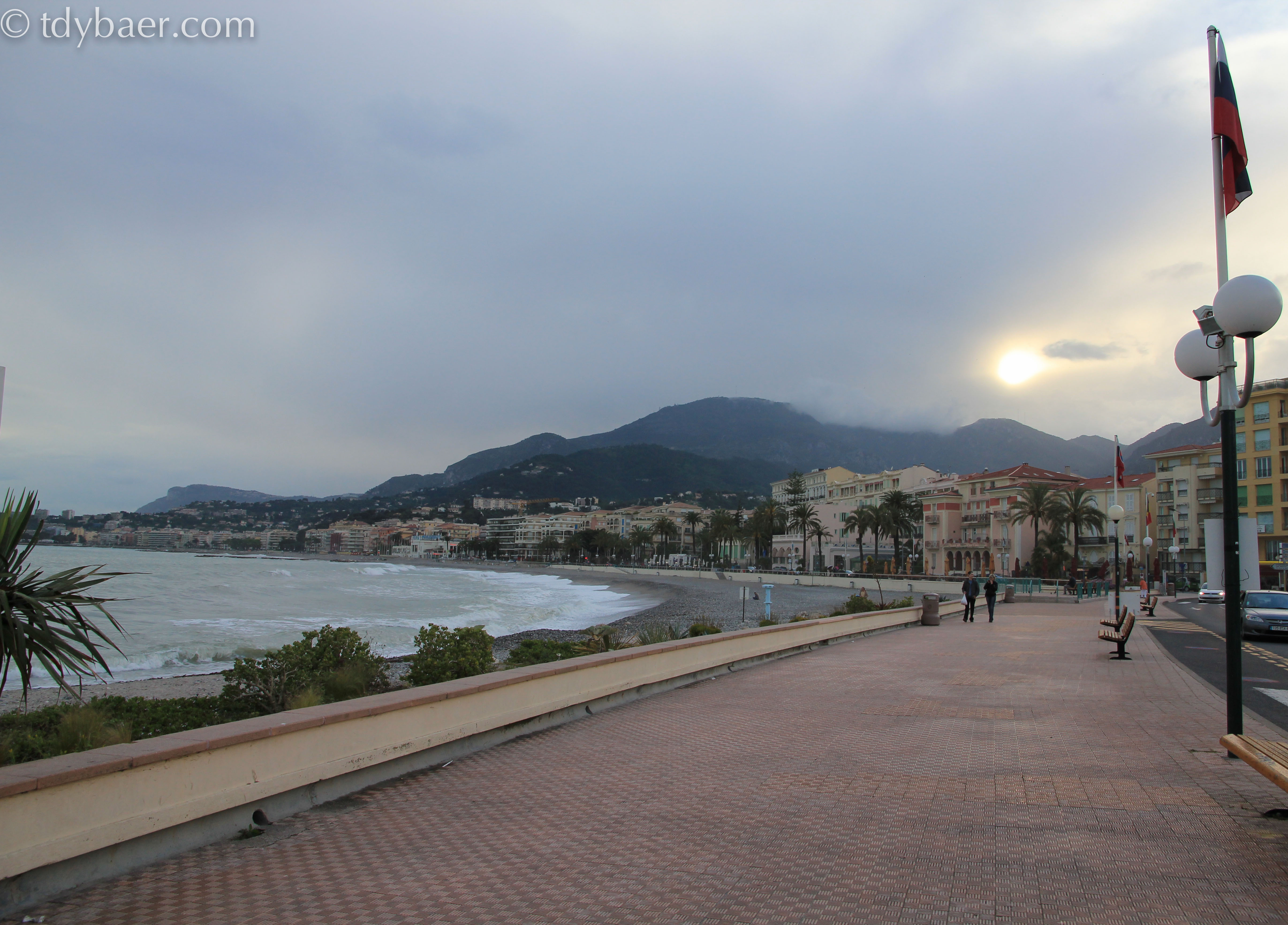 Also schauten wir mal auf den Plan für morgen und gestalteten alles etwas um. Da es in Richtung Küste nach schönerem Wetter aussah, beschlossen wir in die nächst größere Stadt am Wasser zu fahren: Menton. Von Sospel aus fuhren wir auf der landschaftlich sehr schönen D2566 nach Menton. Wie erwarteten hörte der Regen kurz vorher auf. In Menton parkten wir unser Auto in der Innenstadt und betraten gleich das erst beste Hotel, denn es war ja schon kurz vor 19 Uhr. Im Le Balmoral hatten wir die Wahl zwischen Blick aufs Meer oder auf die Straße. Wir wählten folgende Aussicht: