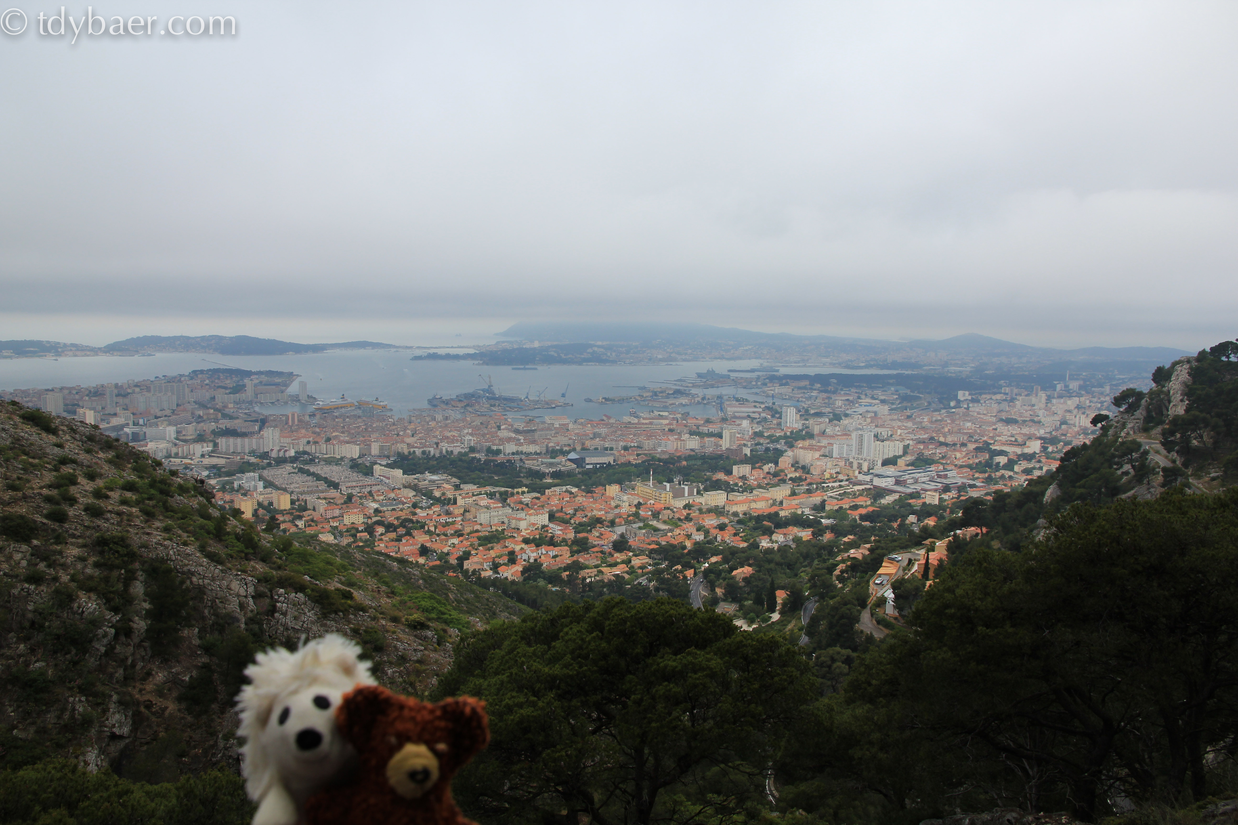 Über eine Einbahnstraße gelangt man auf den 584 m hohen Gipfel. Wer kein Auto hat, kann auch mit der Seilbahn bequem nach oben fahren. Noch sind wir unter den Wolken und man hat einen guten Blick auf Toulon.