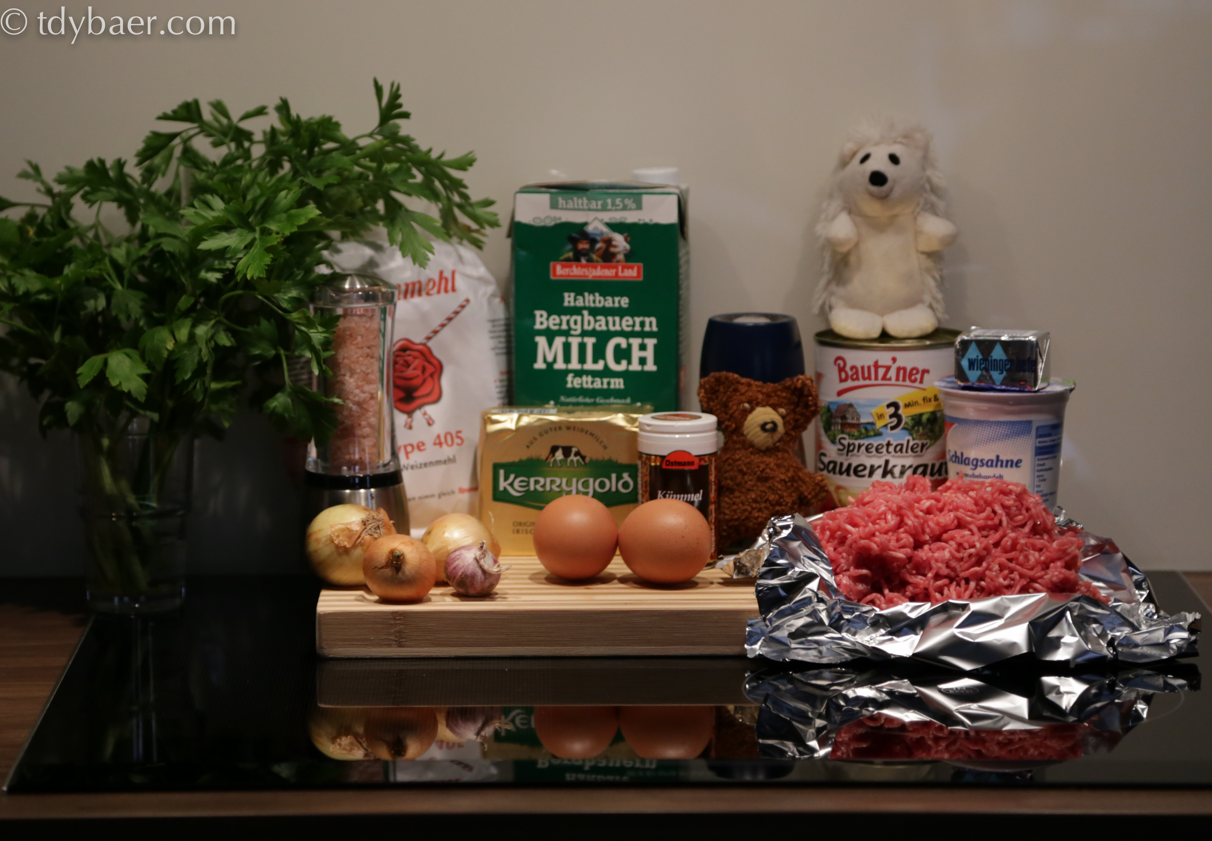 Nun zum Topping :-). In einer Pfanne die Butter erhitzen und die Zwiebeln und den Knoblauch anbraten, bis alles schön duftet. Dann das Hackfleisch dazugeben und mitbraten. Zum Schluss mit Salz, Pfeffer und Kümmel würzig abschmecken.