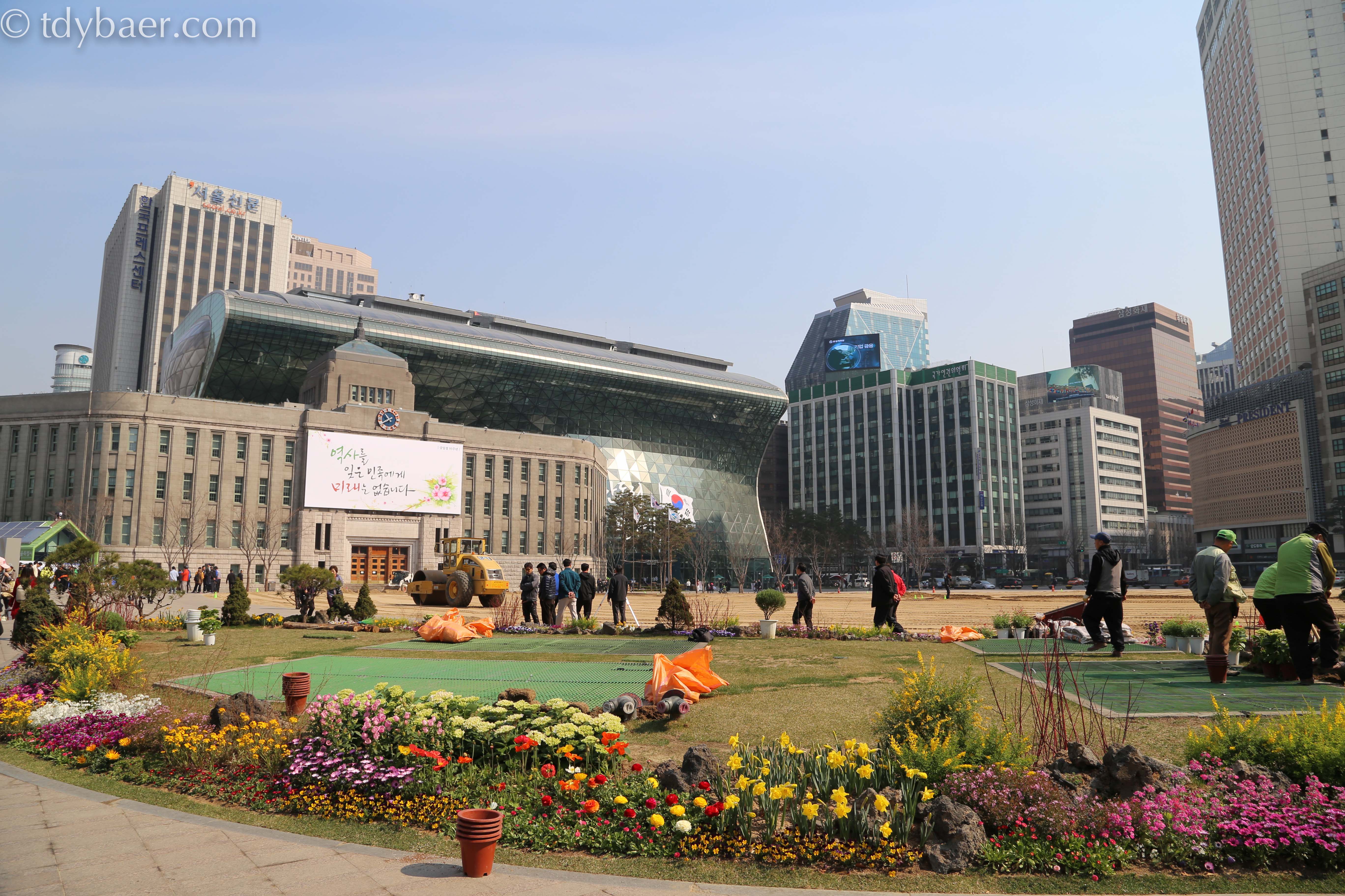 Der Seoul Plaza wird gerade mit hübschen Blümchen und frischem Rasen bestückt – dahinter die City Hall.