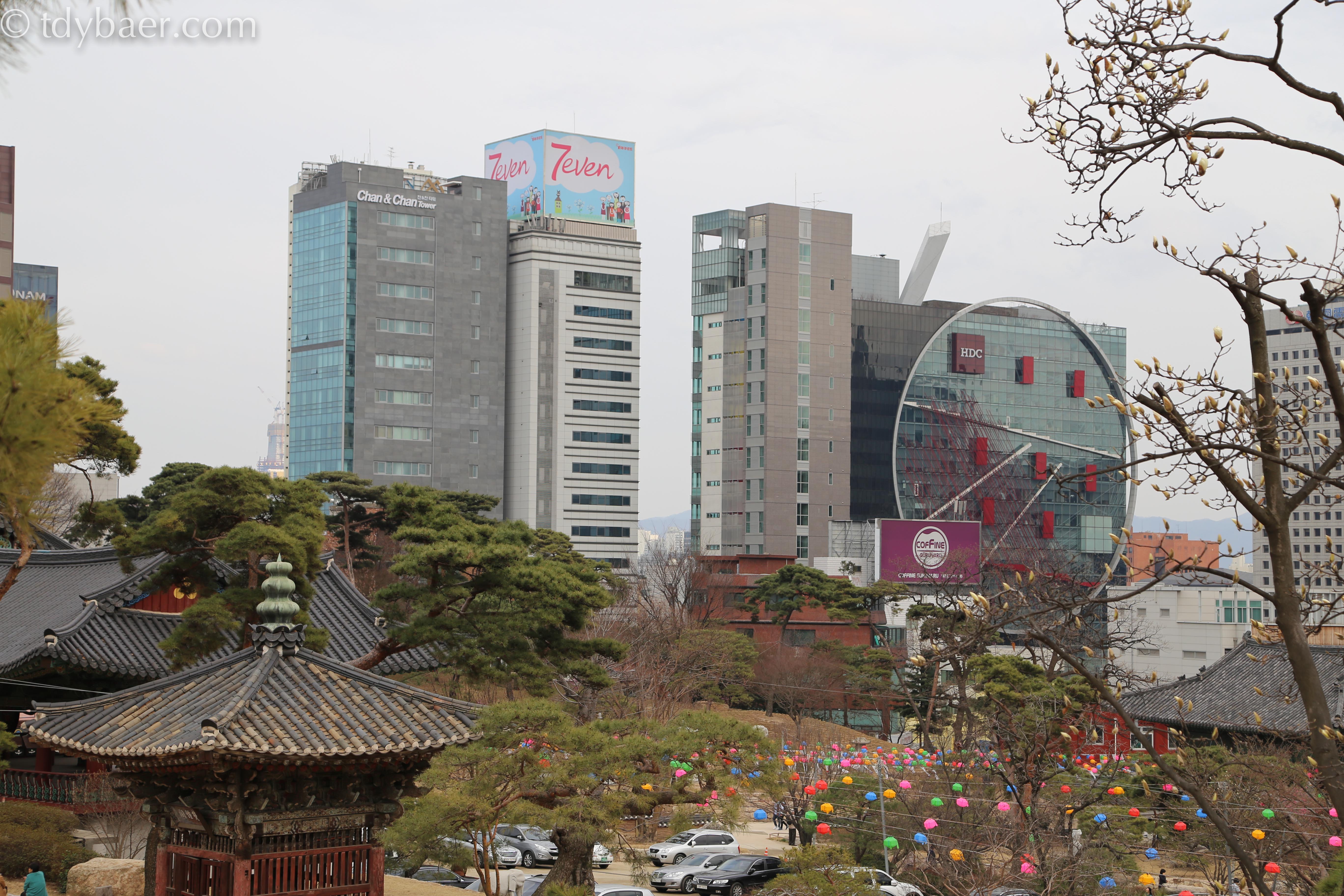 Mittendrin der Bongeunsa Tempel aus dem Jahr 794. Der Buddhistische Tempel war lange Zeit der Größte im Stadtgebiet von Seoul.