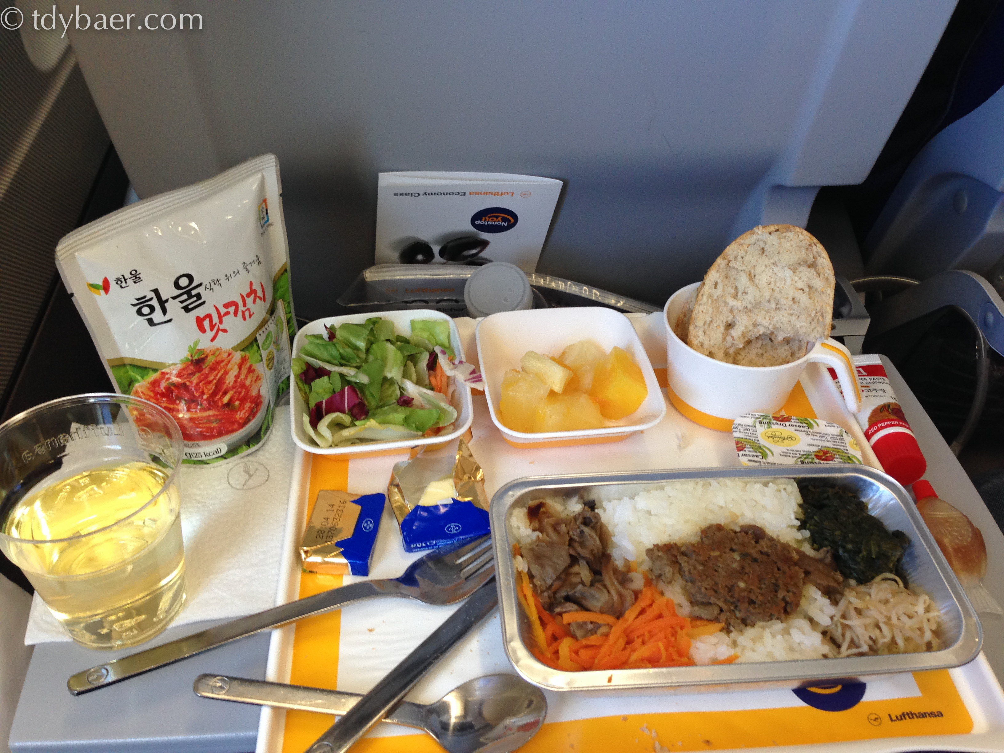 Das Bordessen stimmt schon mal auf den Urlaub ein. Neben dem etwas undefinierbaren Hauptgang mit Reis, gab es leckeren Kimchi aus der Tüte. In der Regel handelt es sich dabei um Chinakohl der mit allerlei Zeug über eine längere Zeit eingelegt wird und dabei zu gären beginnt.