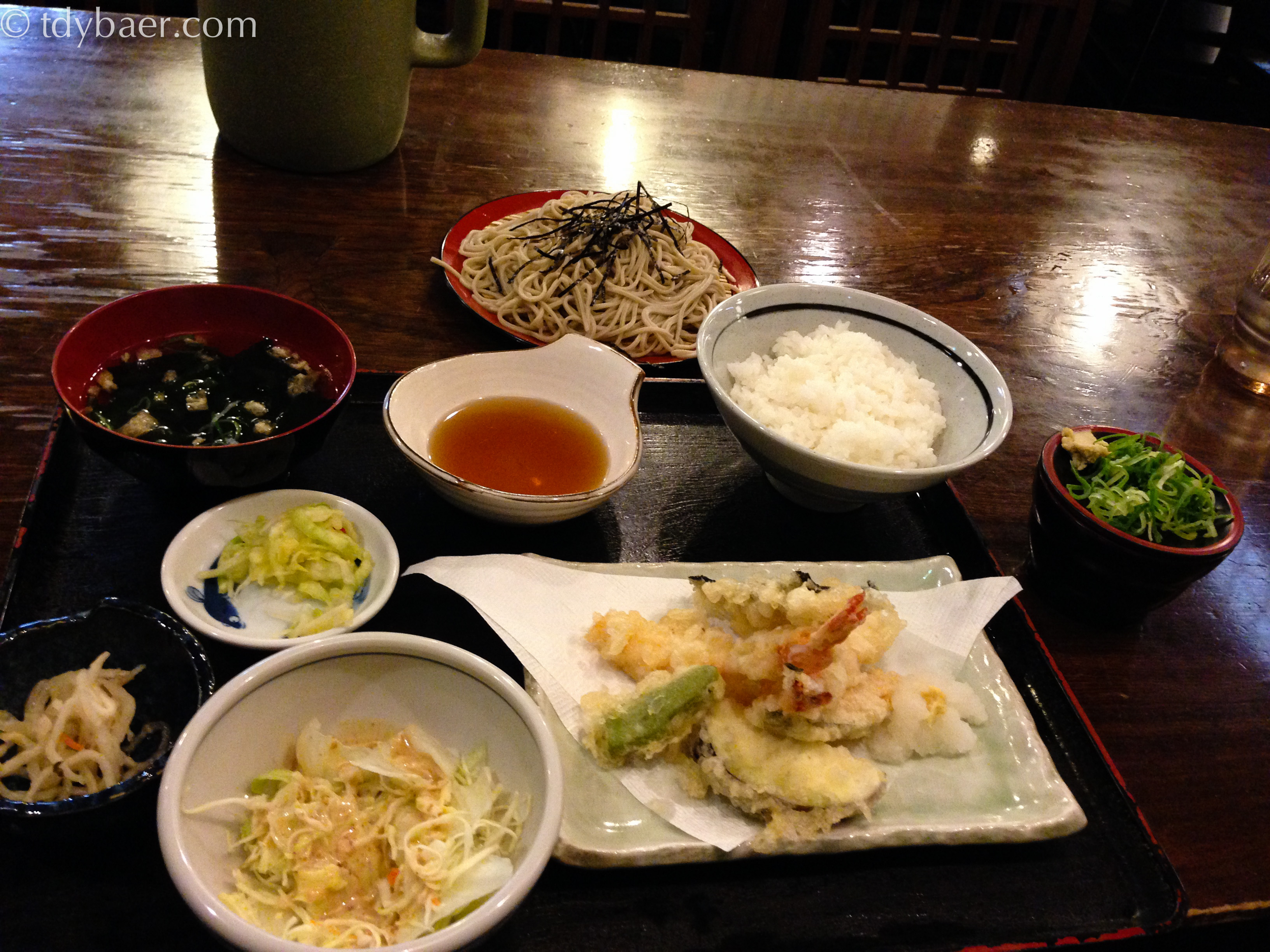 Zu essen gabs: Buchweizennudeln, Gemüse-Tempura, Misosuppe, Reis, leckere Salate …