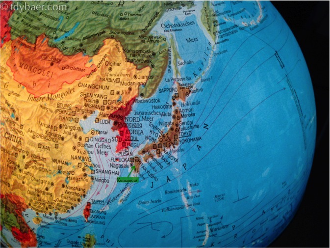 Gegen 5 Uhr am morgen bimmelte der Wecker *gähn*. Also ab in die Klamotten und auschecken. Kurz vor 6:30 Uhr wurden wir wieder von einem Taxi-Dienst abgeholt und zum Flughafen gebracht. Da wir im Hotel kein Frühstück hatten, gab es in der Fressmeile am Flughafen einen exotischen Hotdog und einen Grüntee-Latte :-). Pünktlich um 9:30 Uhr starteten wir in Richtung Kumamoto im Süden von Japan. Wo genau das liegt, habe ich versucht unten in der Karte mit einem grünen Pfeil anzudeuten.