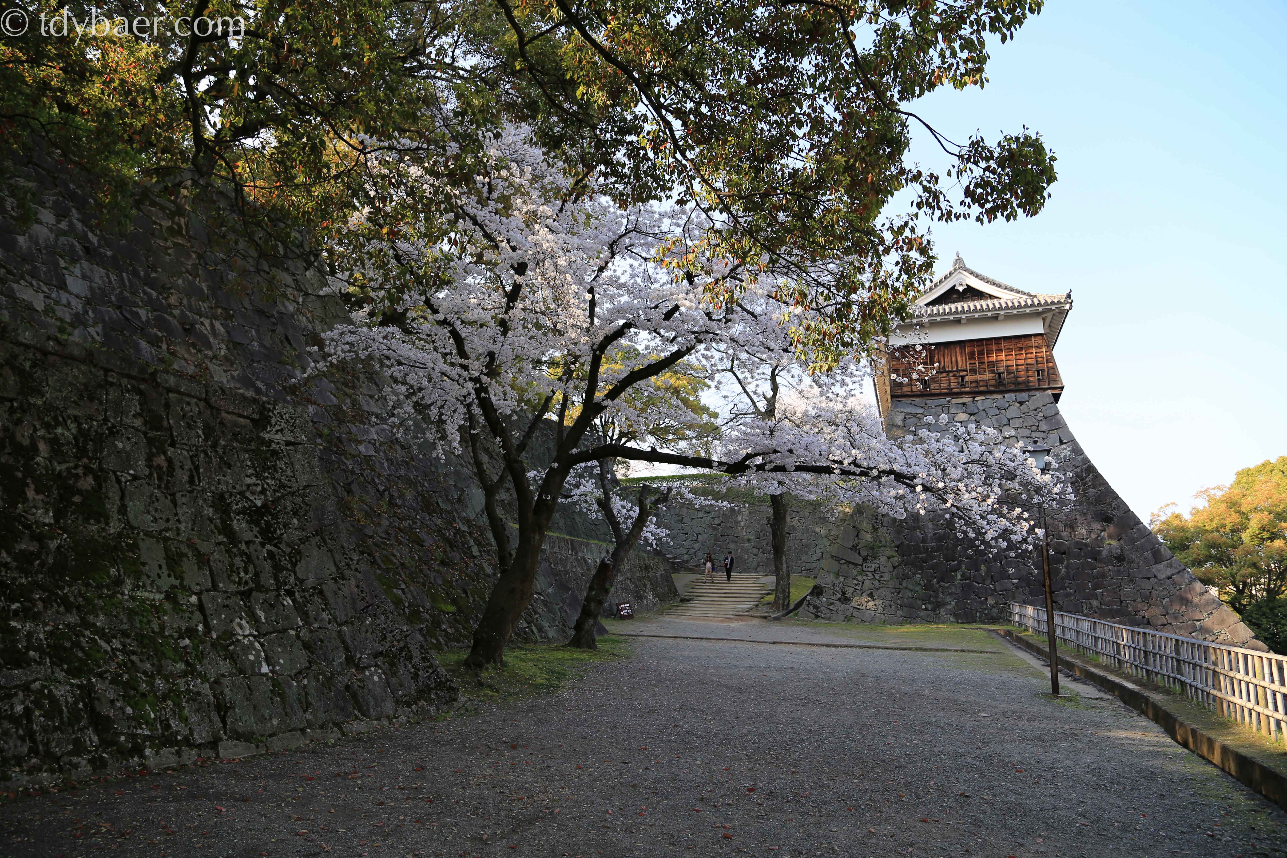 Von der Innenstadt liefen wir über die Miyuki Bridge und dann die von Kirschbäumen gesäumte Straße zur berühmten Burg Kumamoto-jo hinauf. Sie zählt zu den drei größten Burgen Japans. Im Original sind nur noch die Außenmauern mit elf Türmen und ein paar Tore erhalten. Während der Satsuma-Rebellion brannte der Großteil der Anlage 1877 leider nieder. Inzwischen ist aber das Meiste wieder wundervoll restauriert worden.