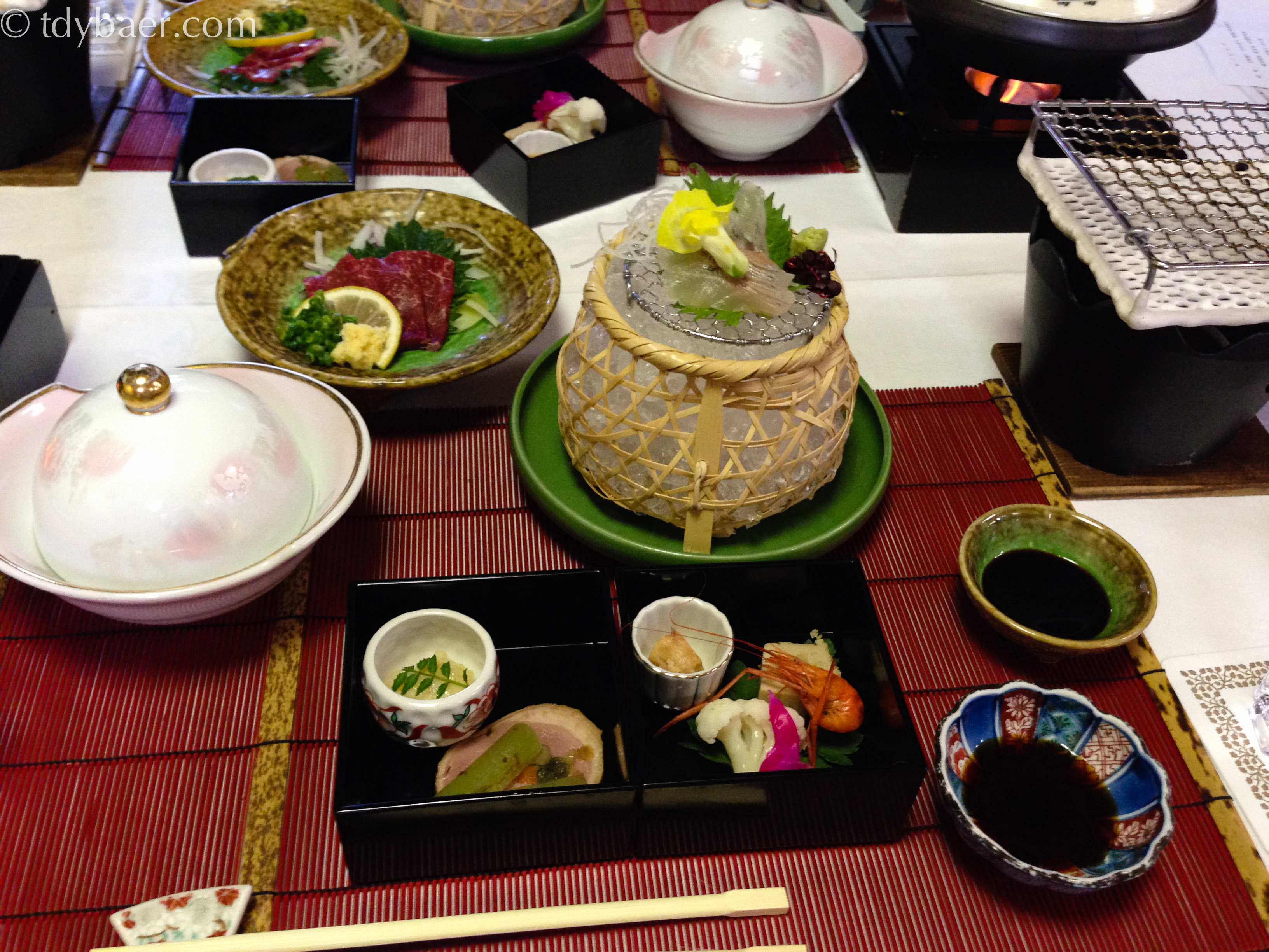 Leute, so etwas bekommt man sicher nicht in Deutschland angeboten. Das erste Mal richtig traditionell japanisch essen. Über mehrere Gänge hinweg wurden uns die unterschiedlichsten Spezialitäten und Leckereien serviert. Dazu immer leckeren grünen Tee und Reis so viel man mag :-). Aber seht selbst …