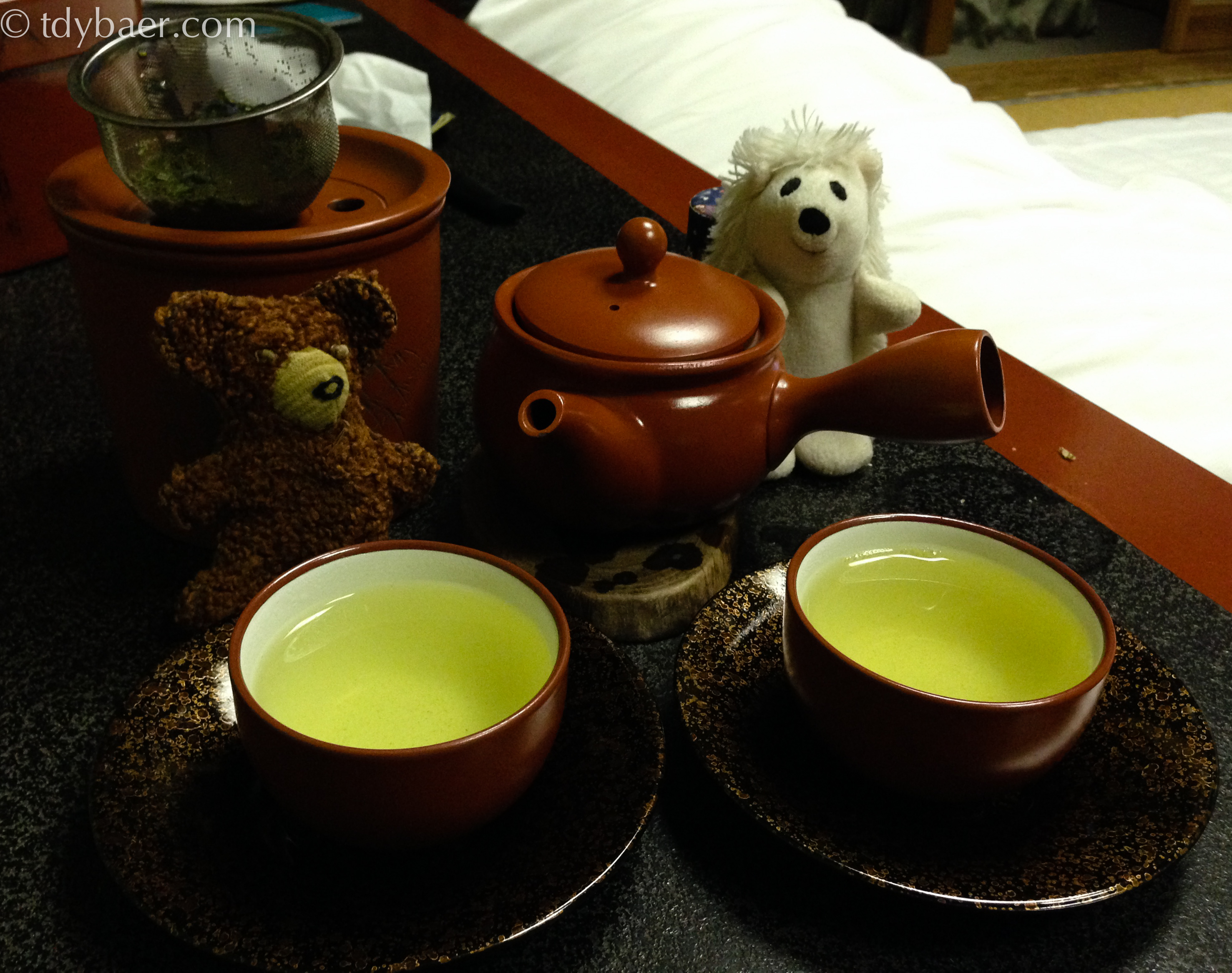 Passend dazu natürlich noch grünen Tee, der in keiner japanischen Unterkunft fehlt. Die nötigen Utensilien, grüner Tee und heißes Wasser stehen immer bereit.