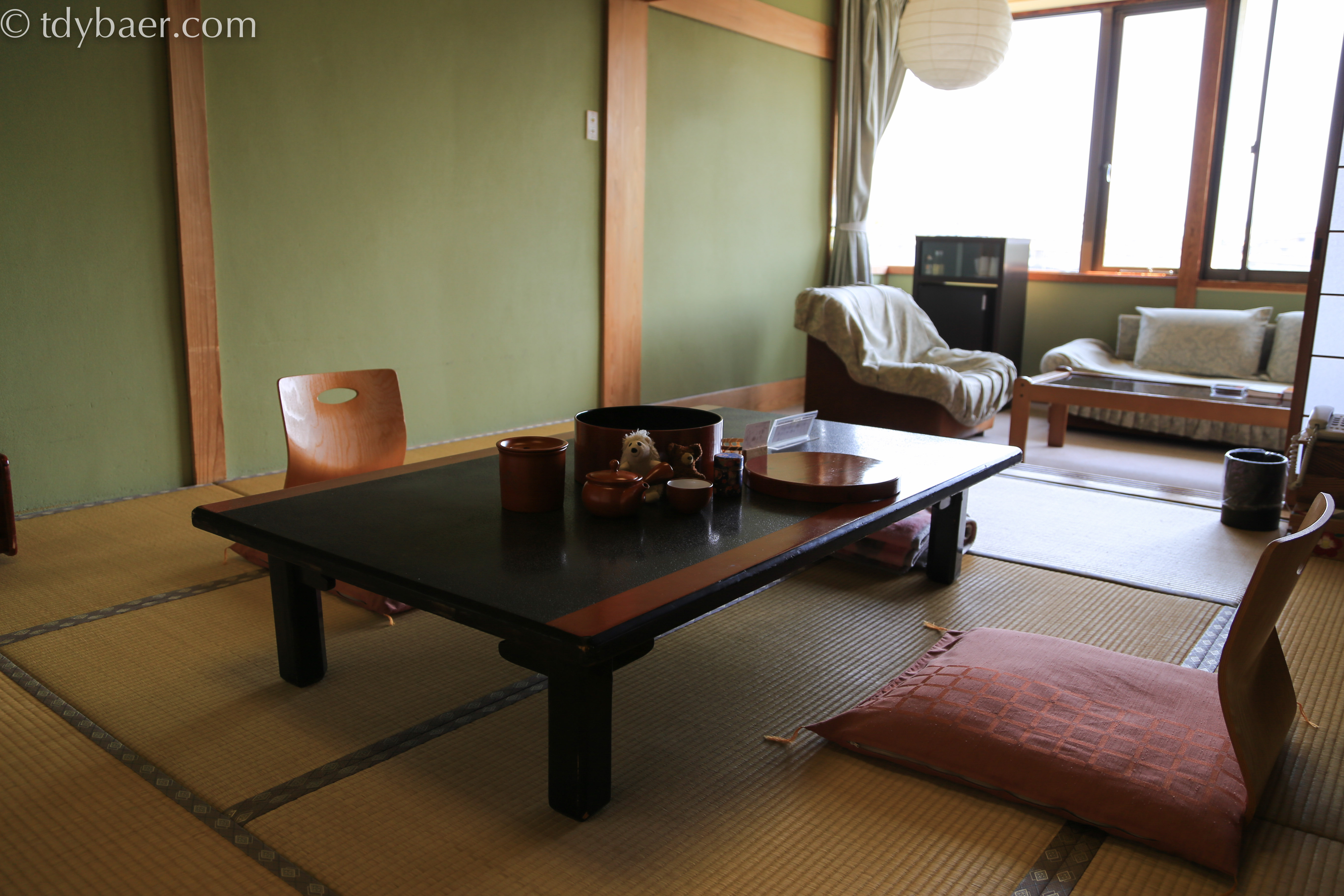 Kurz nach 12 Uhr erreichten wir auch schon die Endstation und unser Tagesziel Hitoyoshi. In der Touristeninformation am Bahnhof deckten wir uns mit einem Stadtplan ein und fragten nach dem Weg zum Ryokan. Dort gelangten wir mit unseren Koffern bequem zu Fuß hin. Wir wurden freundlich begrüßt und gleich zu unserem Zimmer geführt.