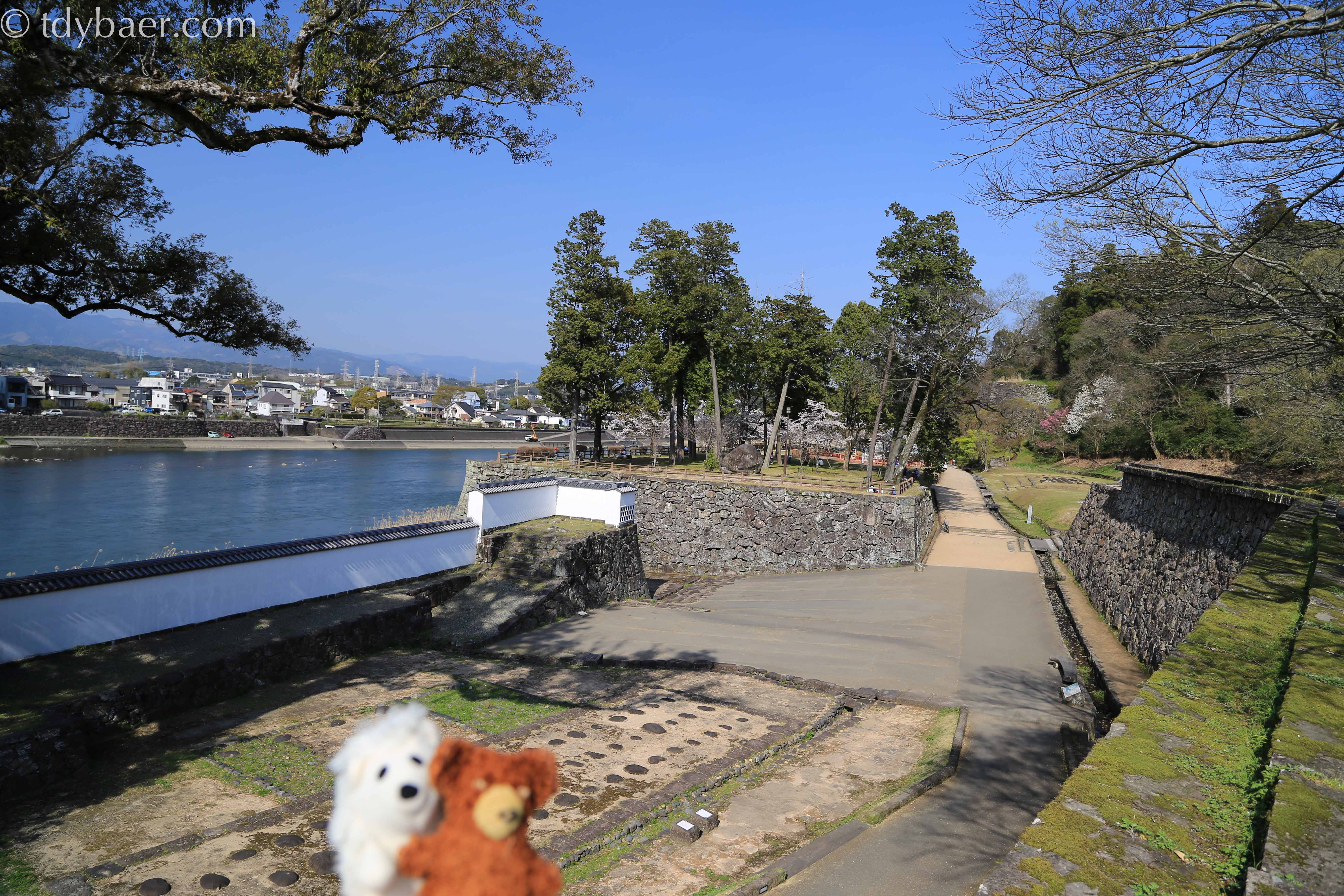 Die steinernen Mauern umschließen die Burgstadt von Hitoyoshi. Vor uns wieder der Kumagawa River mit einem schönen Blick auf die Stadt und die Bergwelt rundherum.
