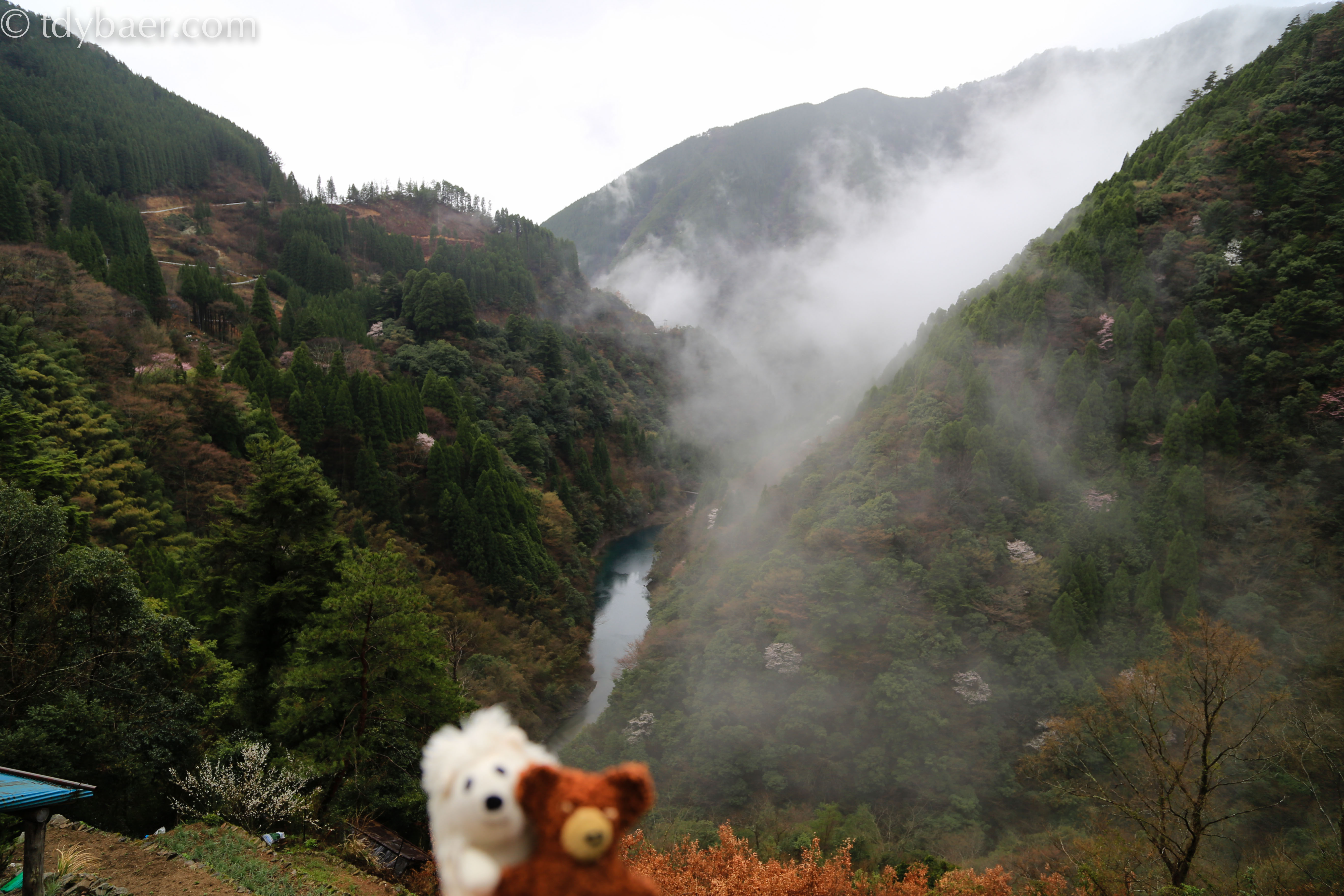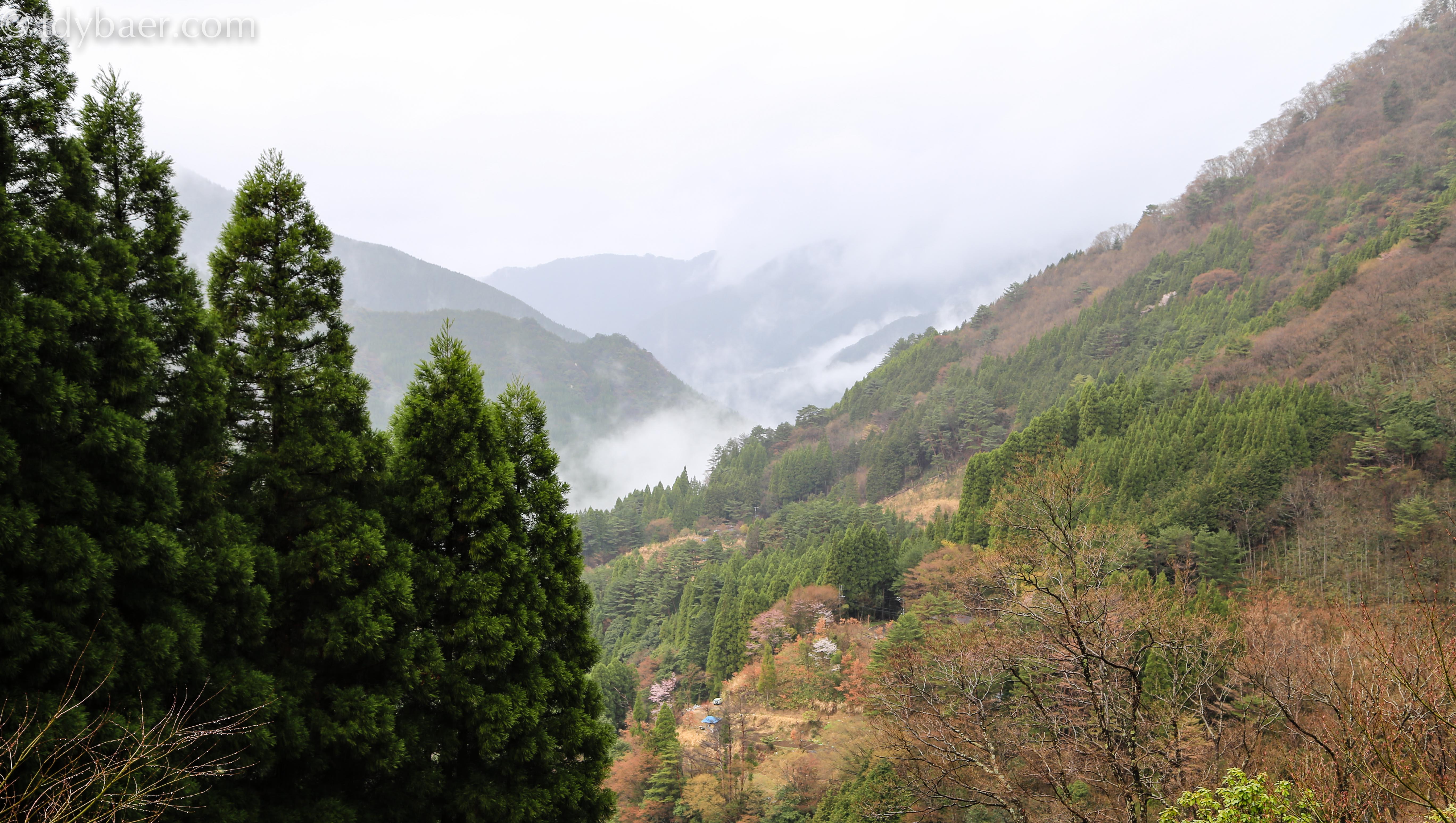 Weiter geht die Fahrt durch die Berge und Täler von Gokanosho. Die rosafarbenen Tupfer in den Mischwäldern sind frisch blühende Kirschbäume.