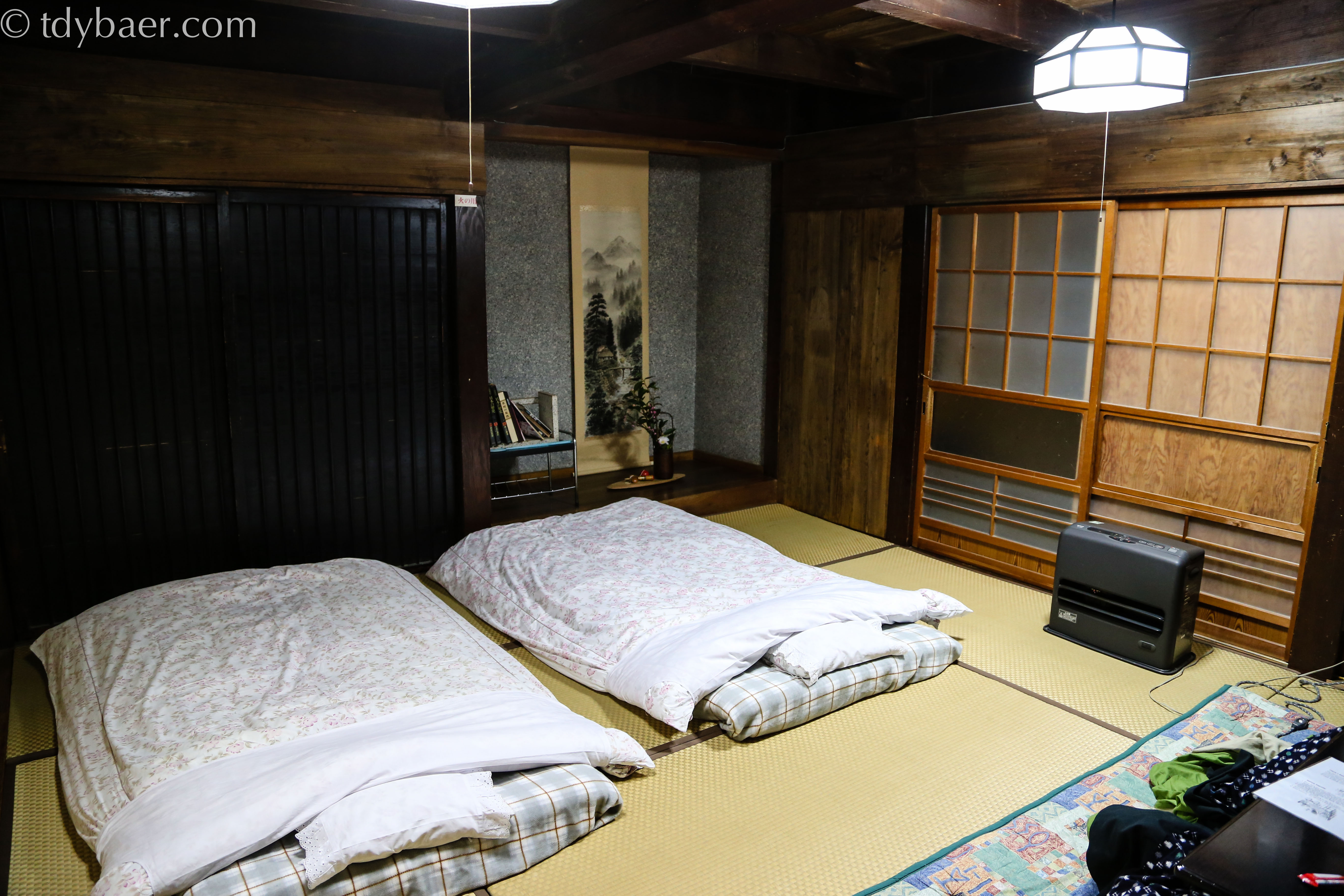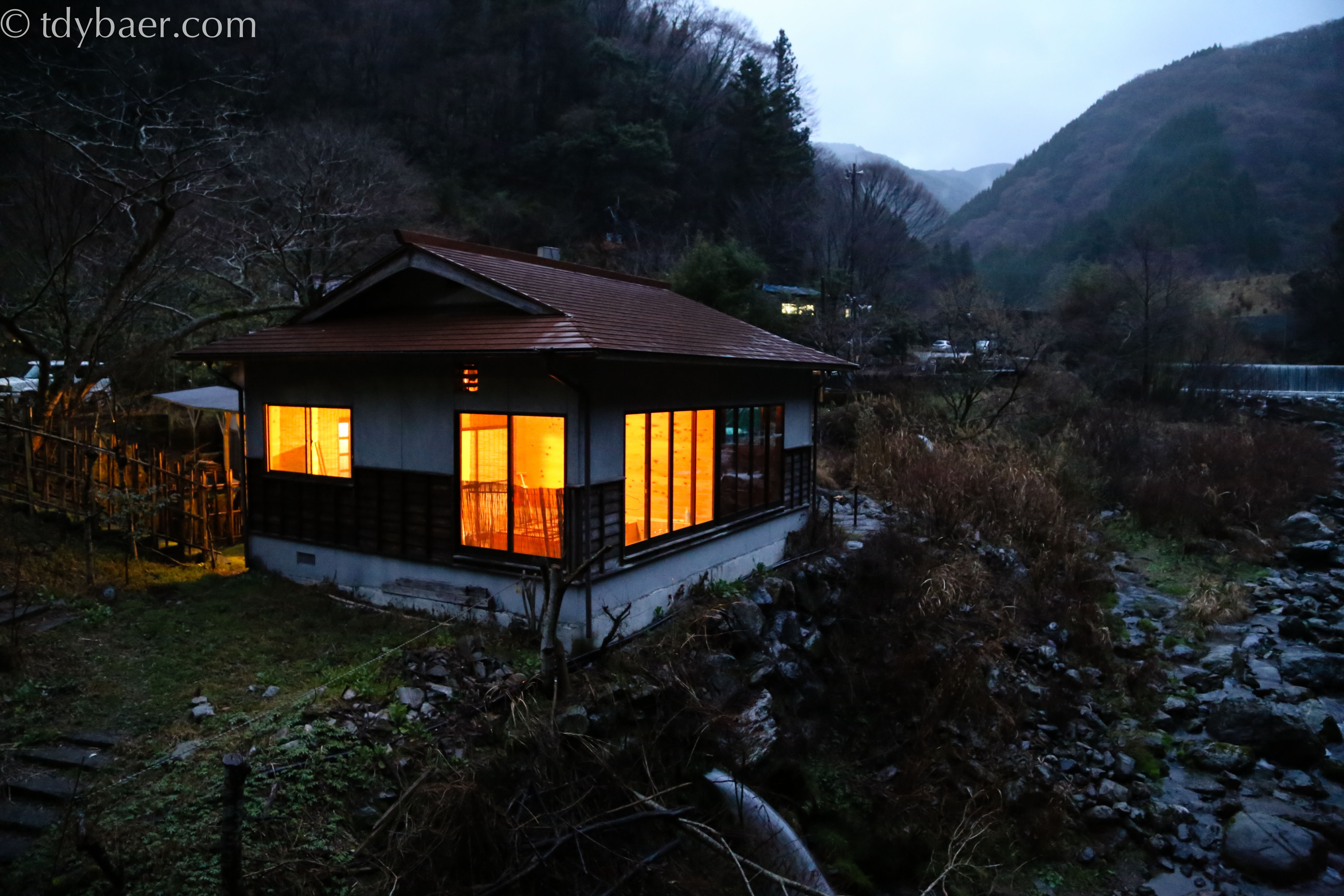Da es nun schon langsam Abend wurde, machten wir uns auf den Weg zu unserer Unterkunft – dem Minshuku Heike-so Gokanosho. Das ist aber nicht irgendeine Unterkunft, sondern ein über 300 Jahre altes Anwesen der Nachfahren der Heike-Samurai-Dynastie. Es ist direkt an einem Gebirgsfluss gelegen.