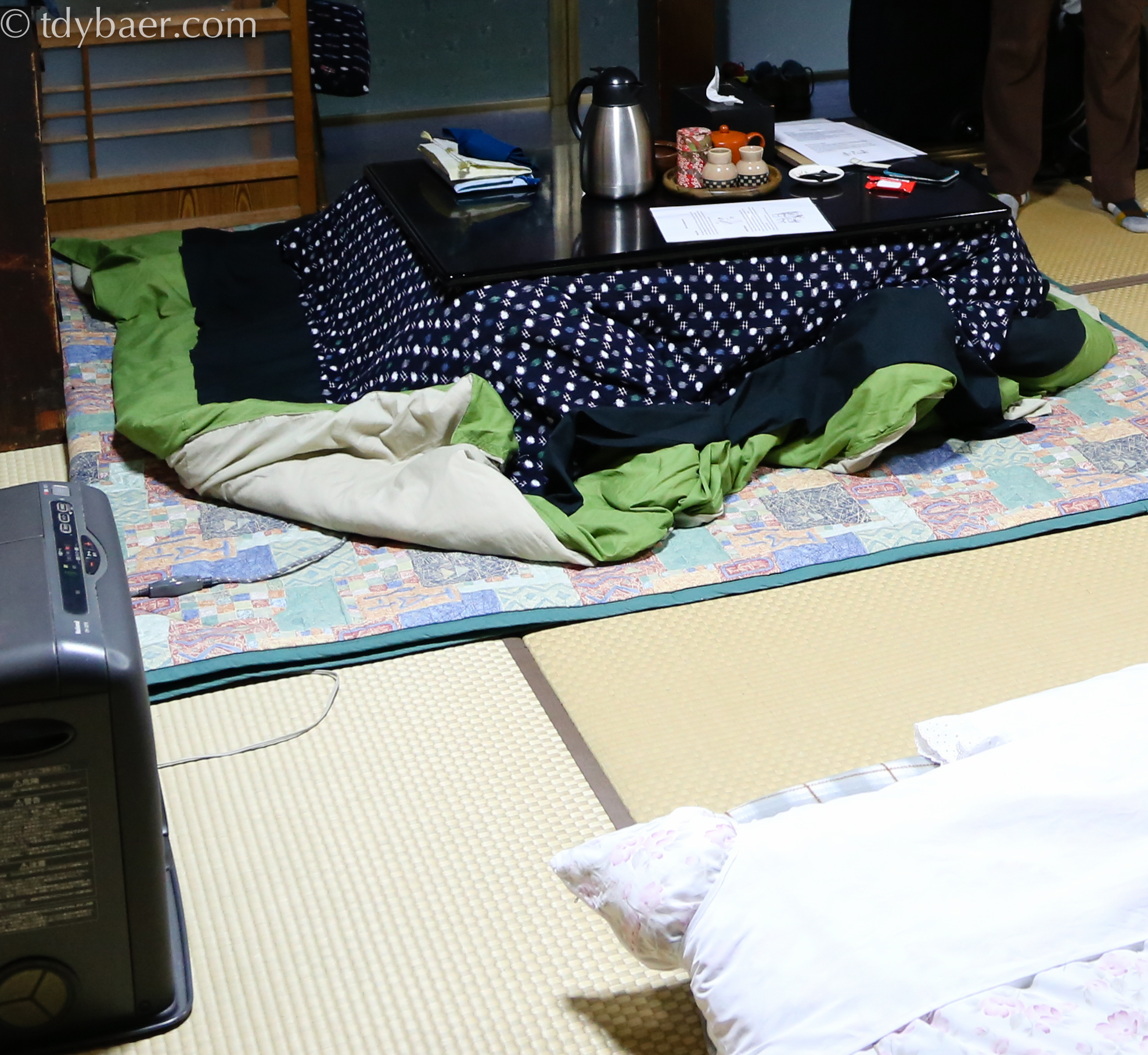 Das Tolle in dieser Unterkunft war die Heizdecke unter dem Tisch. Da die Temperaturen doch eher im einstelligen Bereich waren, schaltete wir das Teil auch gleich an und steckten die Beine darunter. Herrlich :-).