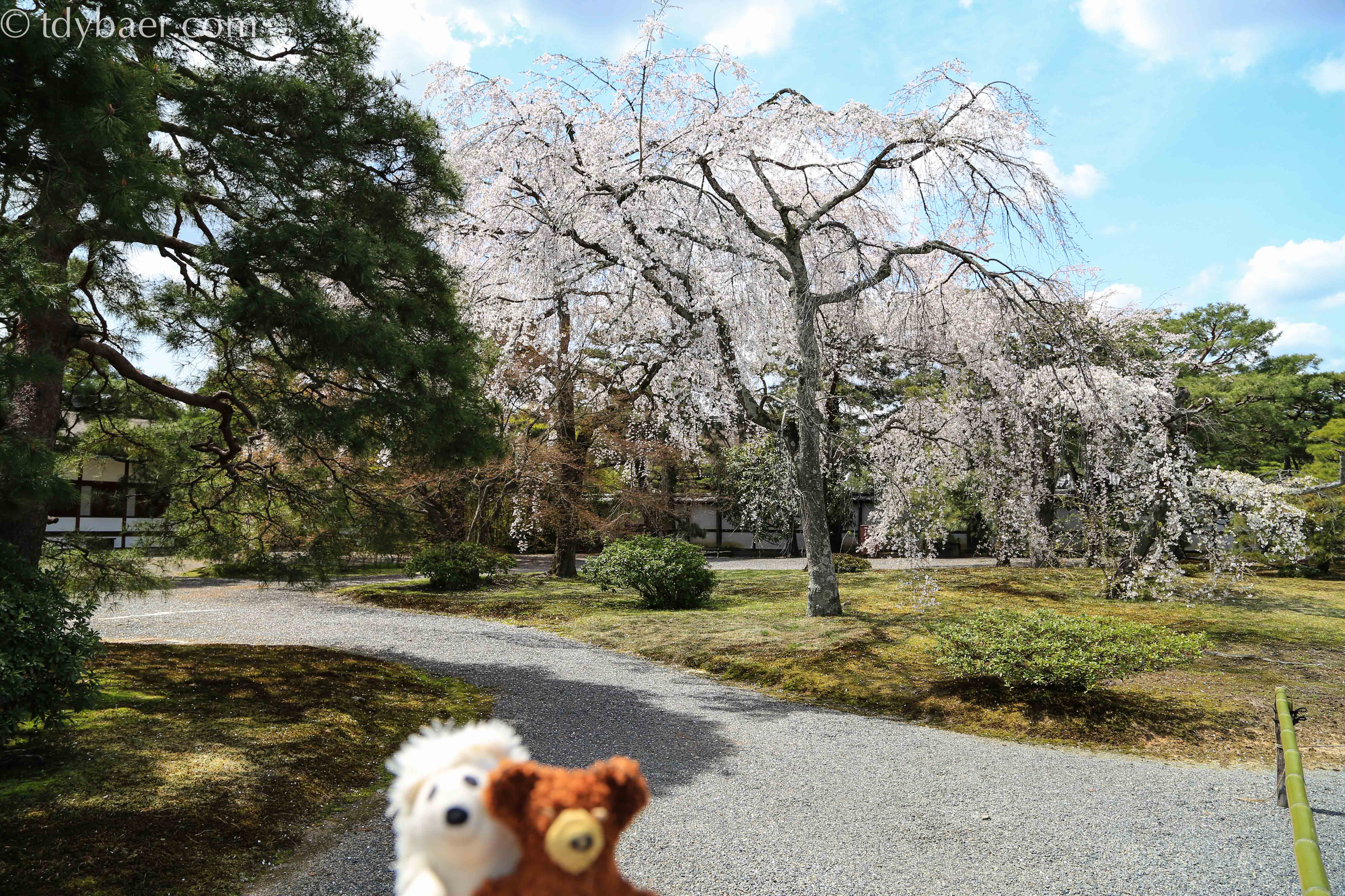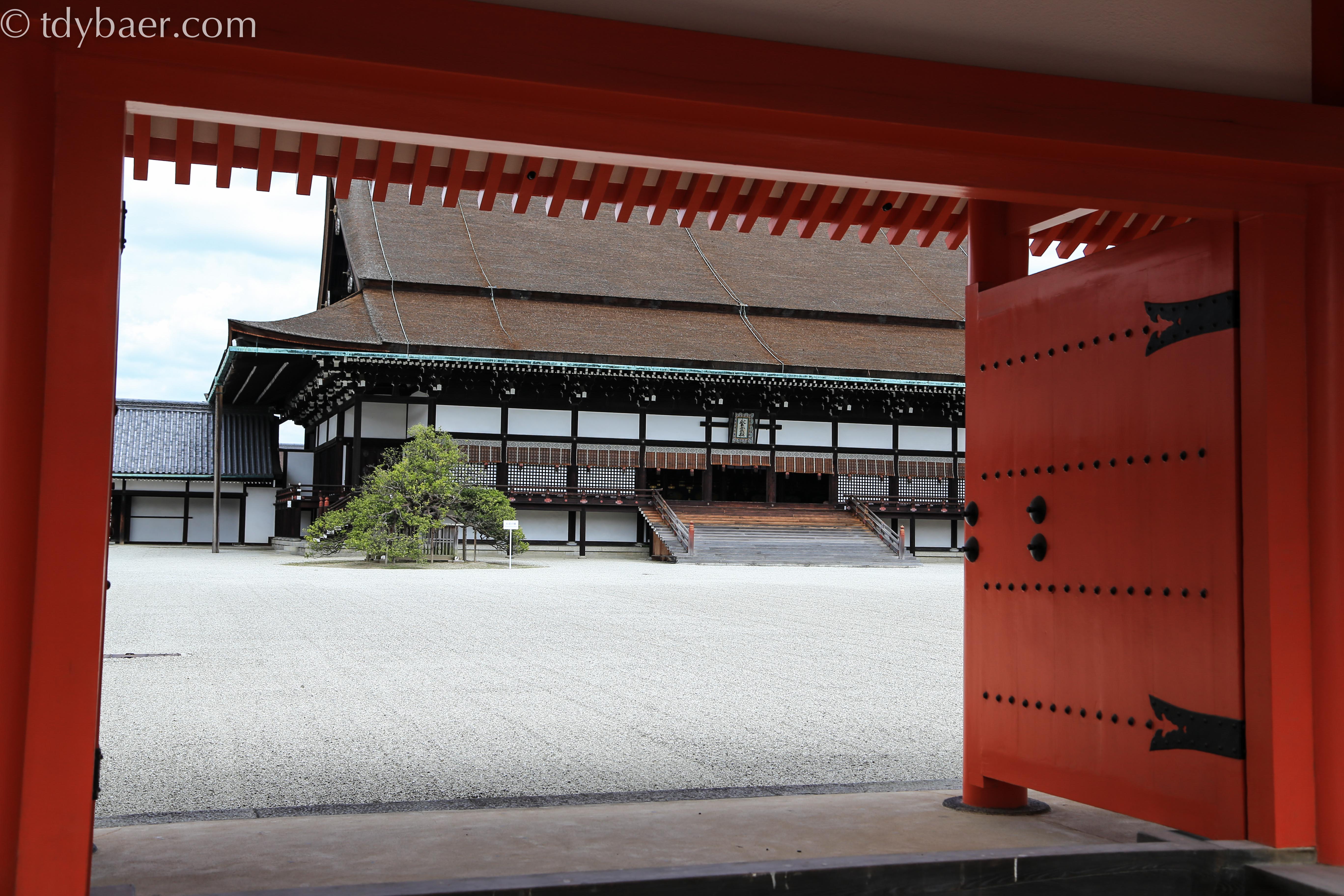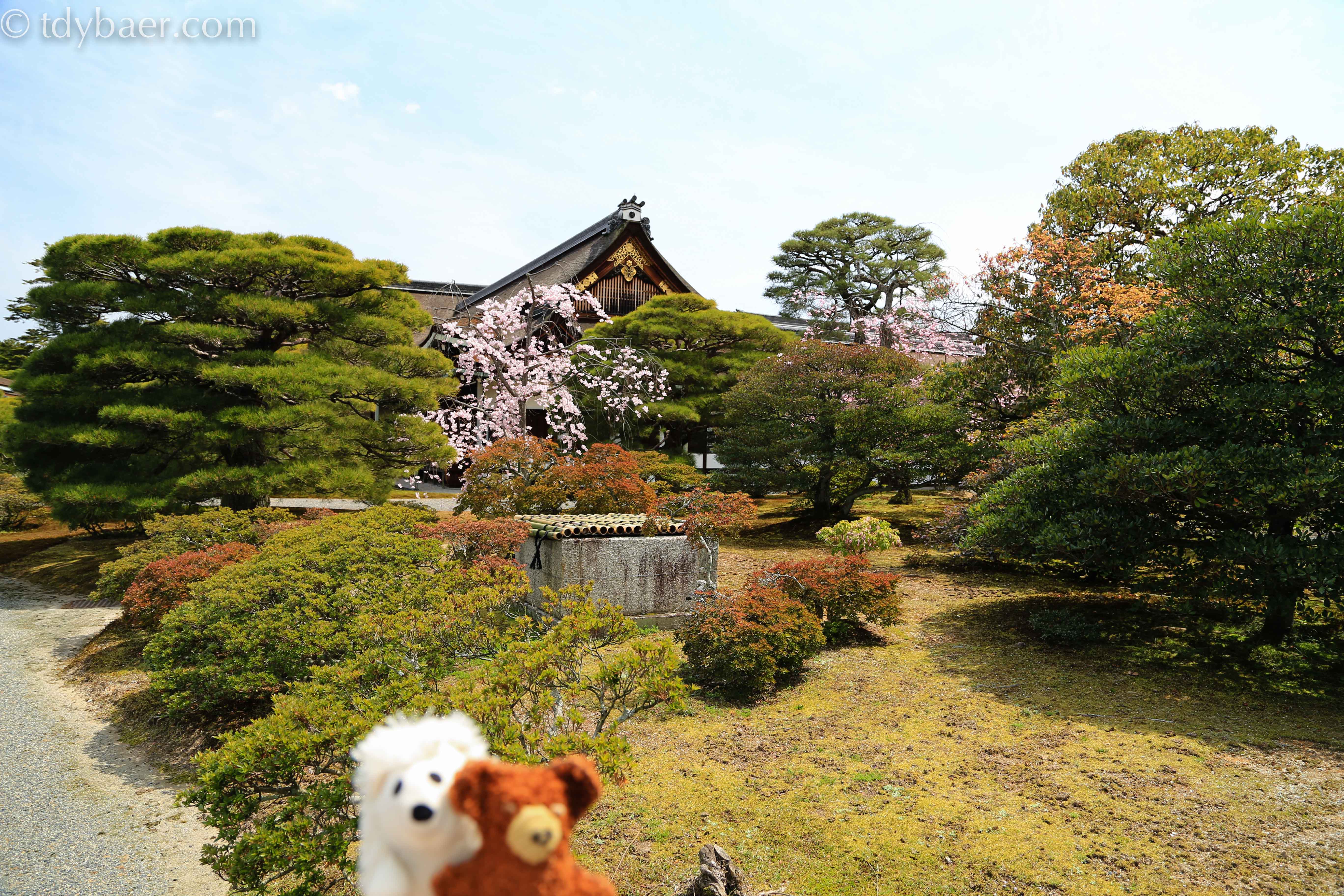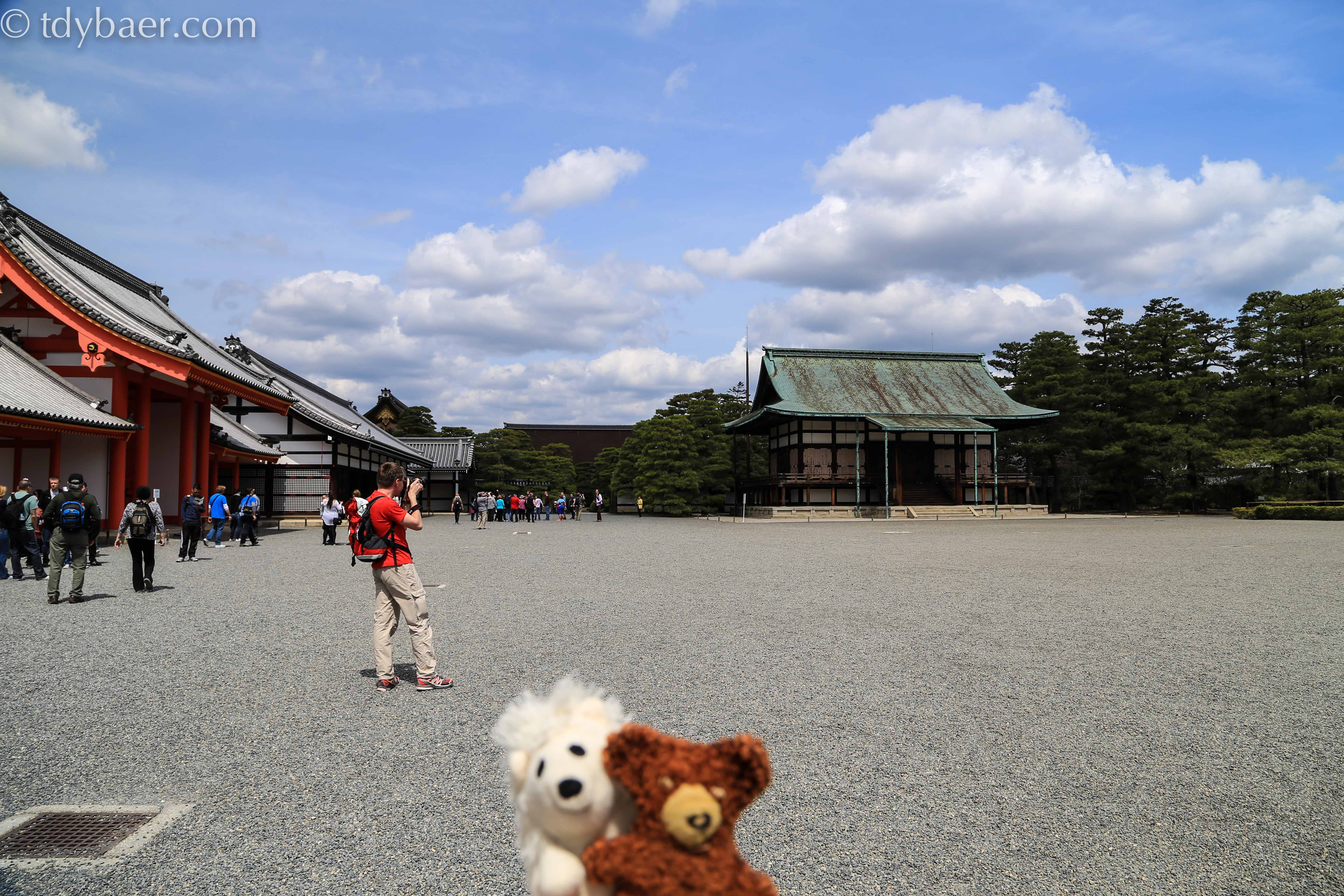 Nun sind wir bei der dritten Sehenswürdigkeit vor dem Mittagessen angelangt – dem Kaiserpalast Kyoto Gosho. Der Palast steht auf einem riesigen Gelände mit einem Ausmaß von ungefähr 11 ha. In einer geführten Tour kann man sich den Palast von „außen“ und einen Teil des schönen Oikeniwa Gartens anschauen. Im Hintergrund sieht man das schöne hölzerne Gishumon Tor, eins von sechs Toren in der großen Palastmauer.