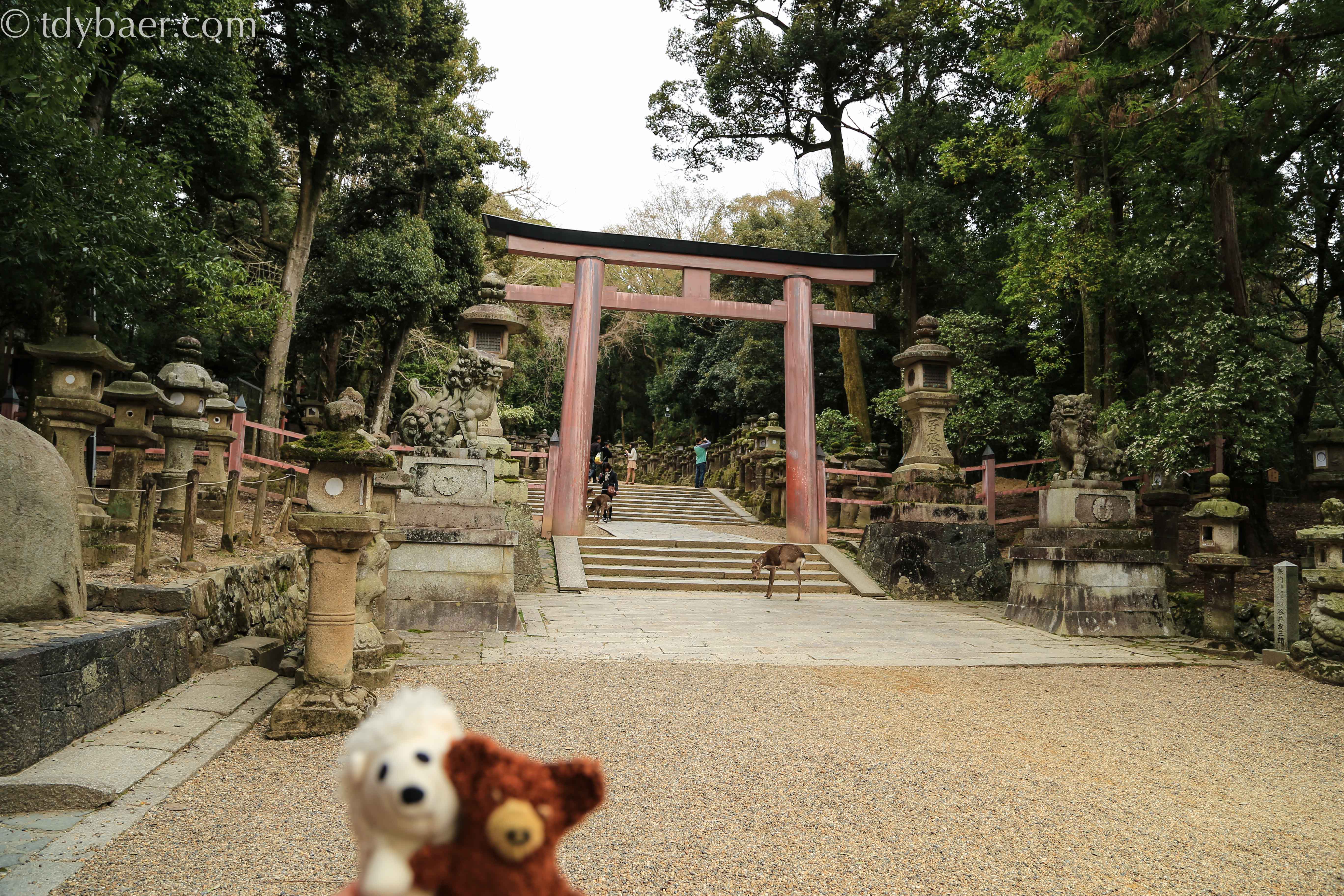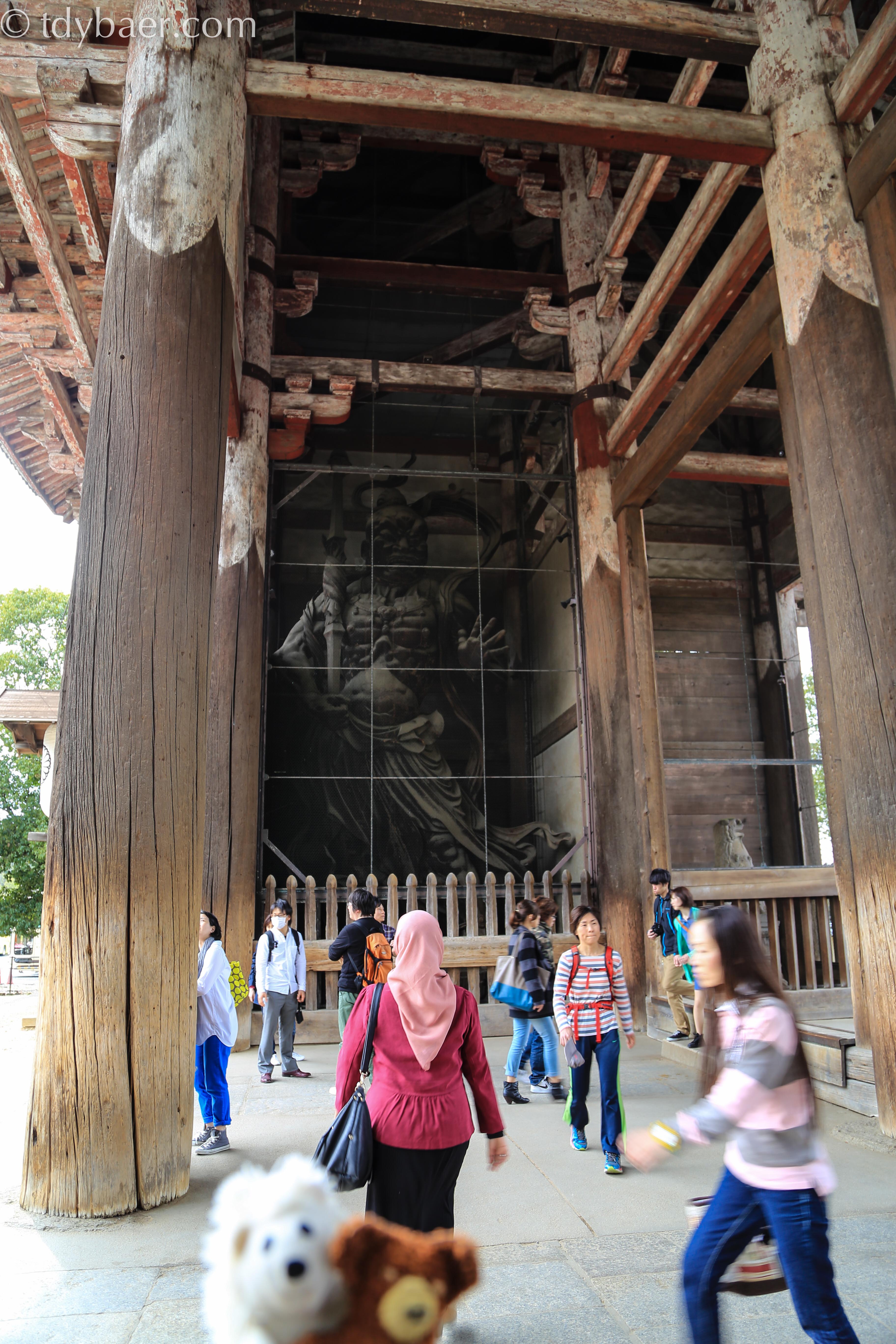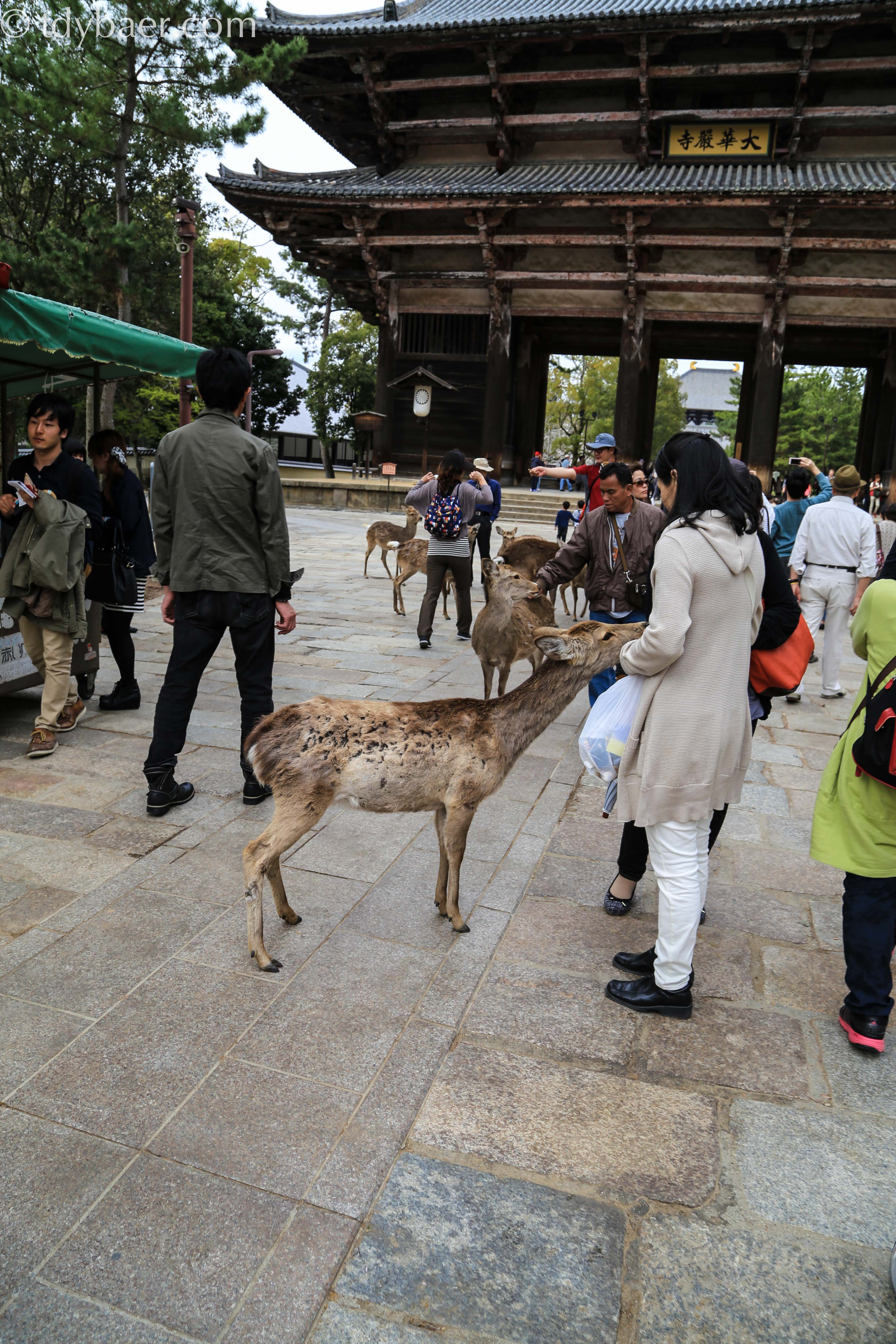 Natürlich kann man am Eingang etwas Futter für die Tierchen kaufen, die einem anschließend durch den ganzen Park folgen. Meiner Meinung nach, hätten sie ja mal etwas Fellpflege nötig ;-). Im Hintergrund sieht man das Nandai-mon, ein zwei-stöckiges Holztor, das den Zugang zum Tempel darstellt.