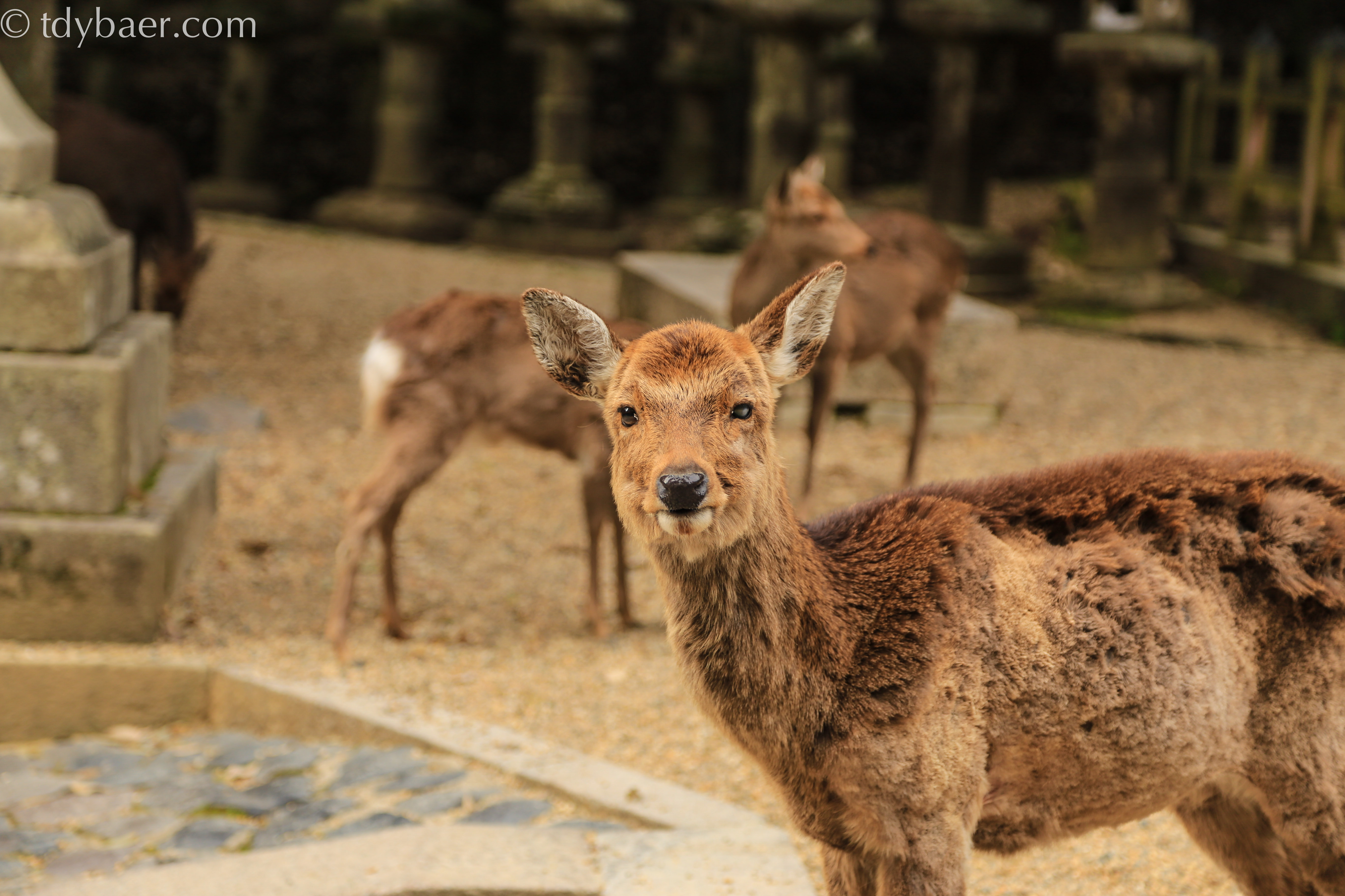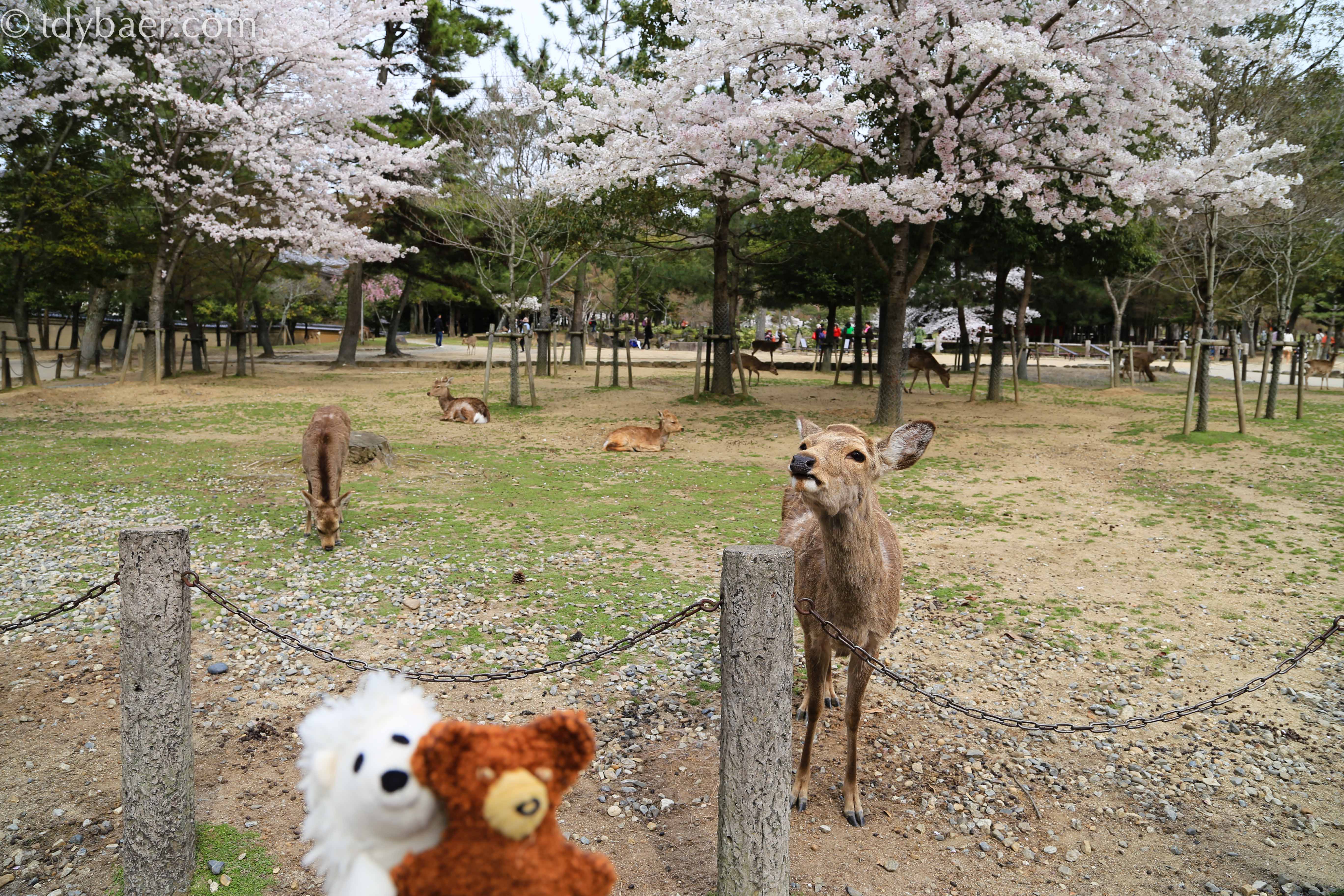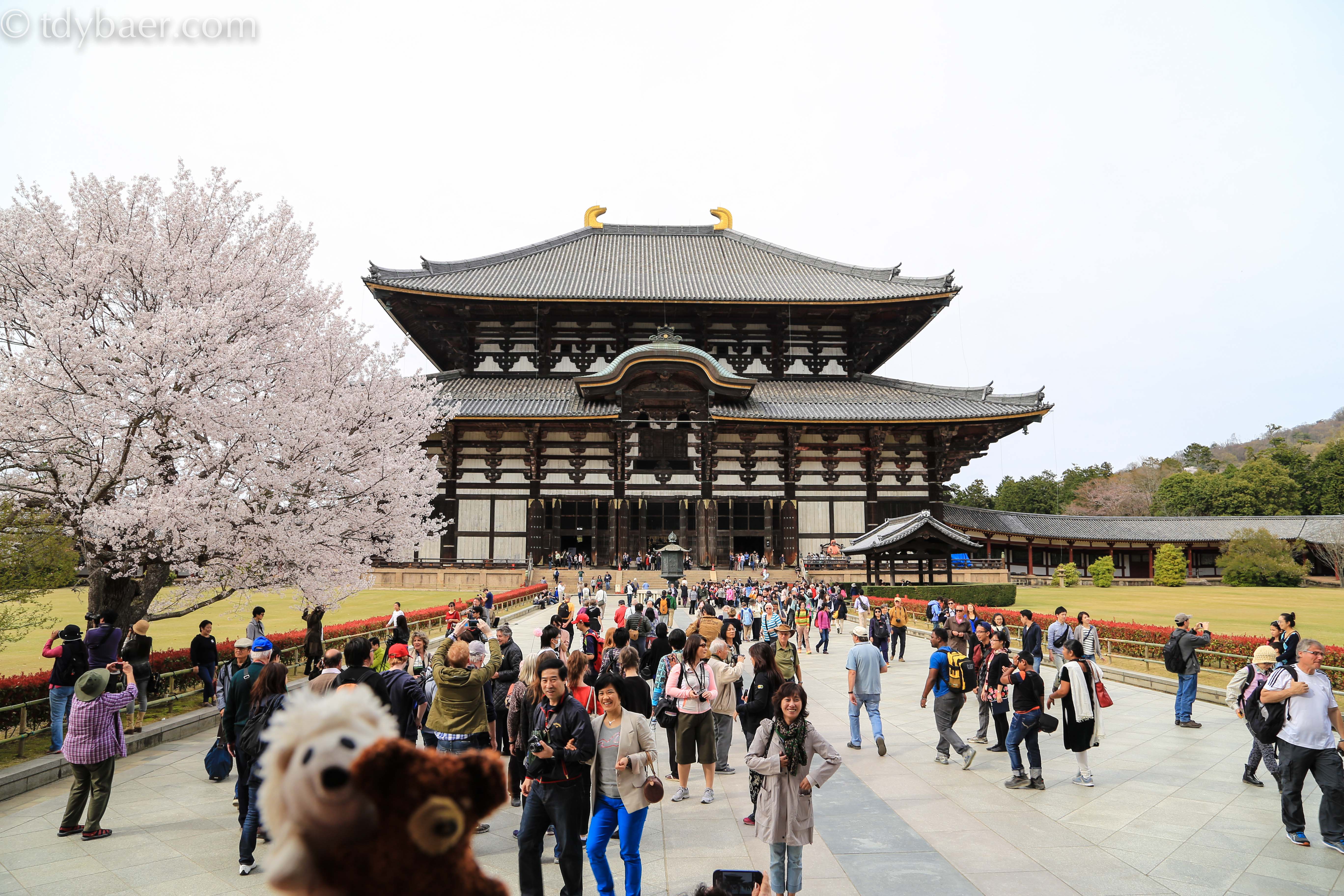 Natürlich kann man am Eingang etwas Futter für die Tierchen kaufen, die einem anschließend durch den ganzen Park folgen. Meiner Meinung nach, hätten sie ja mal etwas Fellpflege nötig ;-). Im Hintergrund sieht man das Nandai-mon, ein zwei-stöckiges Holztor, das den Zugang zum Tempel darstellt.