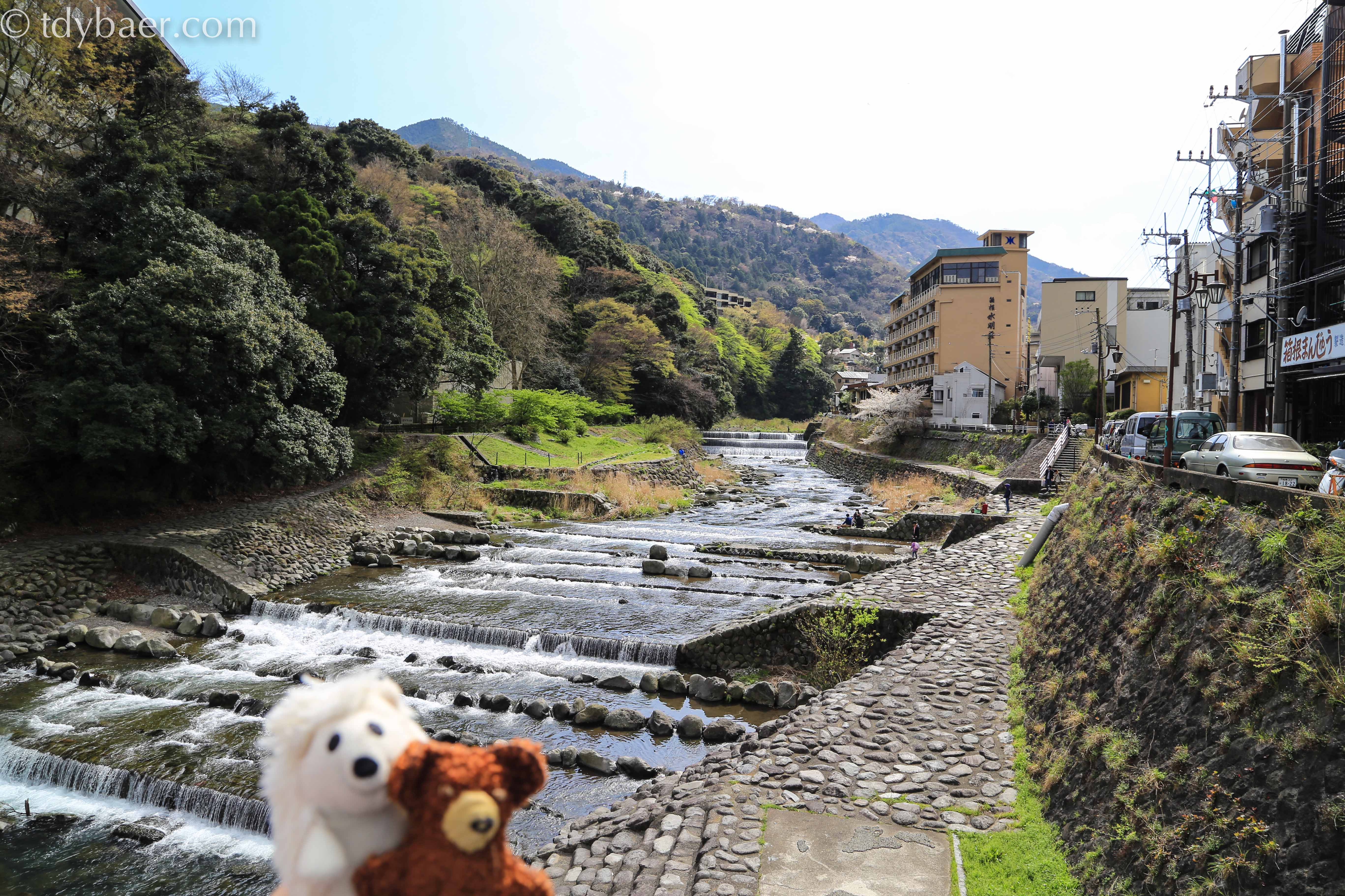 Das Hotel liegt am kleine Fluss Hayakawa – das große gelbe Gebäude im Hintergrund.