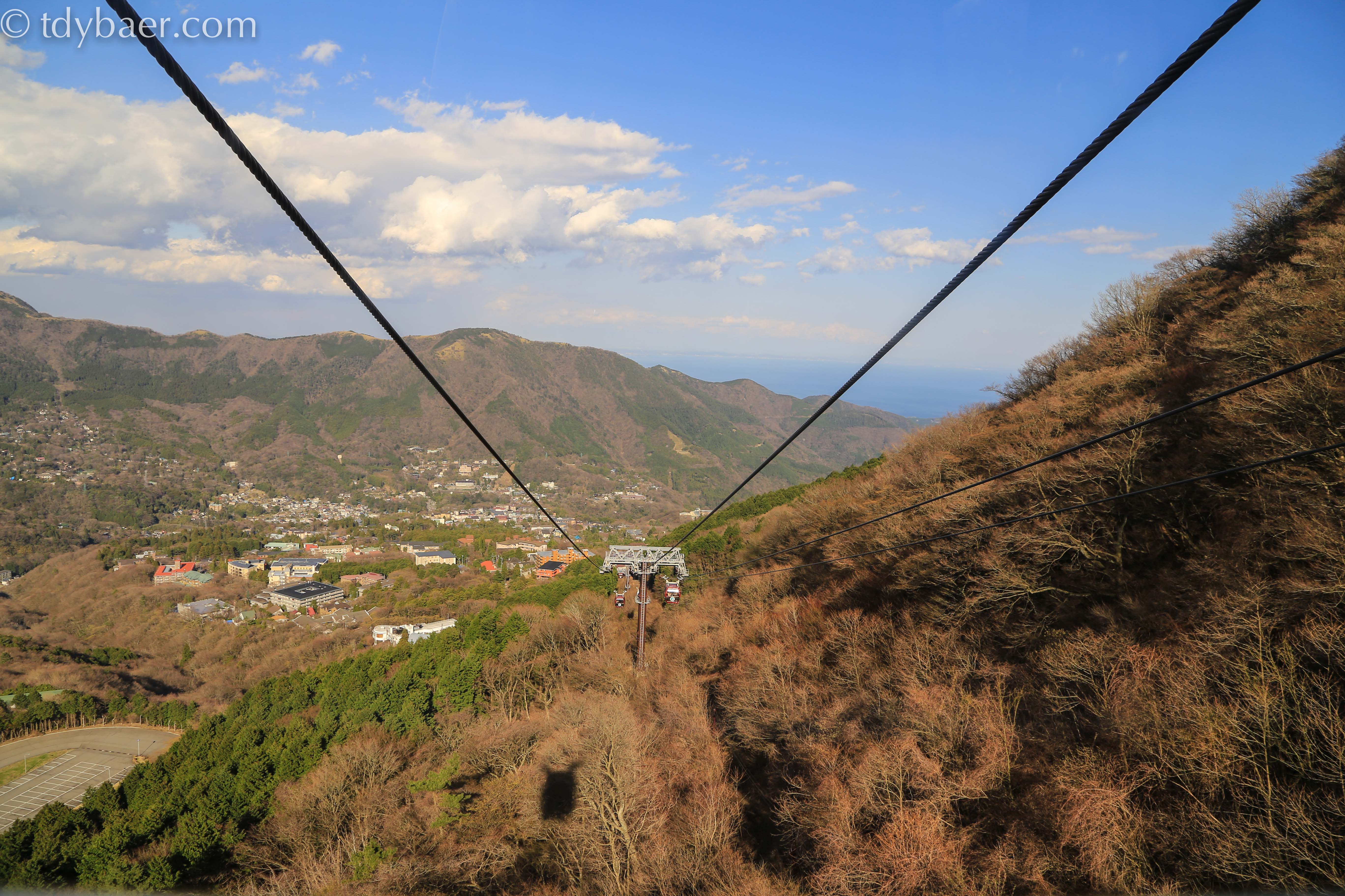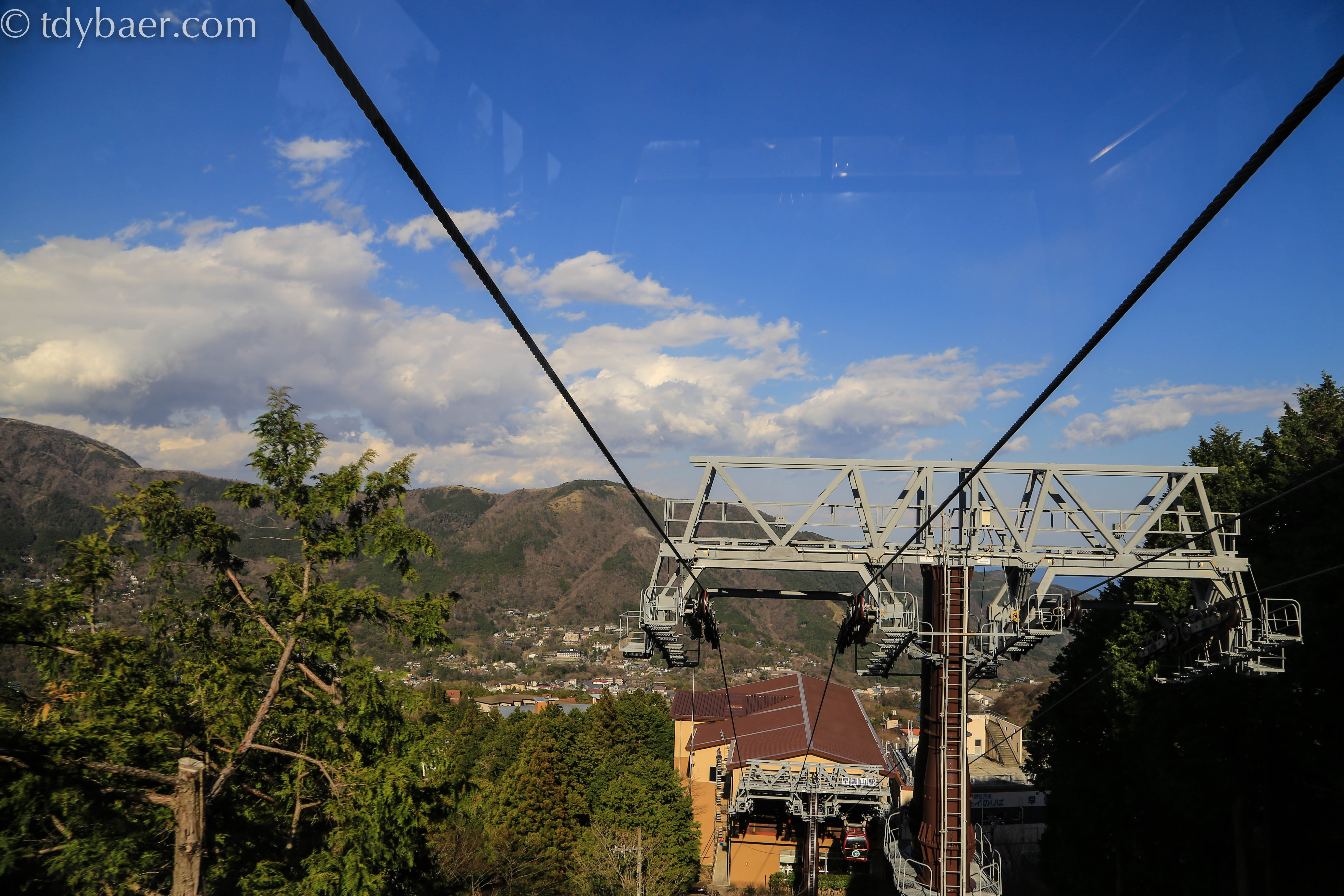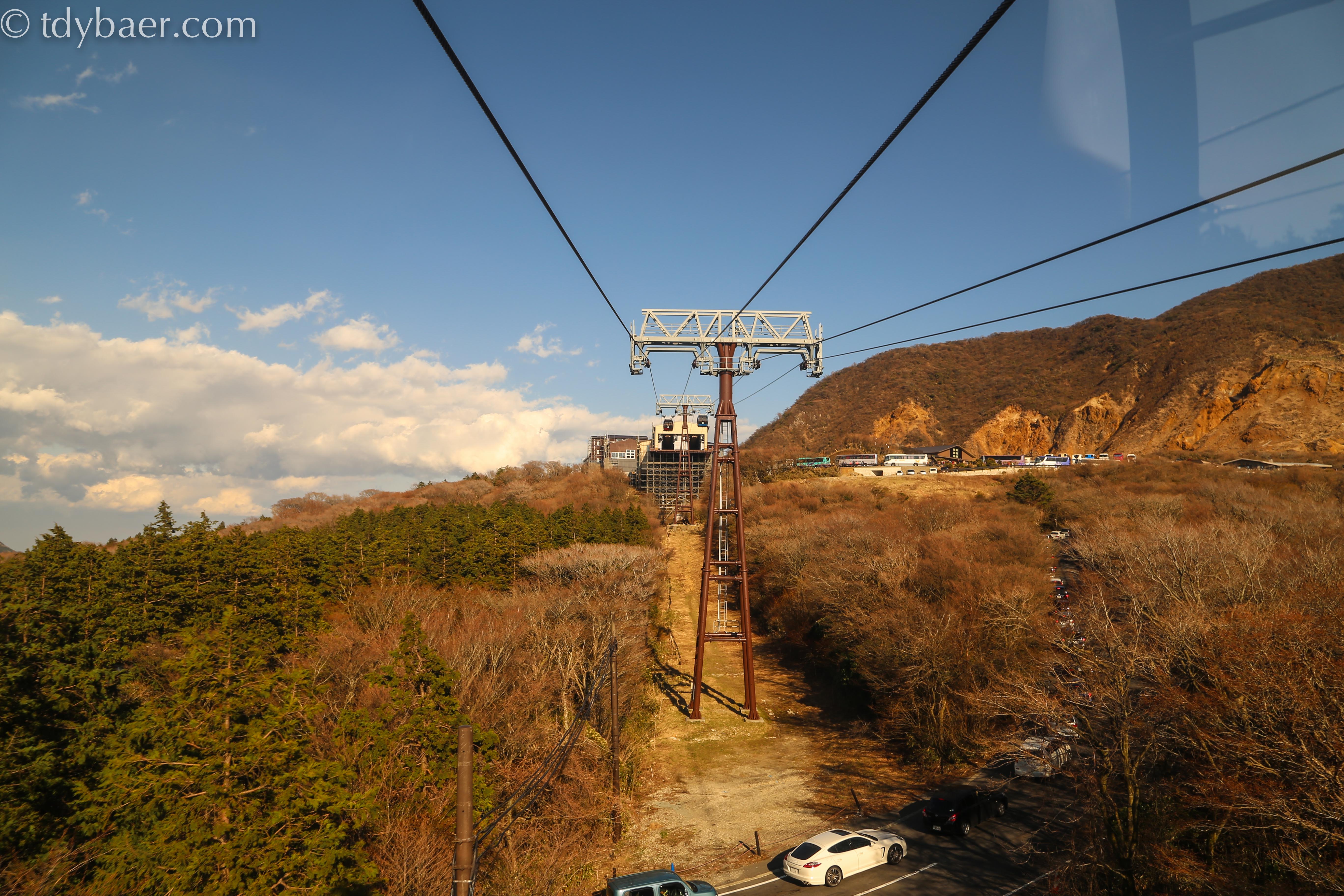 Nach dem Check-in und einem kleinen Imbiss machten wir uns auch gleich wieder auf die Socken. Das tolle Wetter mussten wir jetzt unbedingt ausnutzen, denn für morgen war weniger gutes Wetter vorhergesagt. Vom Bahnhof in Hakone-Yumoto geht es mit einem weiteren Zug in den Nationalpark hinein bis nach Gora. Dort konnte man direkt in das Hakone Tozan Cablecar einsteigen. Von hier aus geht es steil bergauf bis zur Seilbahnstation in Sounzan.