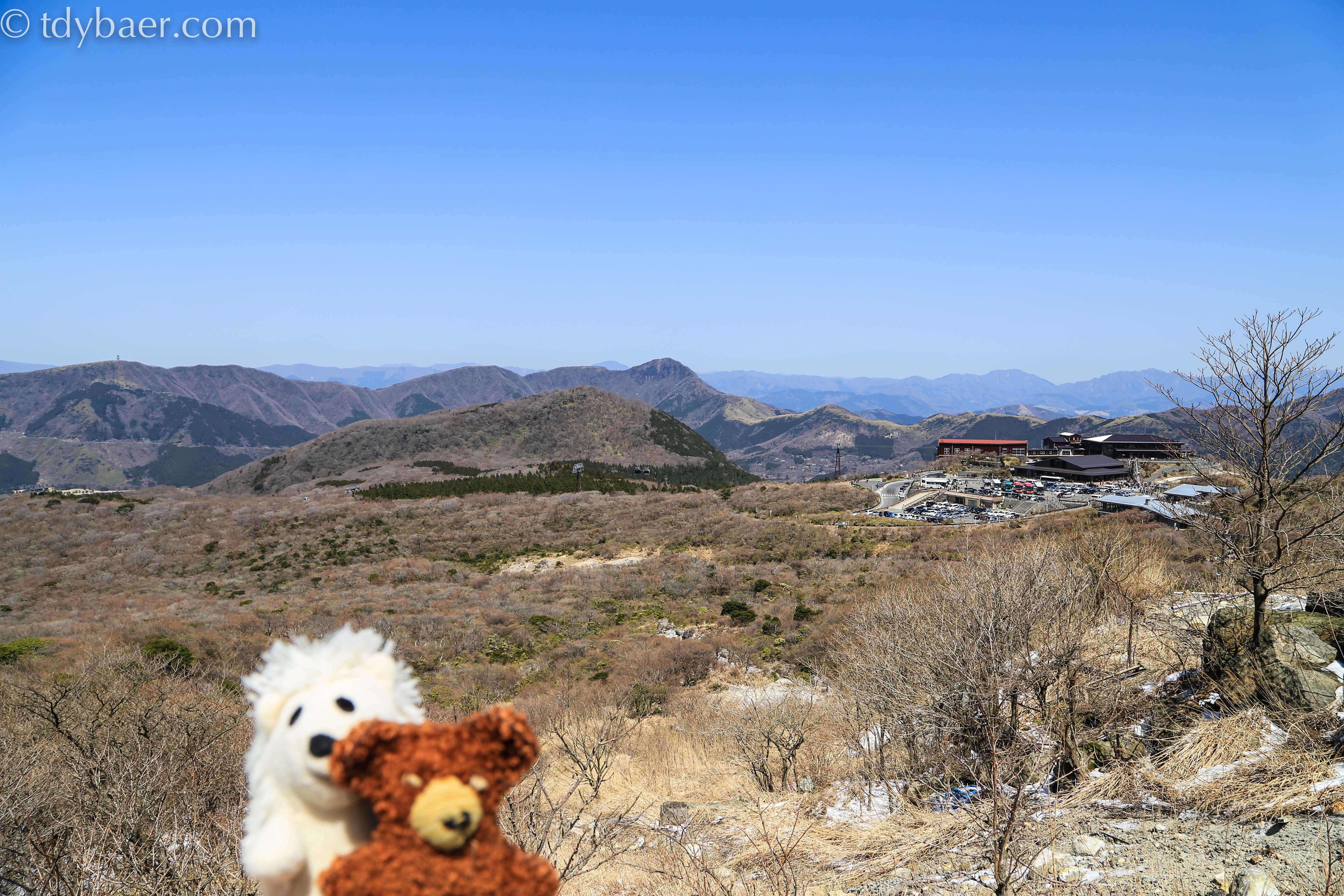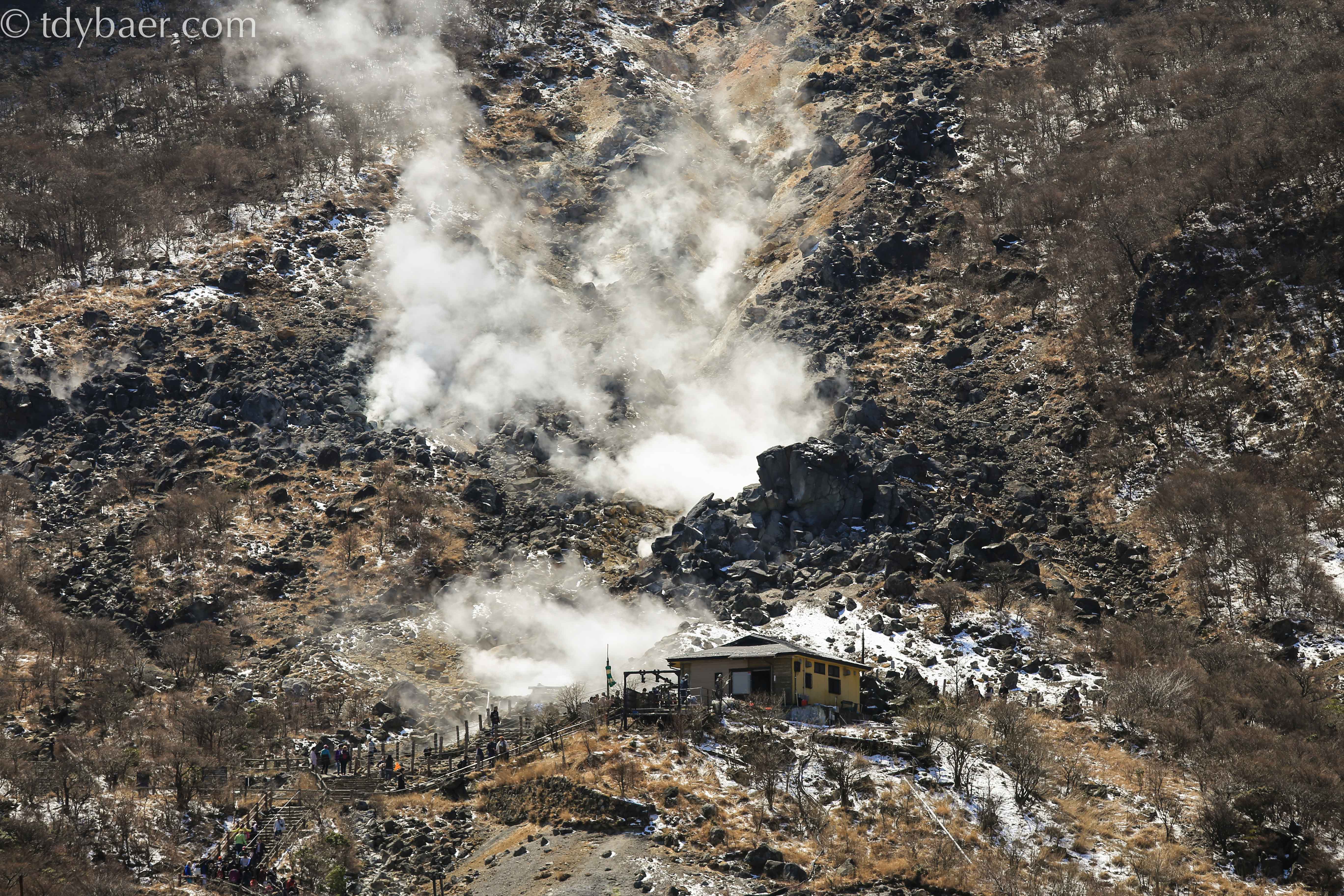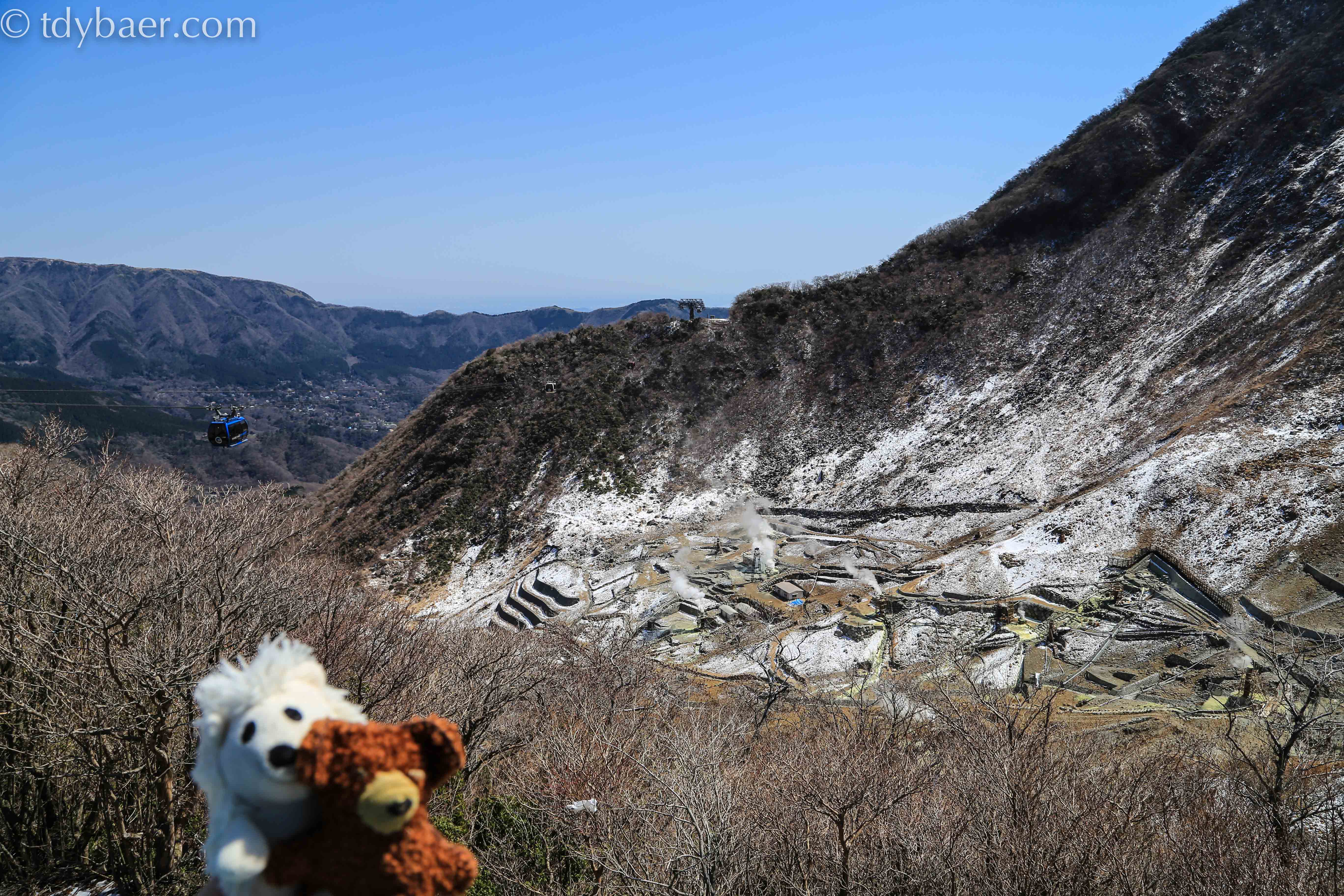 Mit der Seilbahn ging es wieder bergaufwärts nach Owakudani. Im Hintergrund kann man noch gut die Schneereste von dem kleinen Wintereinbruch am gestrigen Tag erkennen. Jetzt ist es aber ganz angenehm hier oben.
