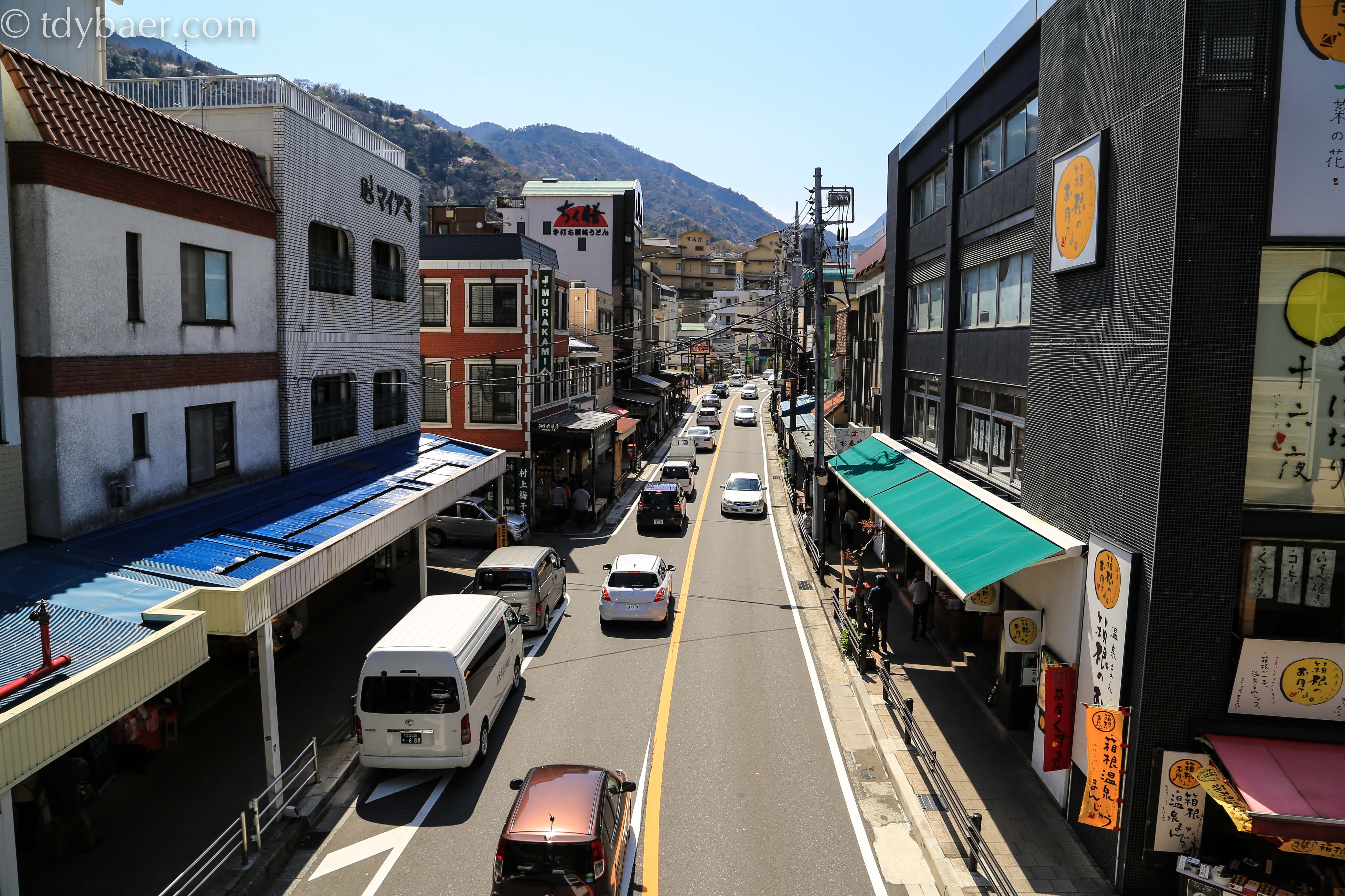 Ein Blick auf die doch rechts viel befahrene Hauptstraße von Hakone-Yumoto.