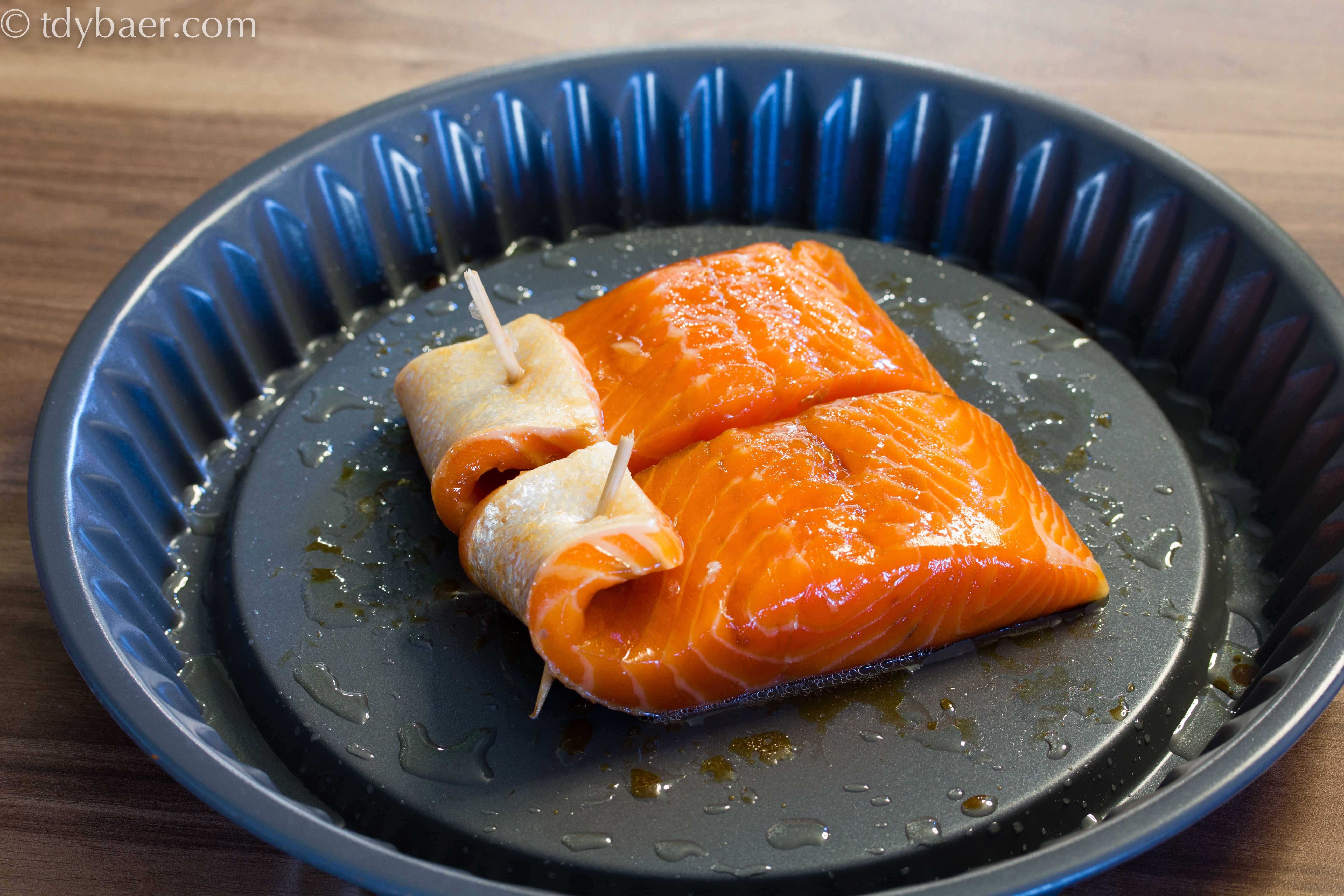 Den Backofen auf 230° (Ober-/Unterhitze) vorheizen und den Lachs auf einer geeigneten Backofenform platzieren. Diese beiden Stücke Lachs haben wir 15 Minuten auf der mittleren Schiene gar werden lassen. In der Zeit 2-3 mal mit der Teriyaki-Sauce einstreichen.