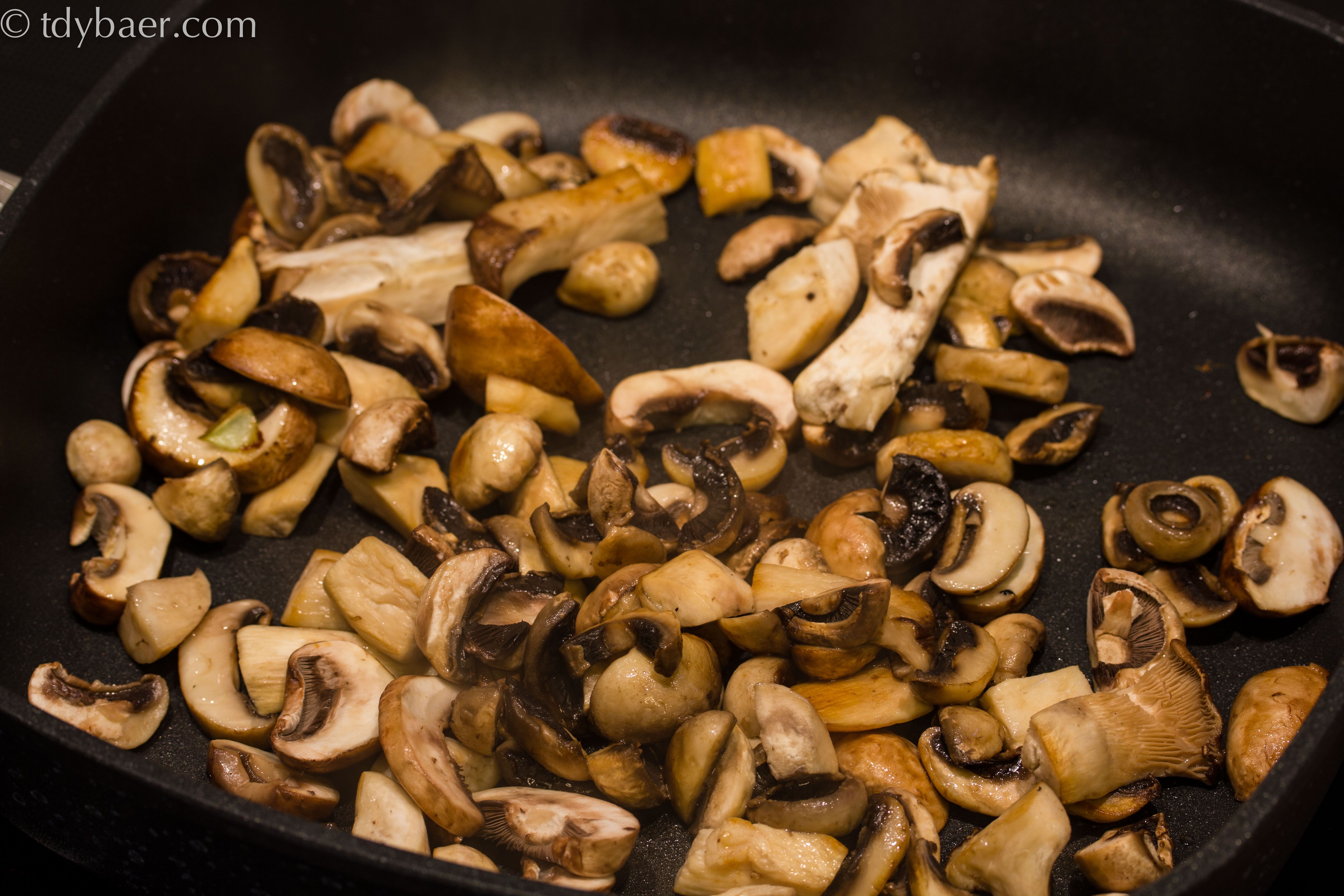 Den Lauch aus der Pfanne nehmen und abdecken. Weitere 3 El Öl in der Pfanne heiß werden lassen und die Pilze anbraten, bis sie die gewünschte Konsistenz haben. Salzen und Pfeffern nicht vergessen :-).