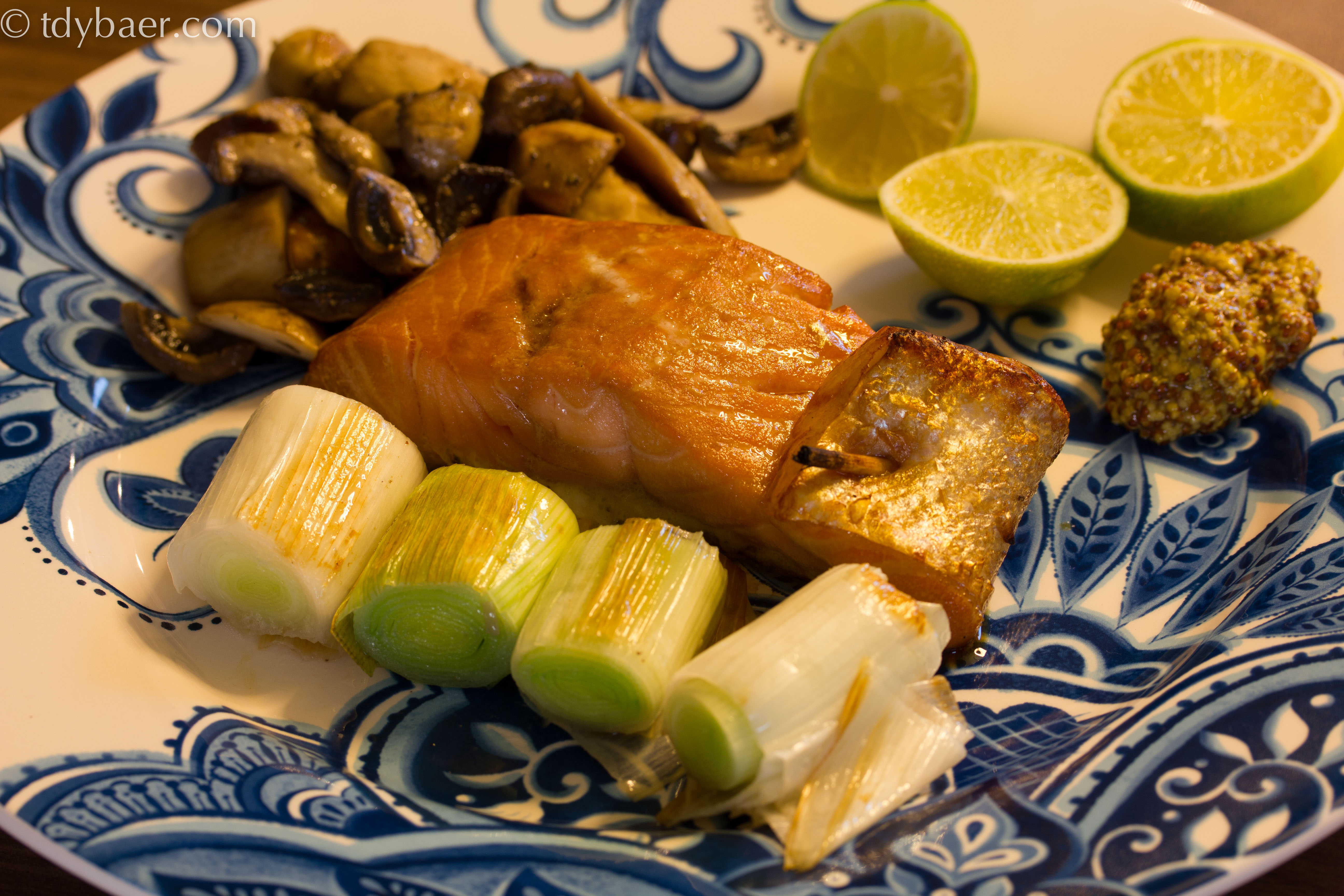 Und schon ist dieses leckere Essen fertig :-). Nun nur noch den Lachs, die Pilze und den Lauch zusammen mit einem Klecks Senf und Limettenscheiben dekorativ anrichten und genießen.