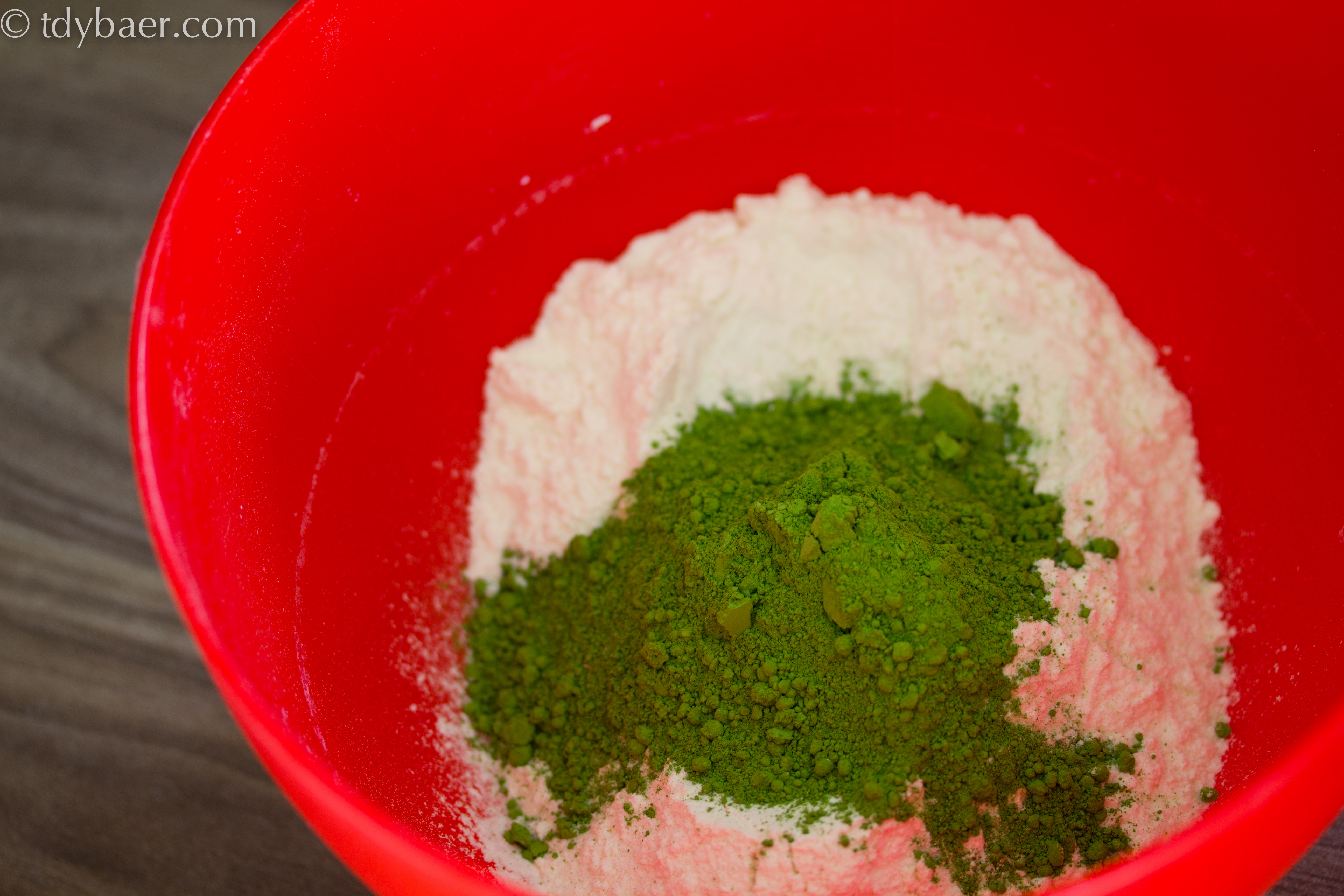 Die Farbe ist einfach so schön grün :-). In einer kleinen Schüssel das Mehl, Backpulver und Matcha vermischen.
