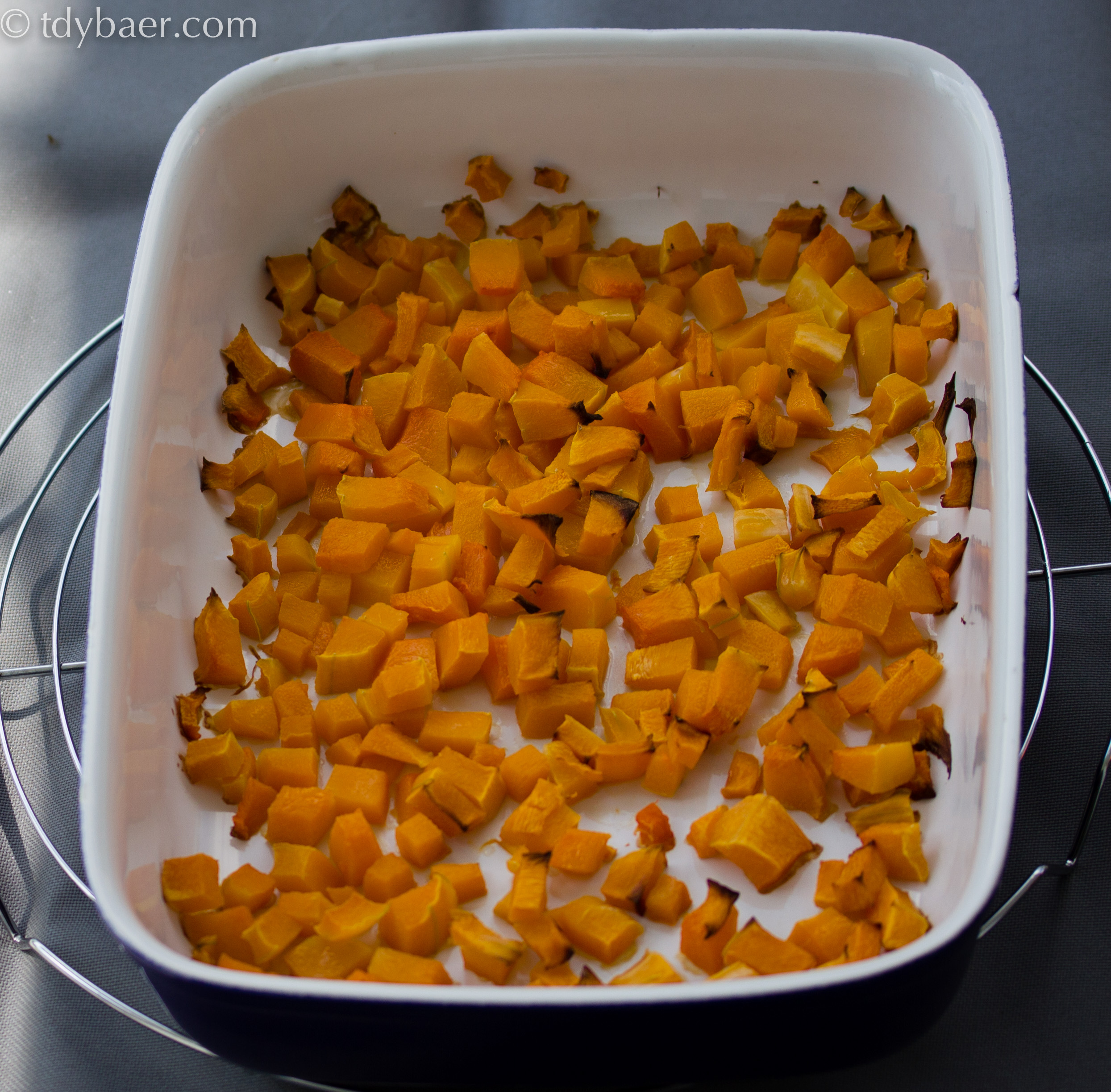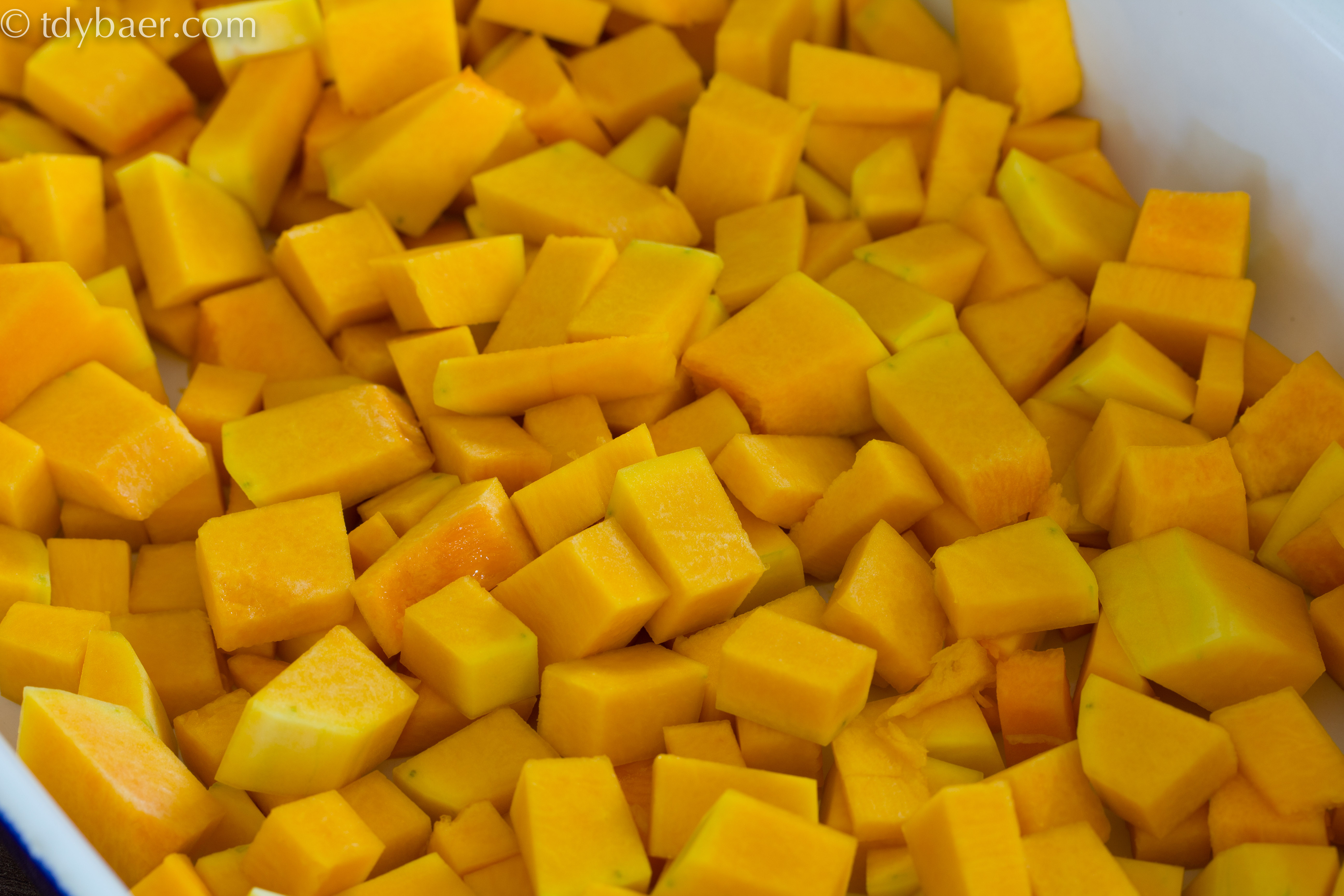 Benötigt werden etwa 500 g Kürbisfleisch. Im Backofen werden die Kürbiswürfel jetzt 50 – 60 Minuten gegart. Danach auskühlen lassen.
