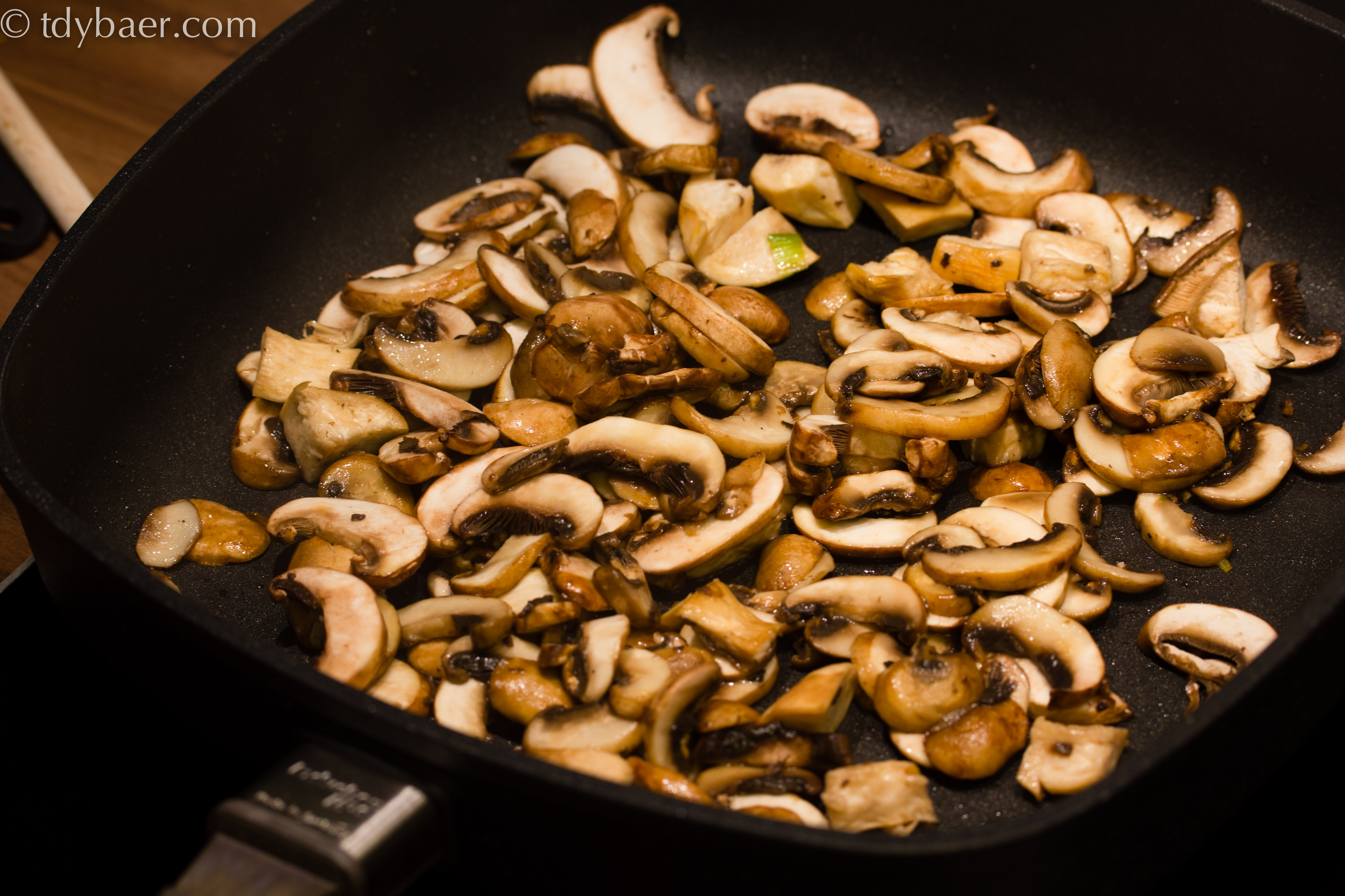 Die Pilze in Scheiben schneiden. In einer heißen Pfanne die restlichen 20 g Butter und 1 El Öl erhitzen und die Pilze 2-3 Minuten scharf anbraten. Knoblauch und Schalotten dazugeben und kurz mitbraten. Danach die Kräuter untermischen und mit Salz und Pfeffer abschmecken.