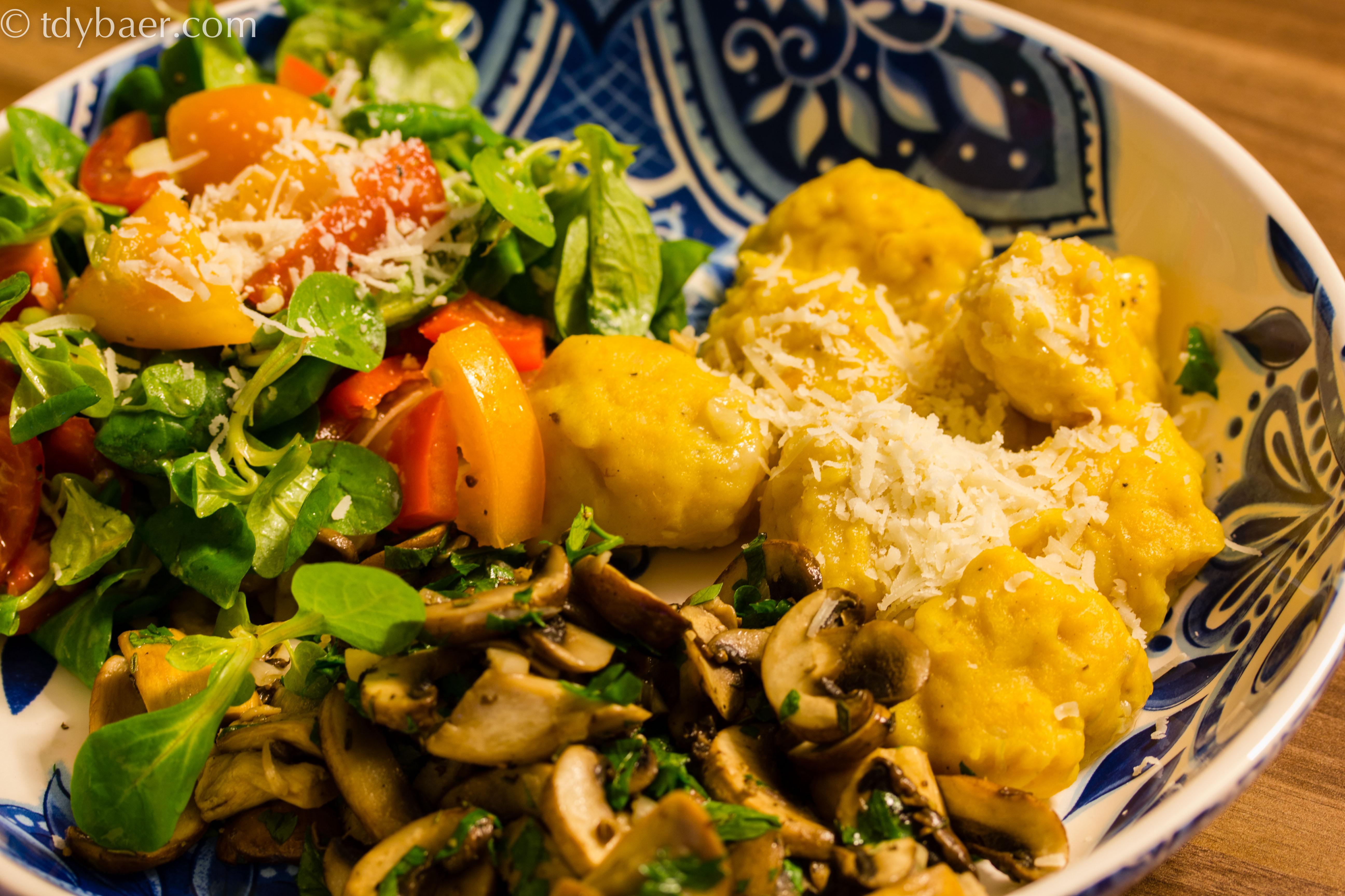 Die Gnocchis und die Pilze zusammen mit dem Salat anrichten und etwas geriebenen Parmesan darüber streuen. Guten Appetit!