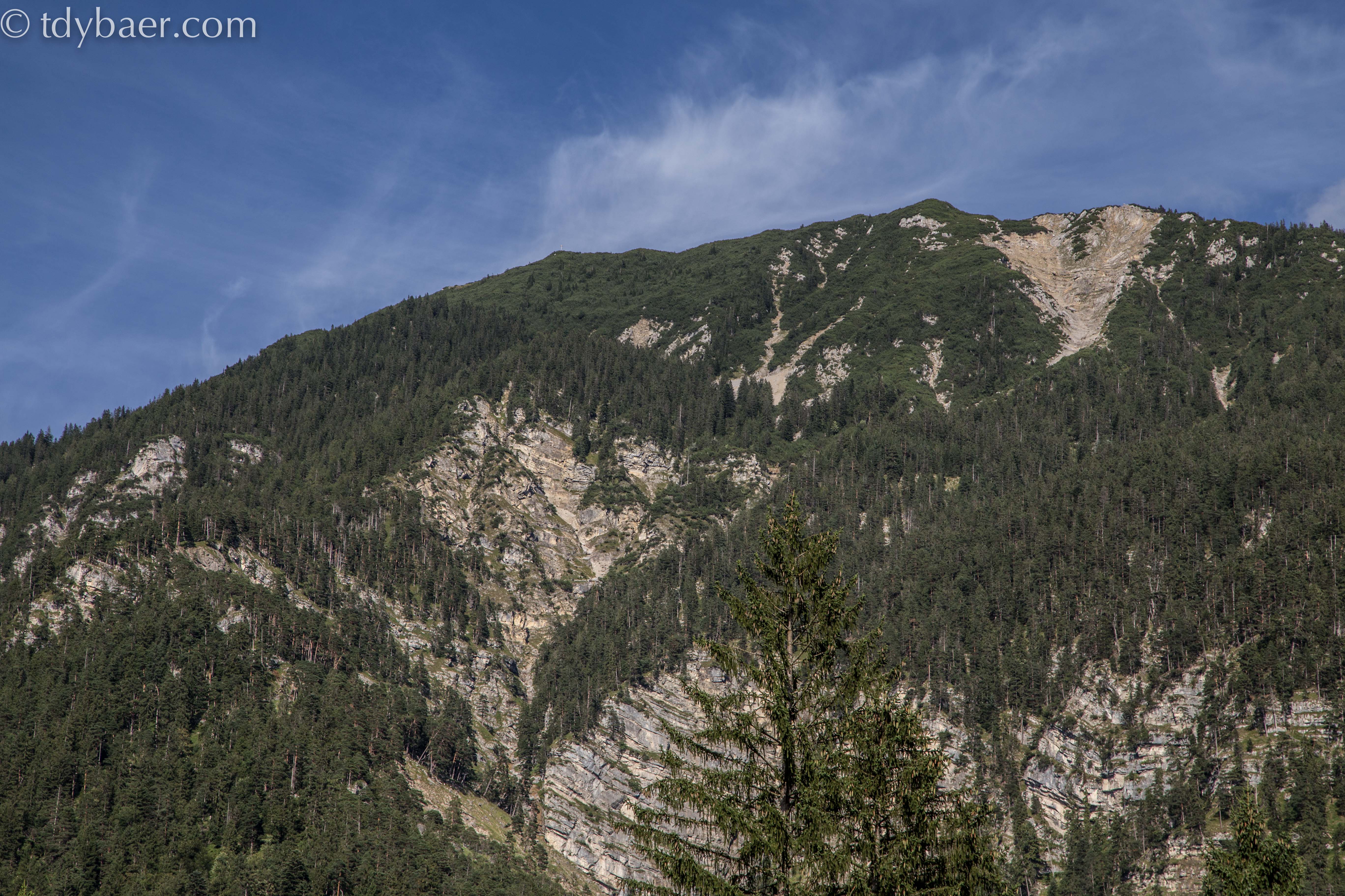 Noch ein letzter Blick auf die Soiernspitze bevor sie hinter den Bäumen verschwindet. Durch den Wald, über einen steilen Forstweg und wieder durch den Wald und über Wiesen …