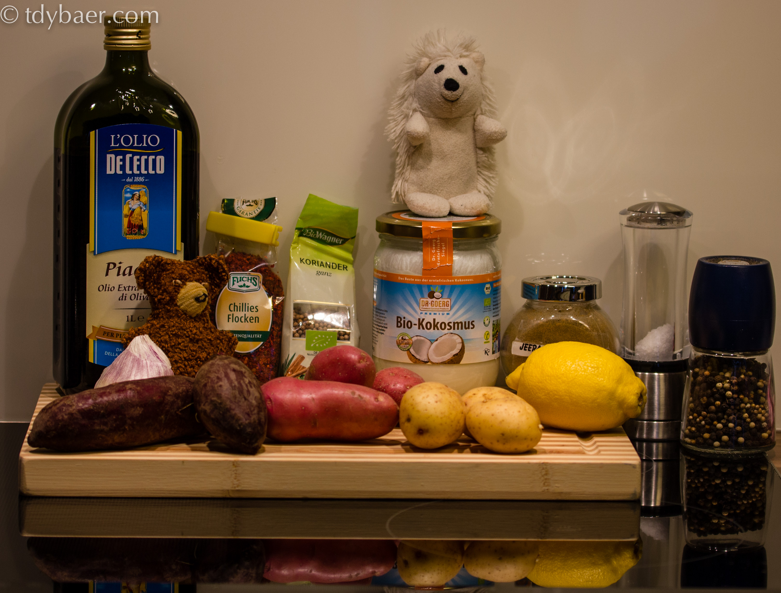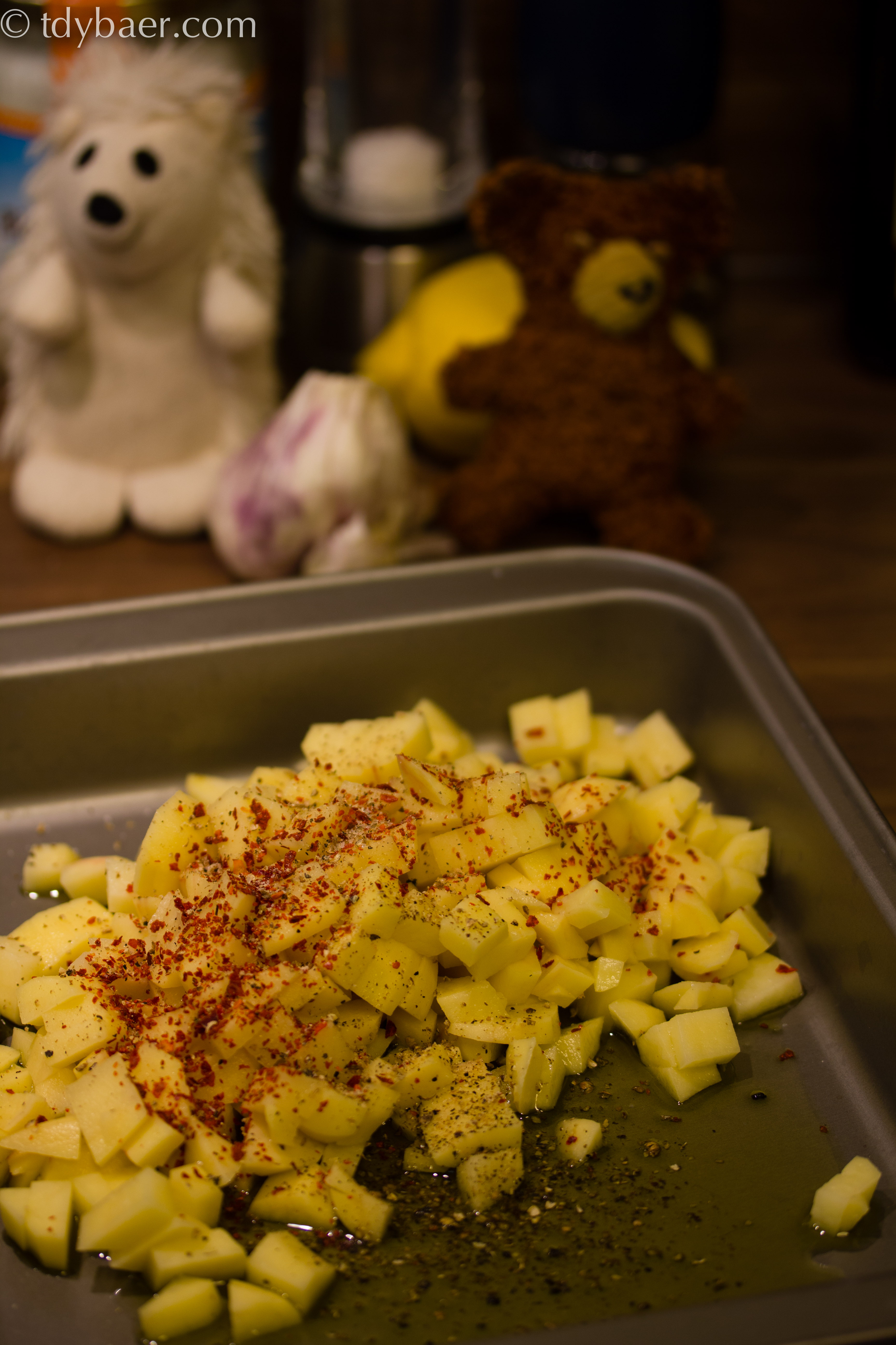 In der Zwischenzeit kann man auch schon die gewürfelten Kartoffeln mit Olivenöl und den Gewürzen vermengen und in einer feuerfesten Form im Ofen knusprig garen. Je nach Wunsch so 30 bis 45 Minuten bei 200°.