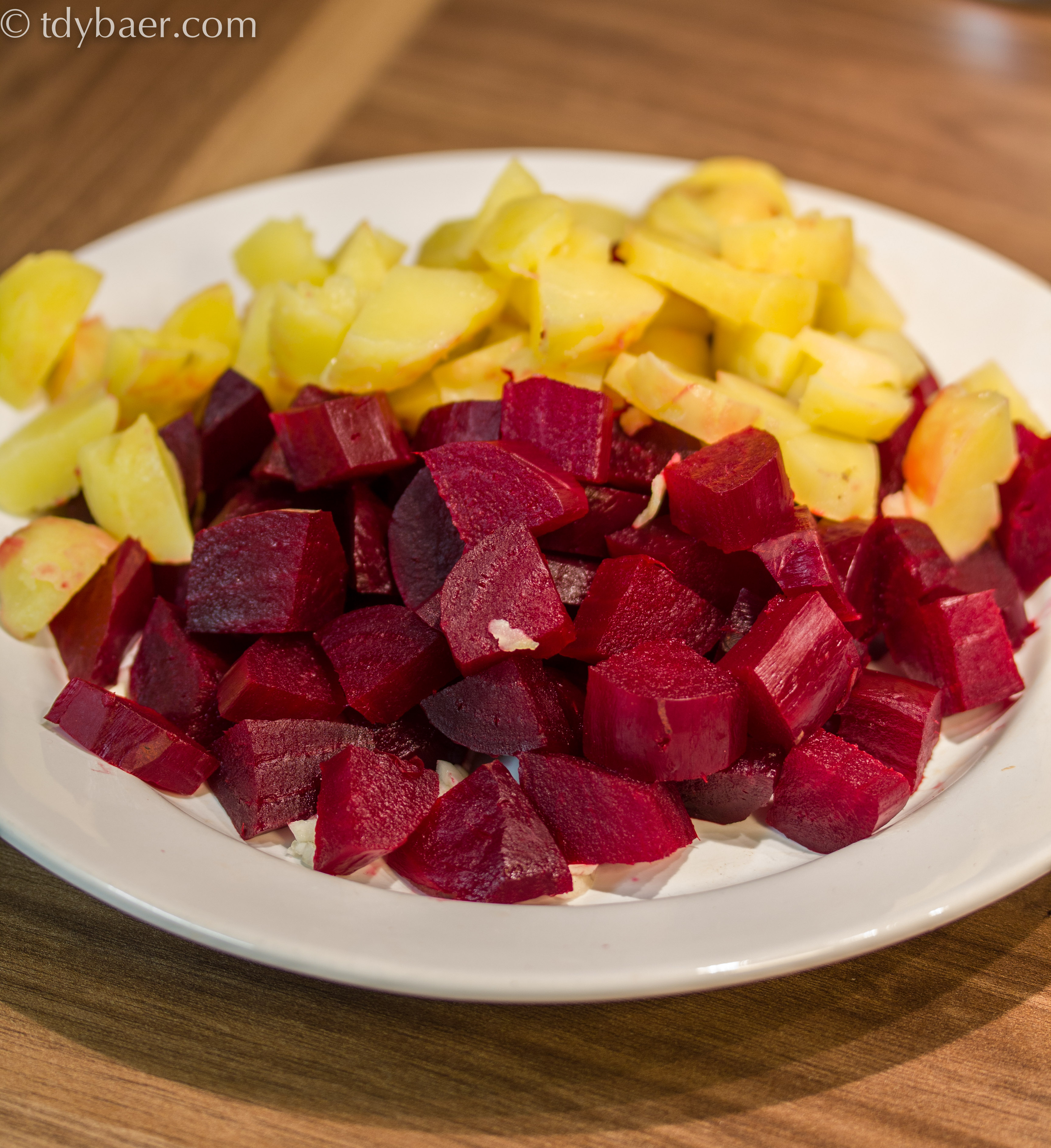 Wenn die Knollen weich gekocht sind, das Wasser abgießen und abschrecken und ausdampfen lassen. Zum Schälen der roten Beete am Besten Einmalhandschuhe anziehen. Die Kartoffeln auch pellen und ebenfalls grob würfeln.