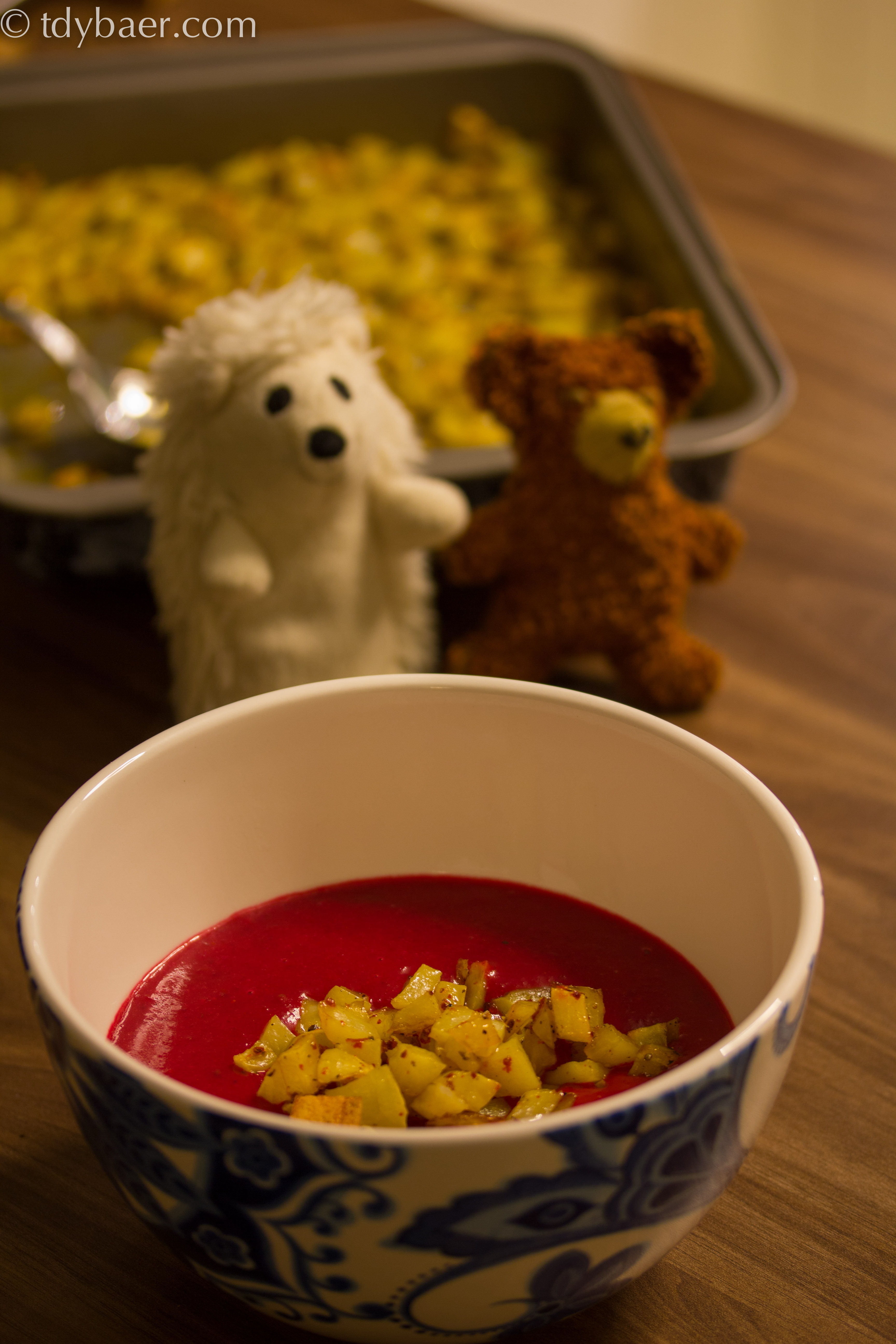 Herbstzeit ist Knollenzeit :-). Neben Pastinake und Süßkartoffel esse ich auch gerne rote Beete, bisher allerdings nur aus dem Einweckglas. Aber das hat sich seit diesem leckeren Süppchen geändert. Die Farbe ist ja für sich alleine schon ein Hit – abgeschmeckt mit Kokosmilch und garniert mit ein paar gerösteten Kartoffelwürfeln kann hier niemand widerstehen.