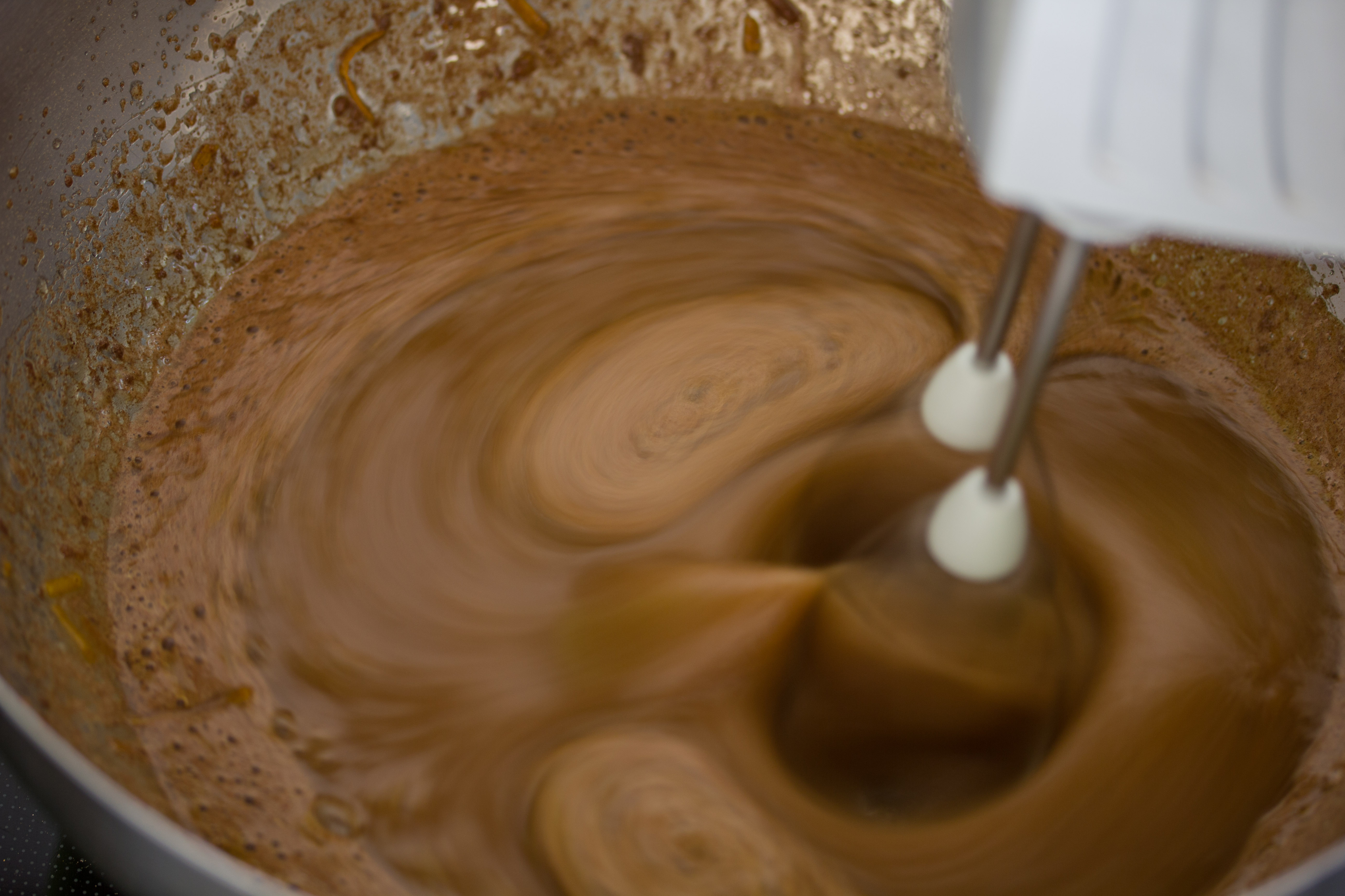 In einer großen Schüssel verrührt man danach die zwei Eier mit den Orangenschalen, Zimt und dem Lebkuchengewürz. Nun die Honig-Butter-Masse dazu geben und noch mal kräftig durchmixen.