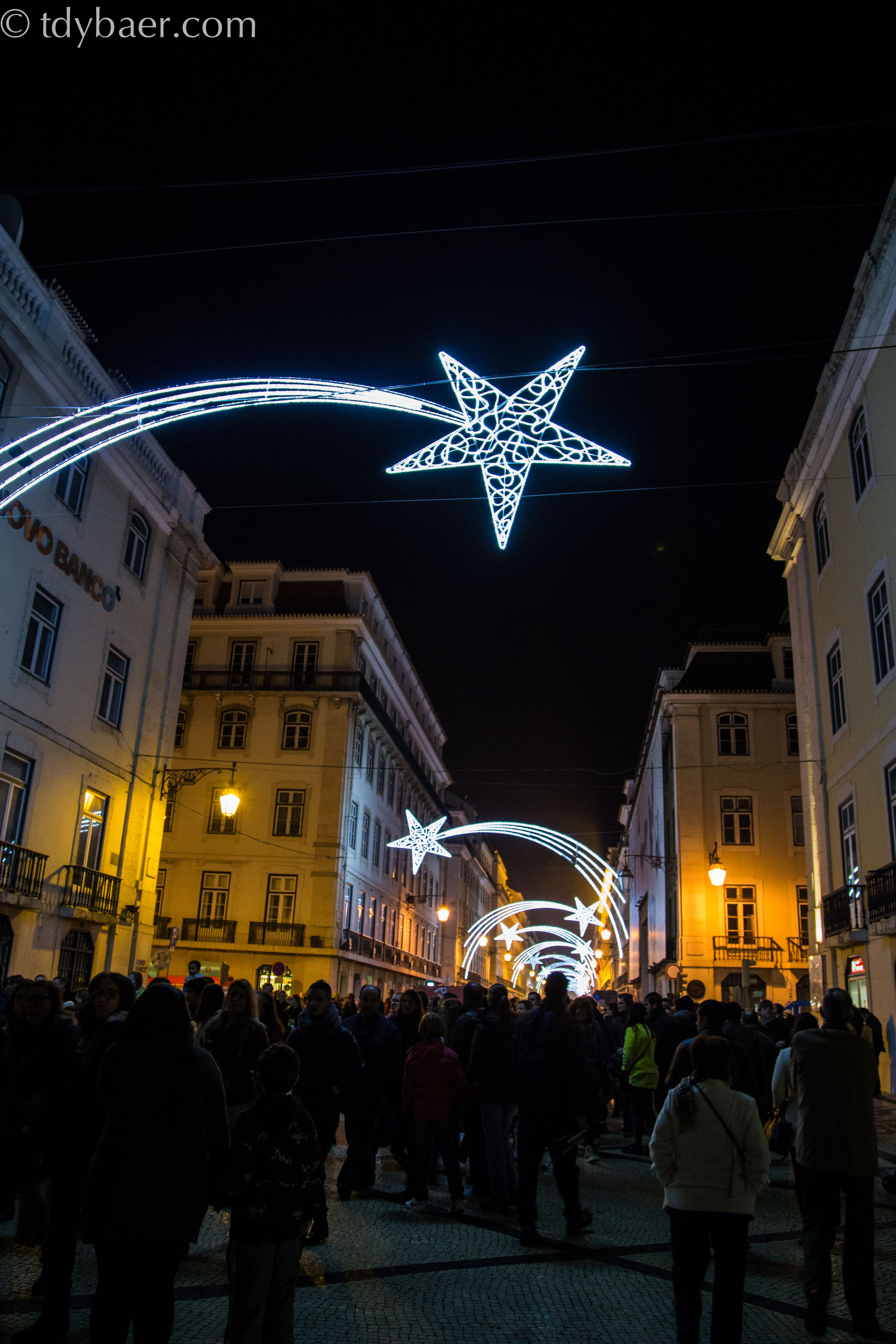 Danach spazierten wir satt und glücklich zurück ans Wasser zum „Praca do Comercio“. Hier waren jede Menge Leute unterwegs und fotografierten sich vor dem hübschen Tannenbaum aus LED-Lichtern, wir ebenso.
