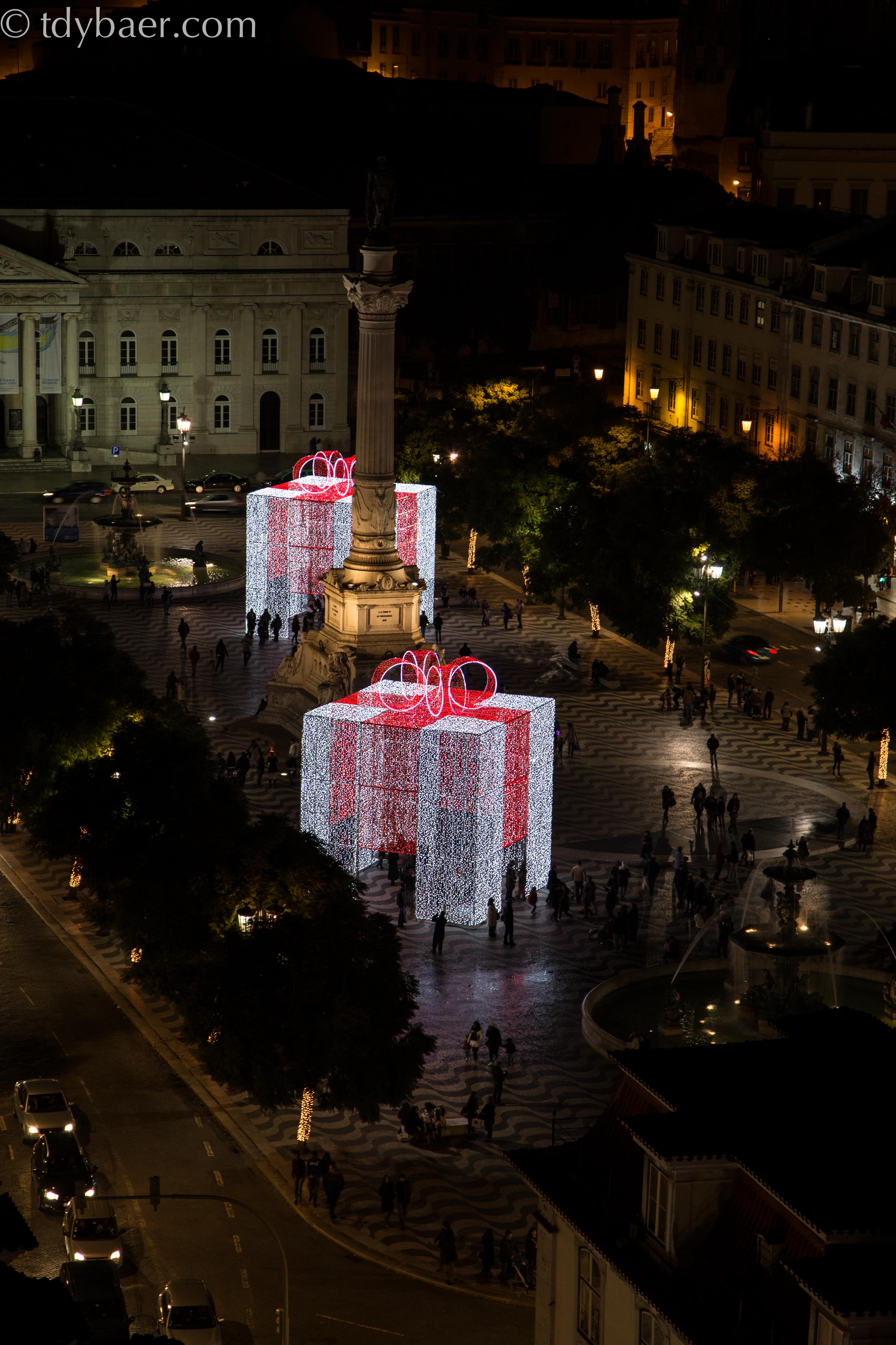 Direkt in der Innenstadt befindet sich der berühmte Aufzug „Santa Justa“. Auf die Plattform gelangten wir in diesem Fall allerdings zu Fuß, da der Aufzug bereits geschlossen war. Heute Mittag hatten wir uns schon gefragt was diese Gestelle am „Praca Dom Pedro IV“ für einen Zweck erfüllen sollten, im Dunkeln staunten wir jetzt nicht schlecht. Zwei riesige Geschenk-Würfel :-), wirklich eine tolle Idee.