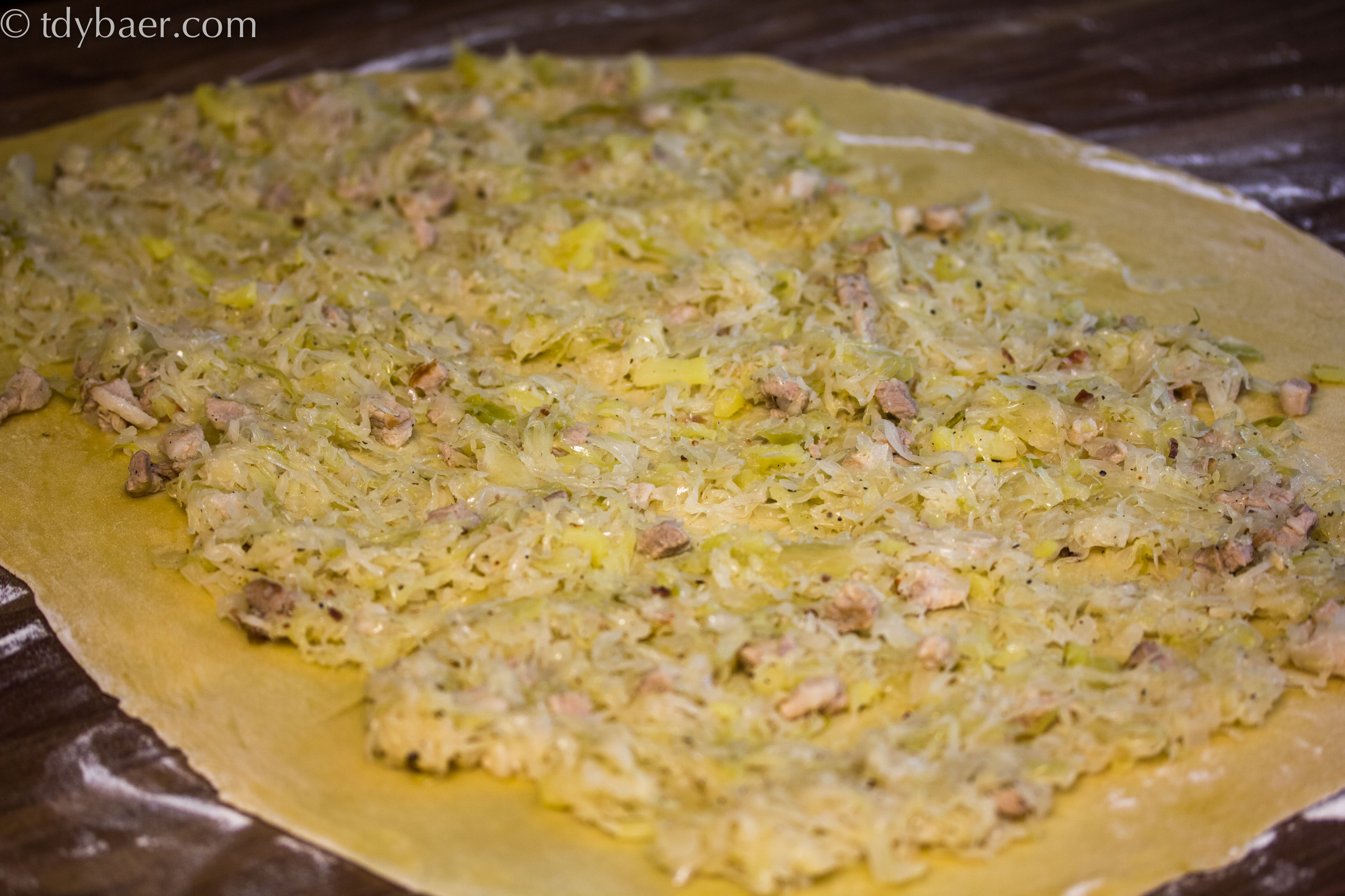 Nun die Sauerkrautmischung auf dem Teig verteilen und einen Rand an allen Seiten frei lassen und diesem mit Wasser befeuchten.