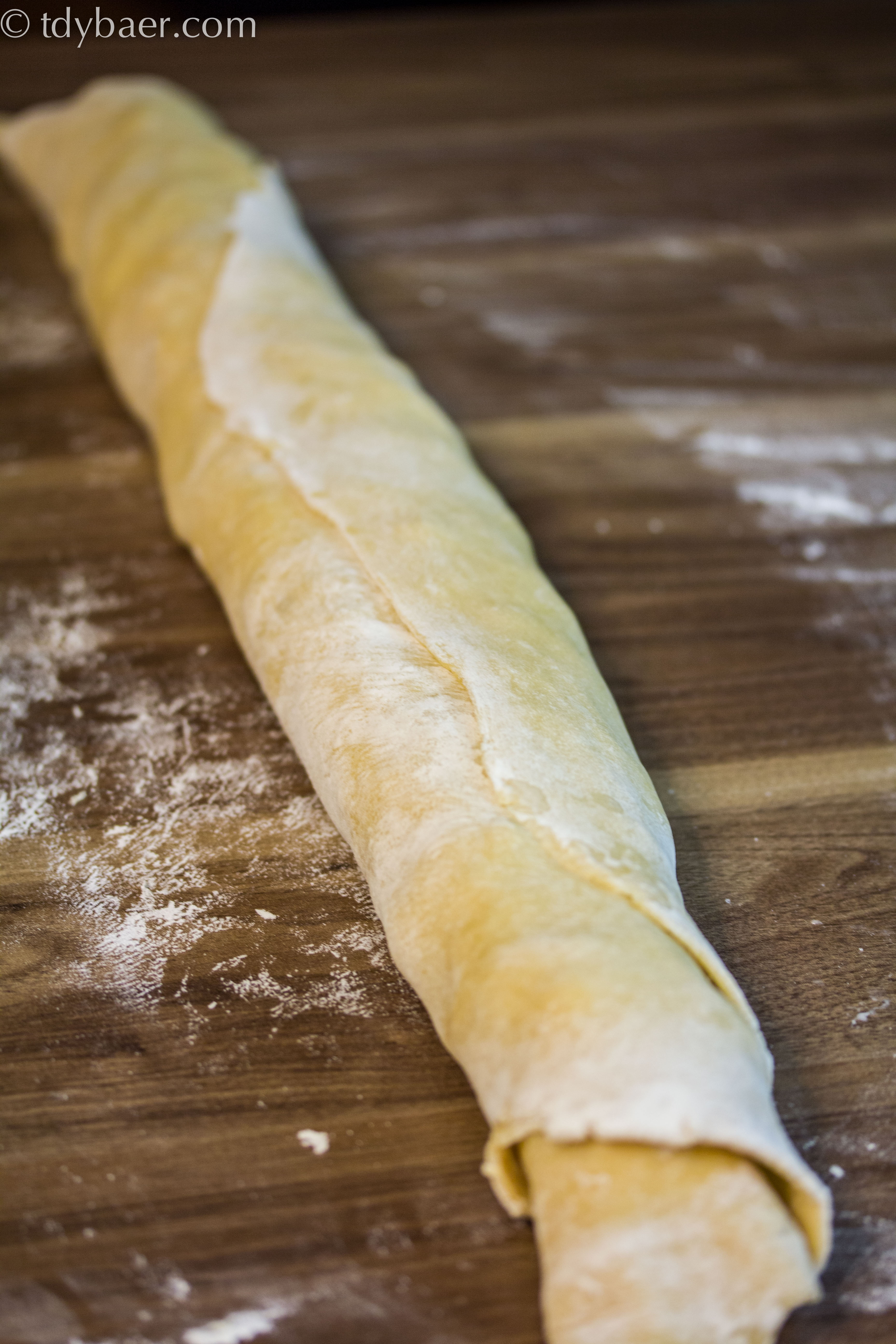 Anschließend längsseitig aufrollen und von der Rolle mit einem scharfen Messer etwa 4 cm breite Stücke abschneiden.