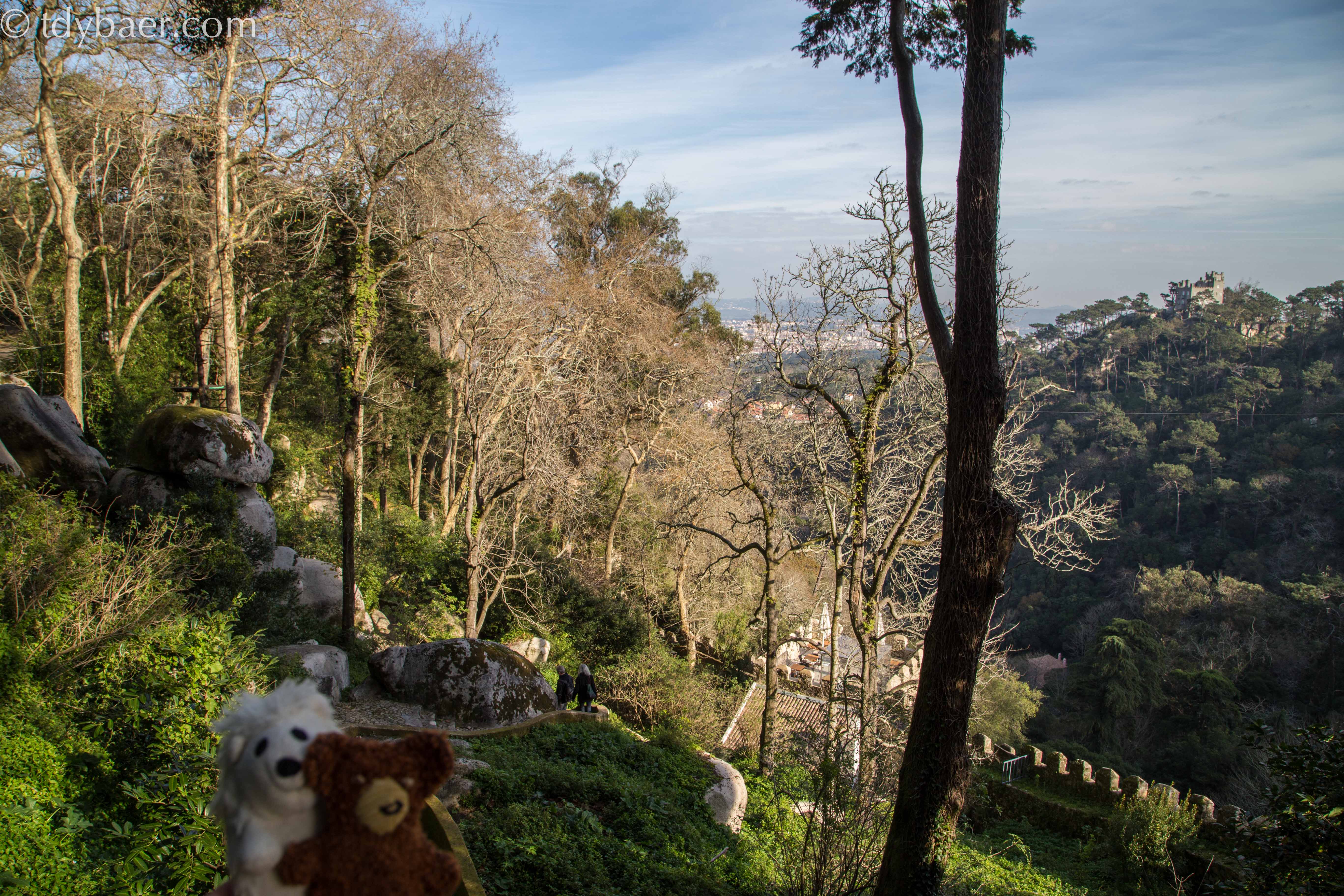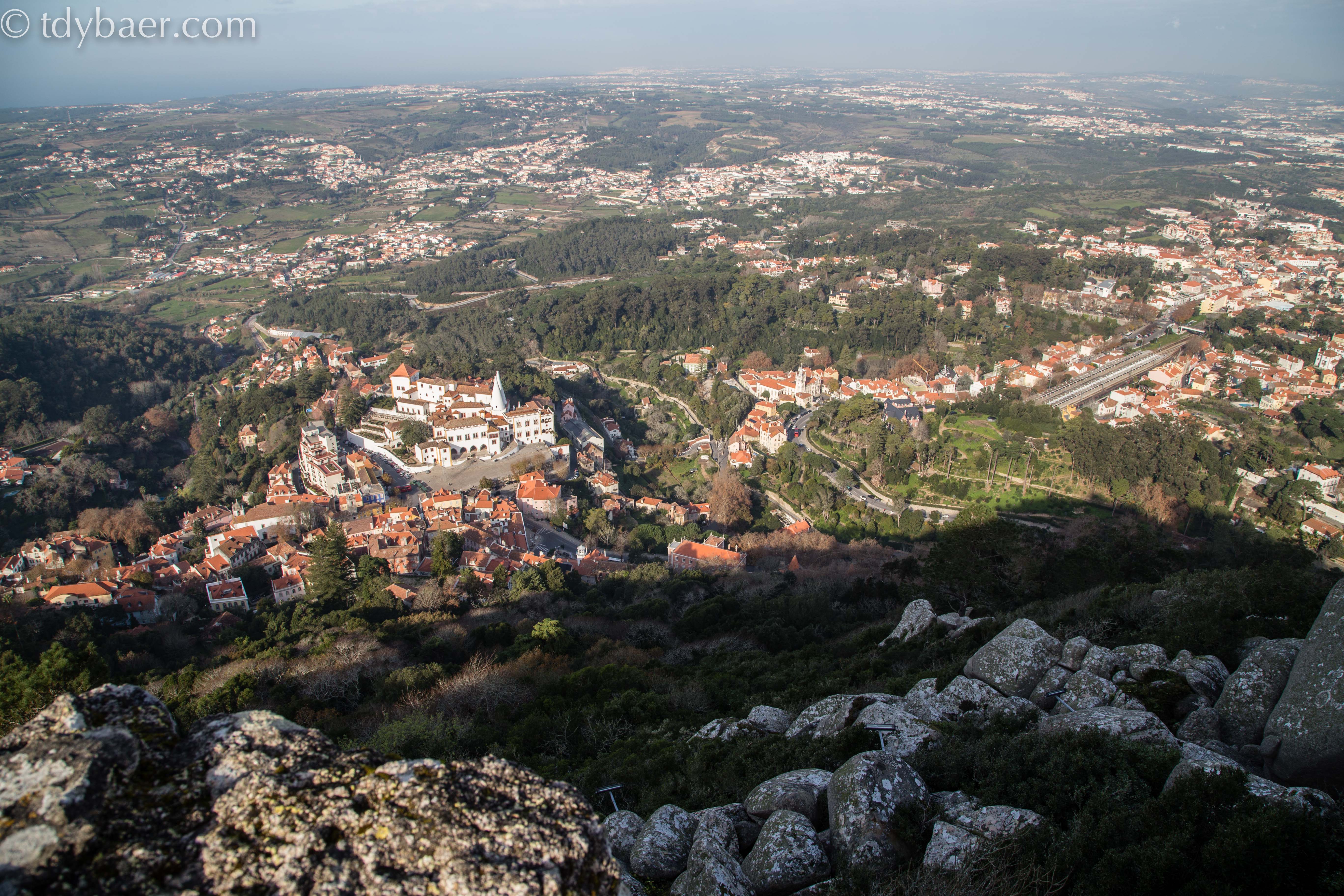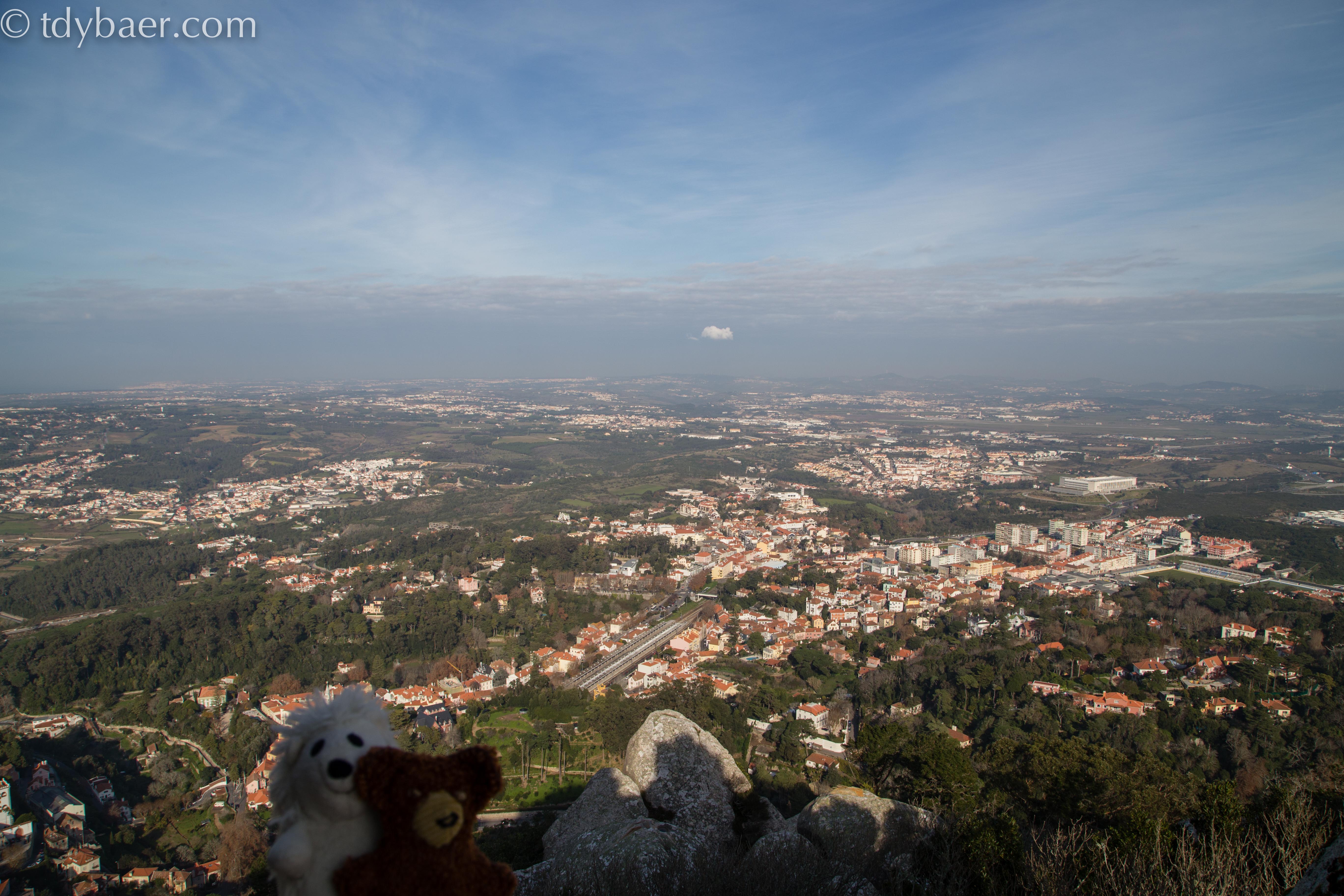 Hier schaut man hinunter auf die Stadt Sintra, gut erkennbar an den zwei spitzen weißen Türmen des Palastes.