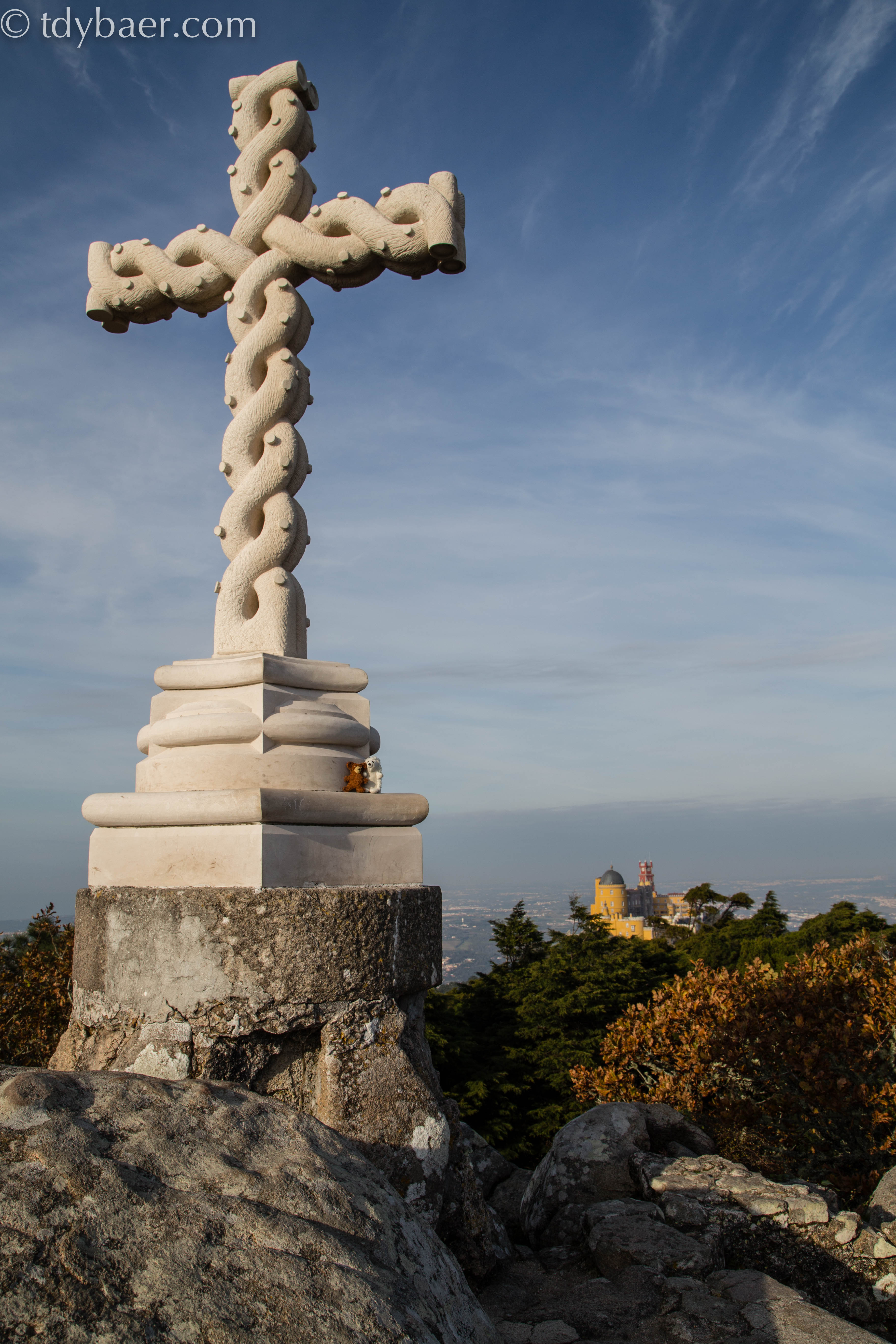 Gleich gegenüber von Moorish Castle liegt die große Parkanlage und der ‚Palast von Pena‘ (Parque e Palacio da Pena). Da es schon etwas spät am Nachmittag war, spazierten wir im Schnellschritt auf den Aussichtspunkt ‚Hohes Kreuz‘ in der Parkanlage von Pena. Das Kreuz markiert zu dem den höchsten Punkt des Sintragebirges auf 592 m, an dessen Stelle bereits im 16. Jahrhundert im Auftrag von König Joao III ein Kreuz errichtet wurde.