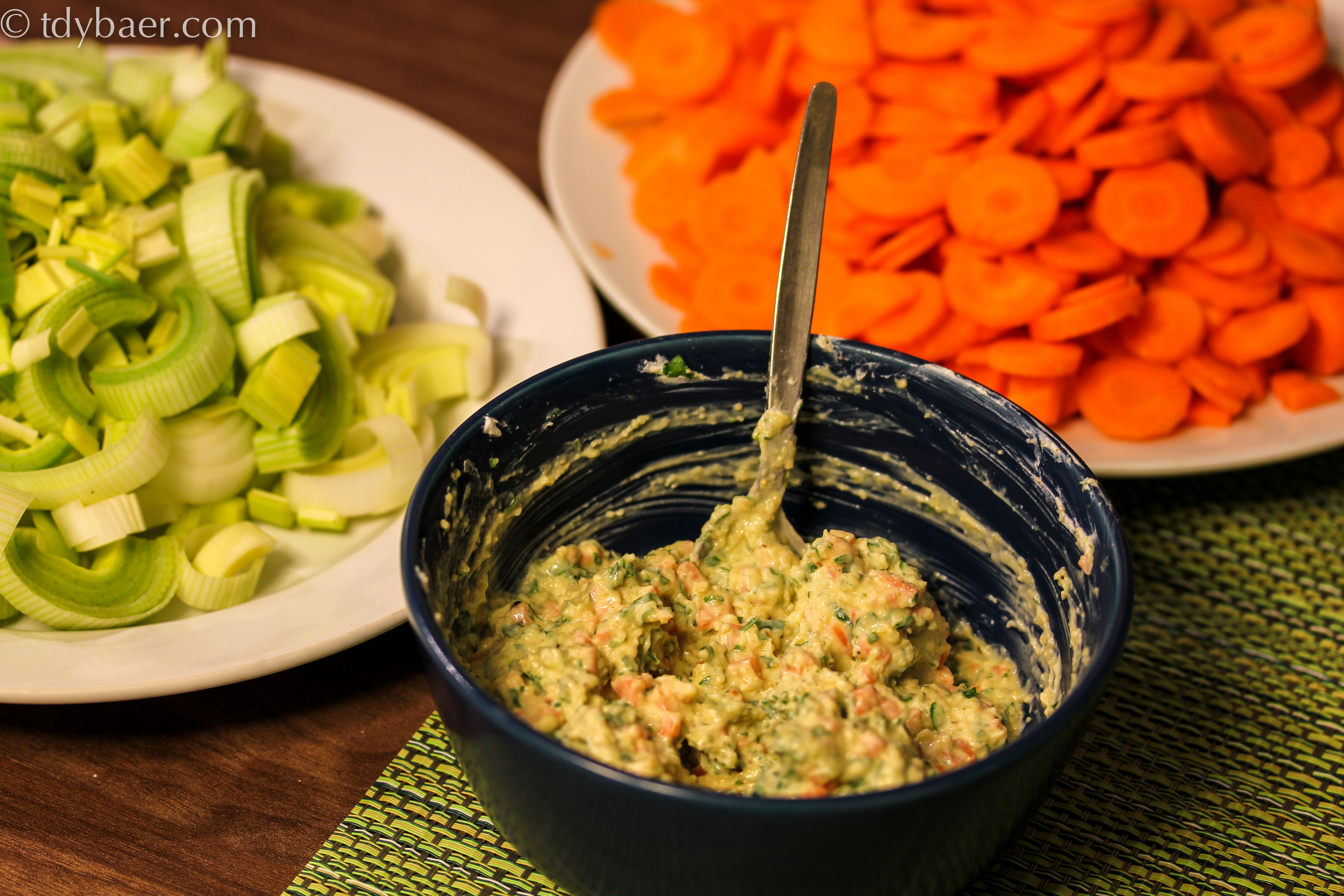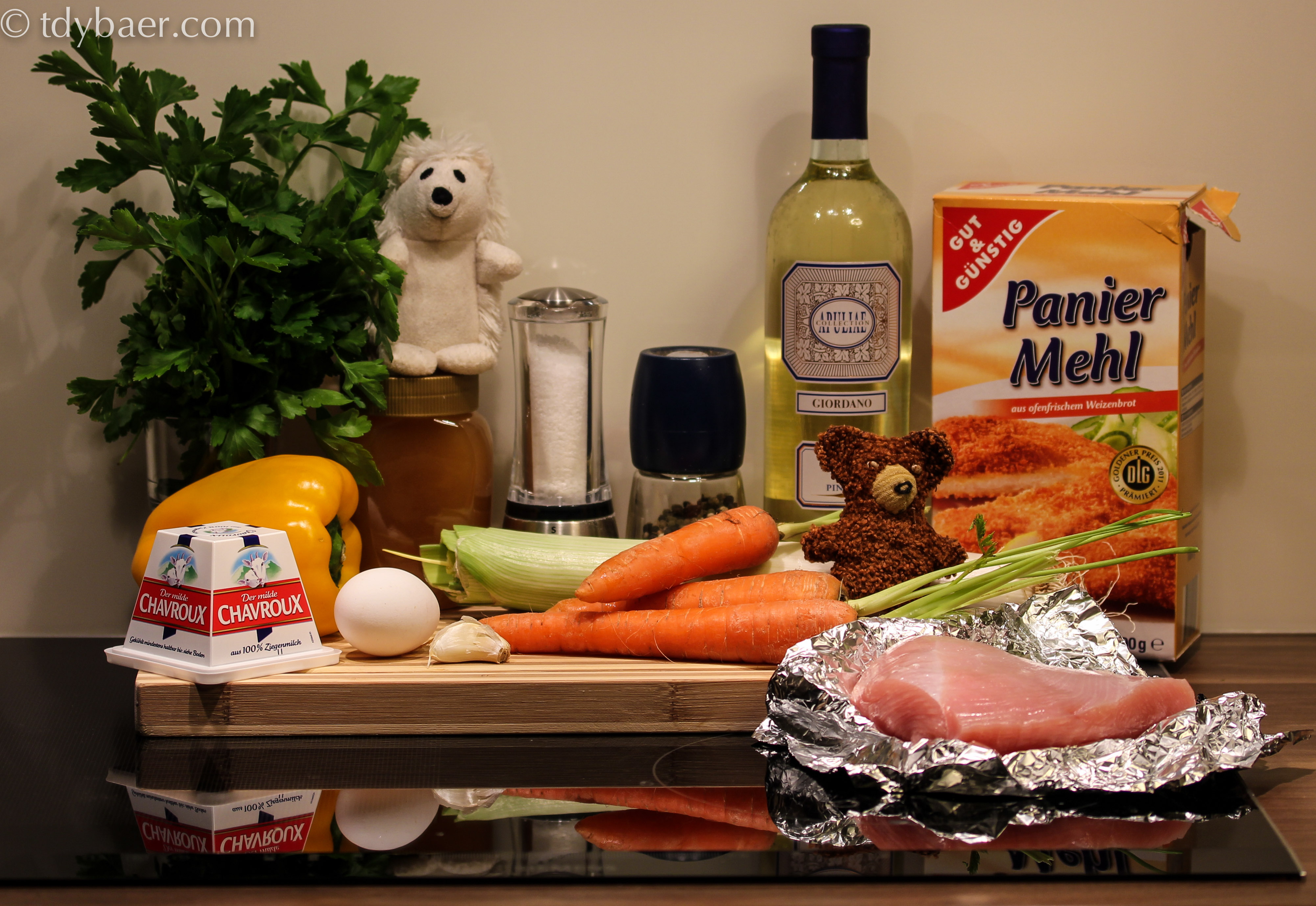 Für die Füllung der Rouladen vermengt man den Ziegenfrischkäse mit den Möhrenwürfel, 1 Tl Honig, dem Eigelb, Semmelbröseln und 1 El Petersilie. Alles gut verrühren und mit Salz abschmecken. 5 Minuten stehen lassen.