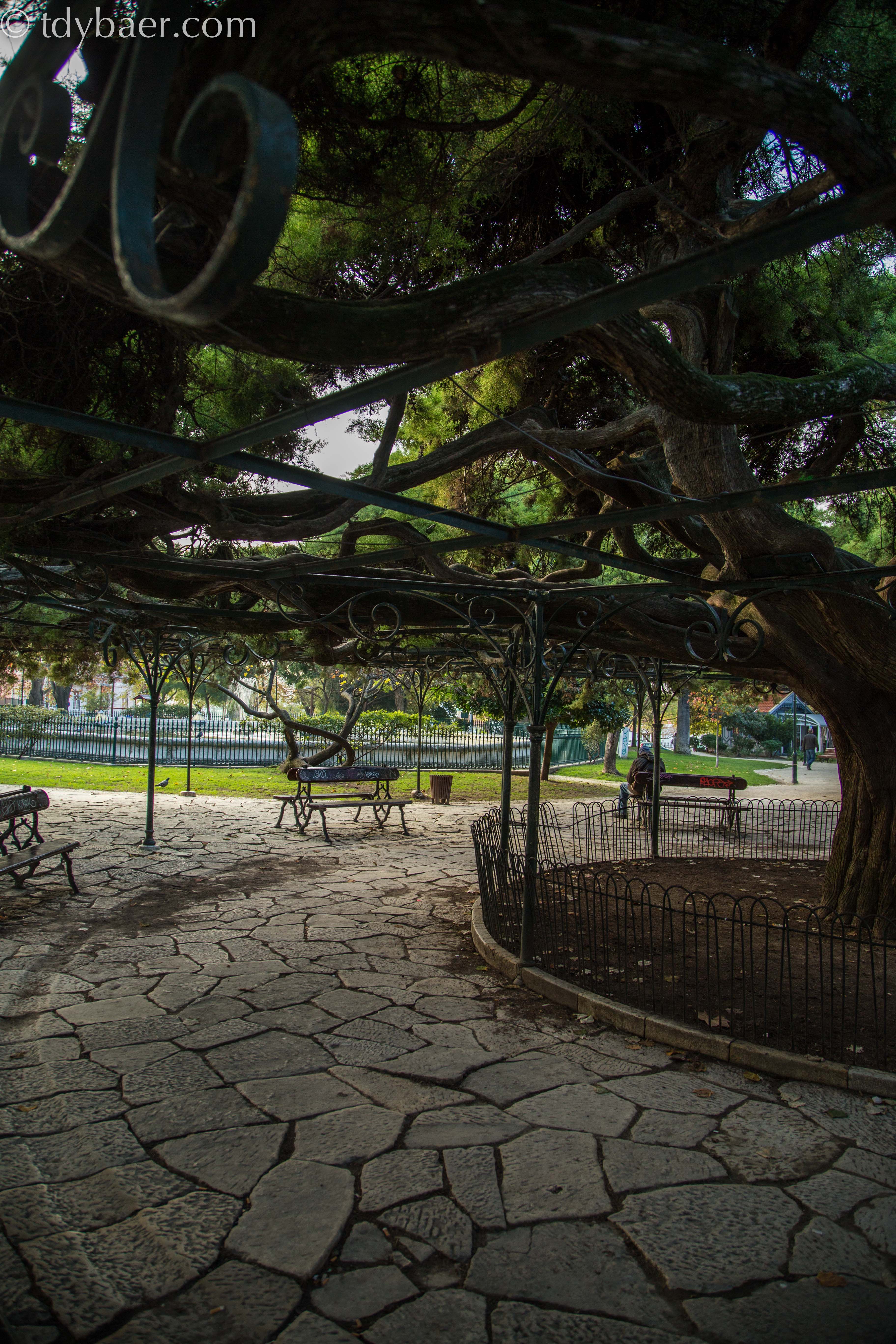Am nördlichen Ende der Rua do Seculo befindet sich der kleine Park Jardim do Principe Real. Der Park existiert bereits seit Mitte des 19. Jahrhunderts und ist typisch für die Gartengestaltung der damaligen Zeit. Durch Handelskontakte nach Brasilien wurde die Gestaltung beeinflusst. So findet man hier Gehölze wie Jacarandas, Gummibäume oder auch Bananenstauden. Für diesen knorrigen alten schönen Baum wurde ein interessanten Stützkonstrukt errichtet. Im Sommer sicher ein beliebter Ort :-).