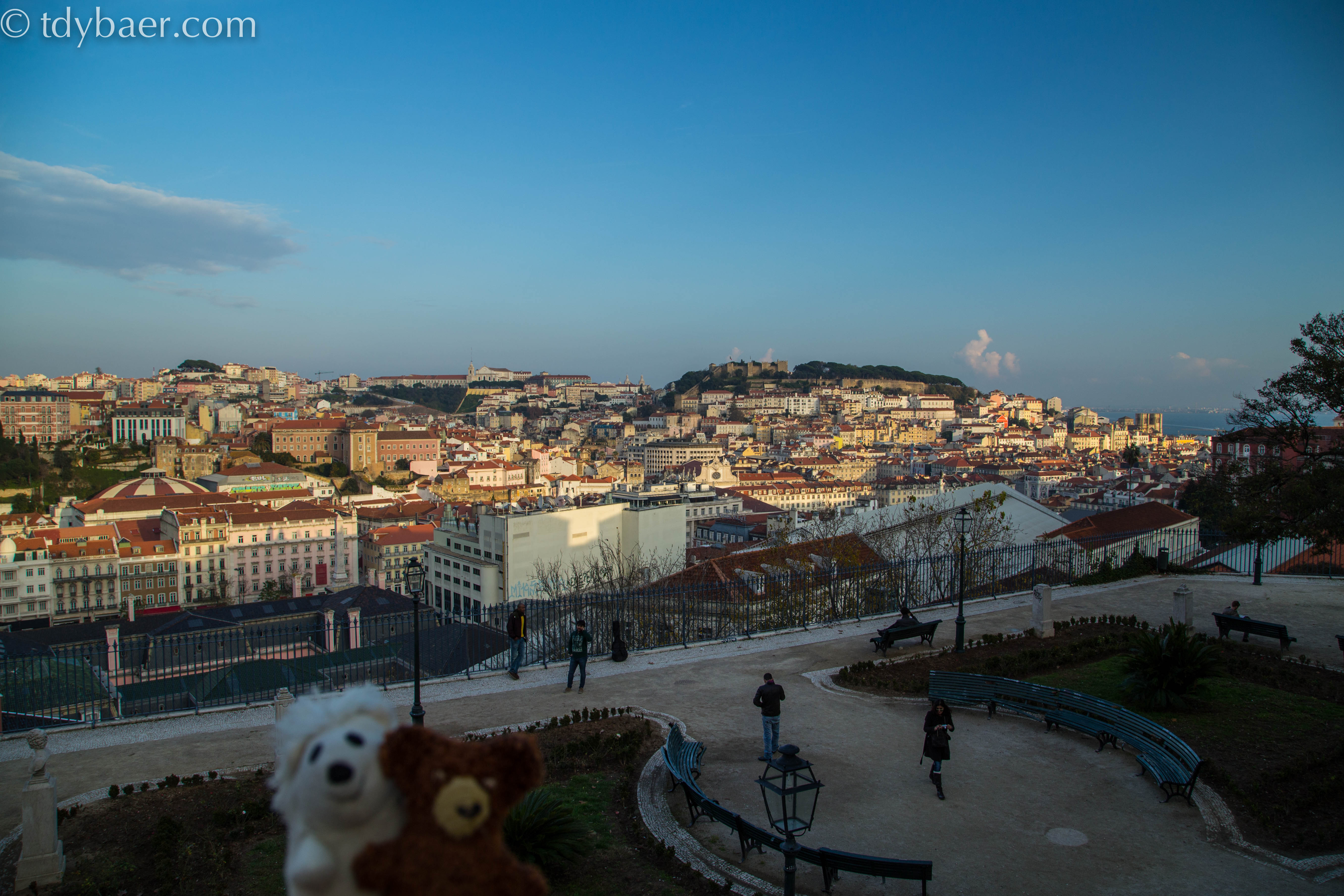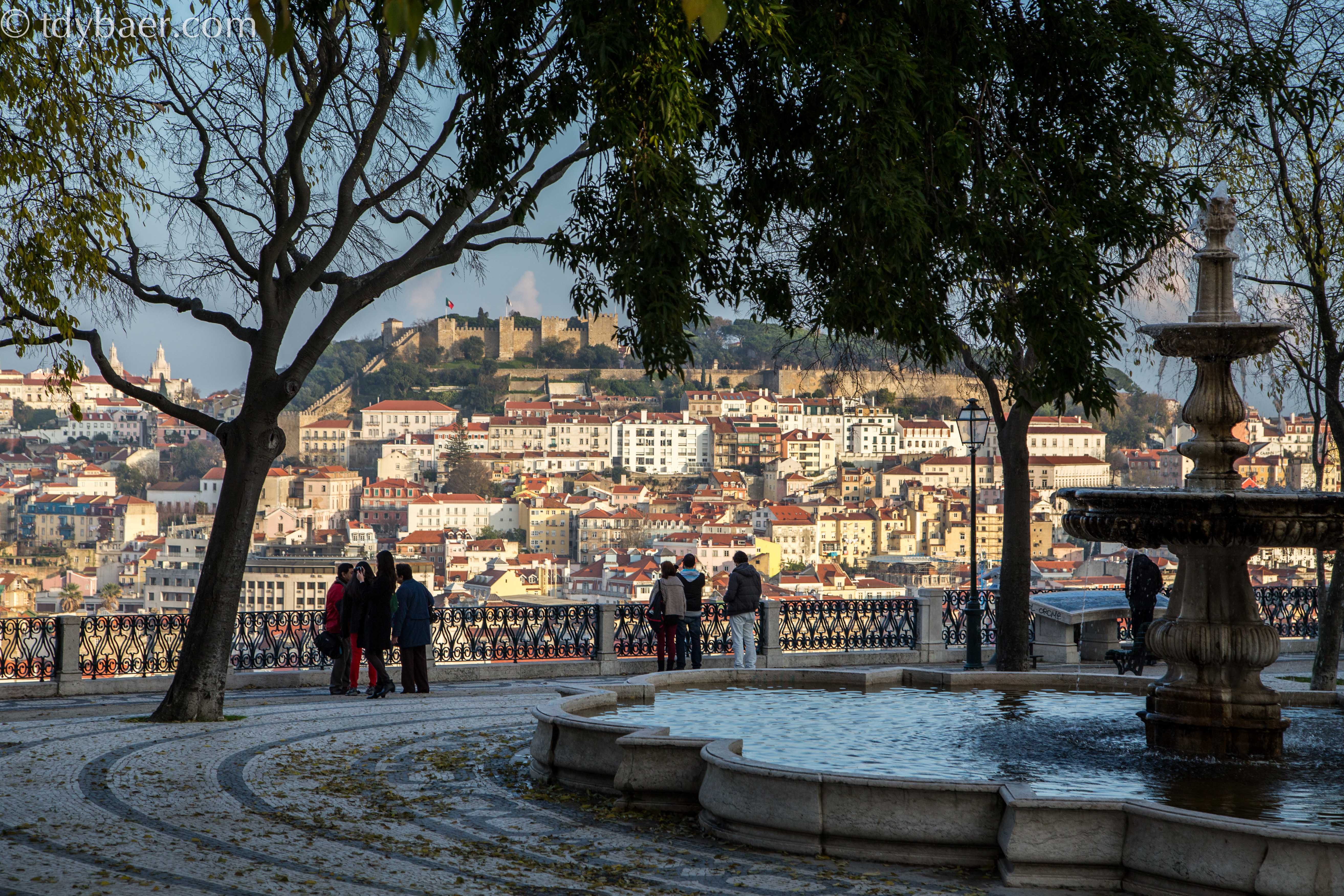 Wir folgten vom Park aus der Rua Dom Pedro V Richtung Süden und erreichten nach wenigen Schritten die berühmte Aussichtsterrasse Miradouro Sao Pedro de Alcantara mit dem schönen Blick auf die Burg und die Innenstadt von Lissabon.