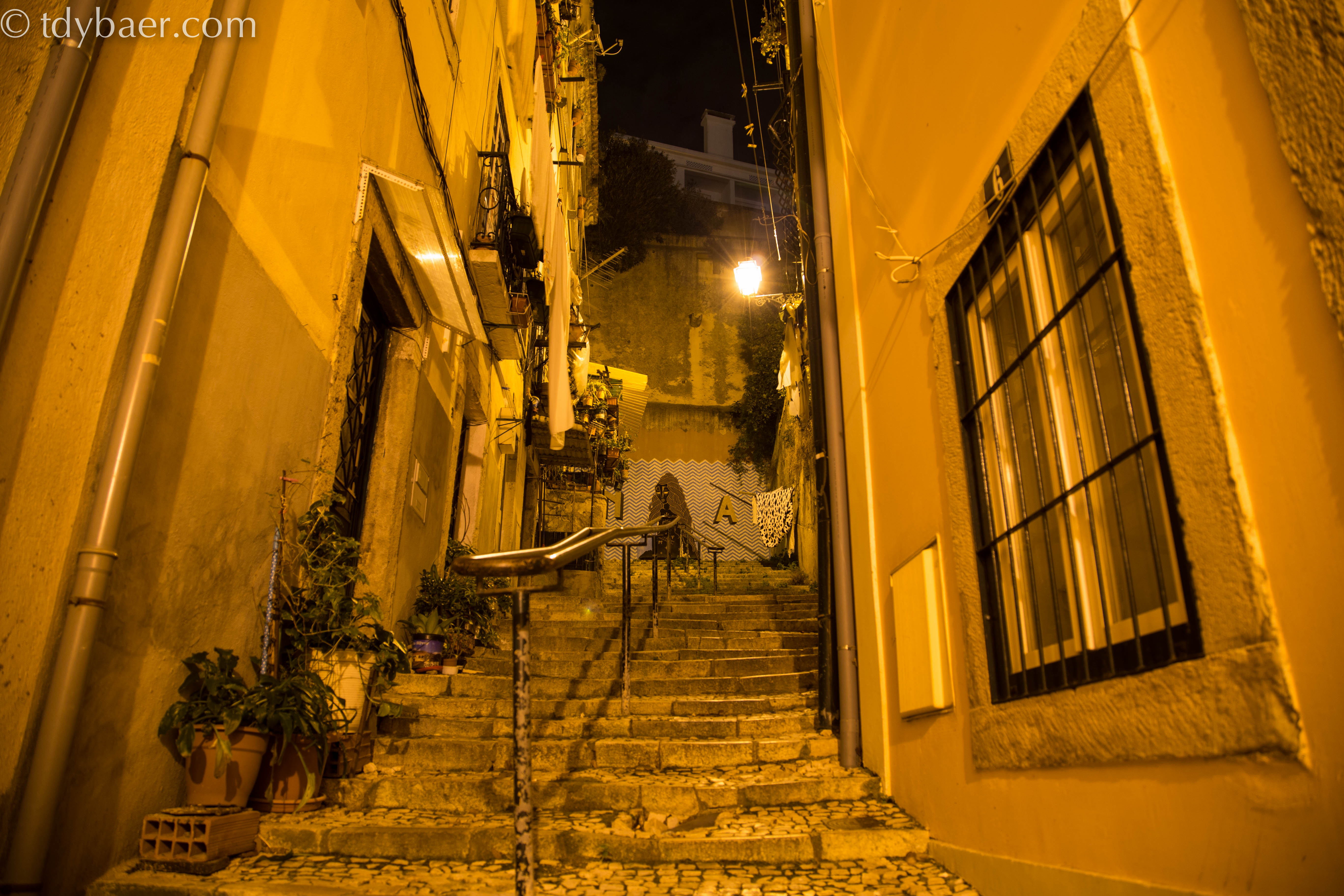 Ein paar Momente später war die Sonne auch schon weg. Wir machten uns auf den Weg zum Hostel um etwas zu verschnaufen und die Beine hoch zu legen, denn heute Abend wollten wir auch noch einmal los. Auf dem Plan stand eine Tour durch Mouraria und hinauf nach Graca. Nach Einbruch der Dunkelheit machten wir uns auf den Weg.
